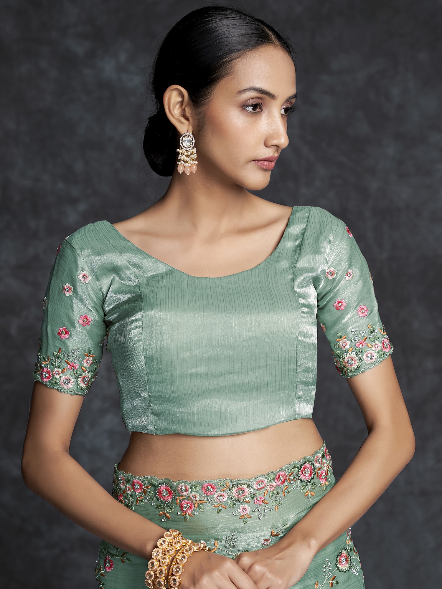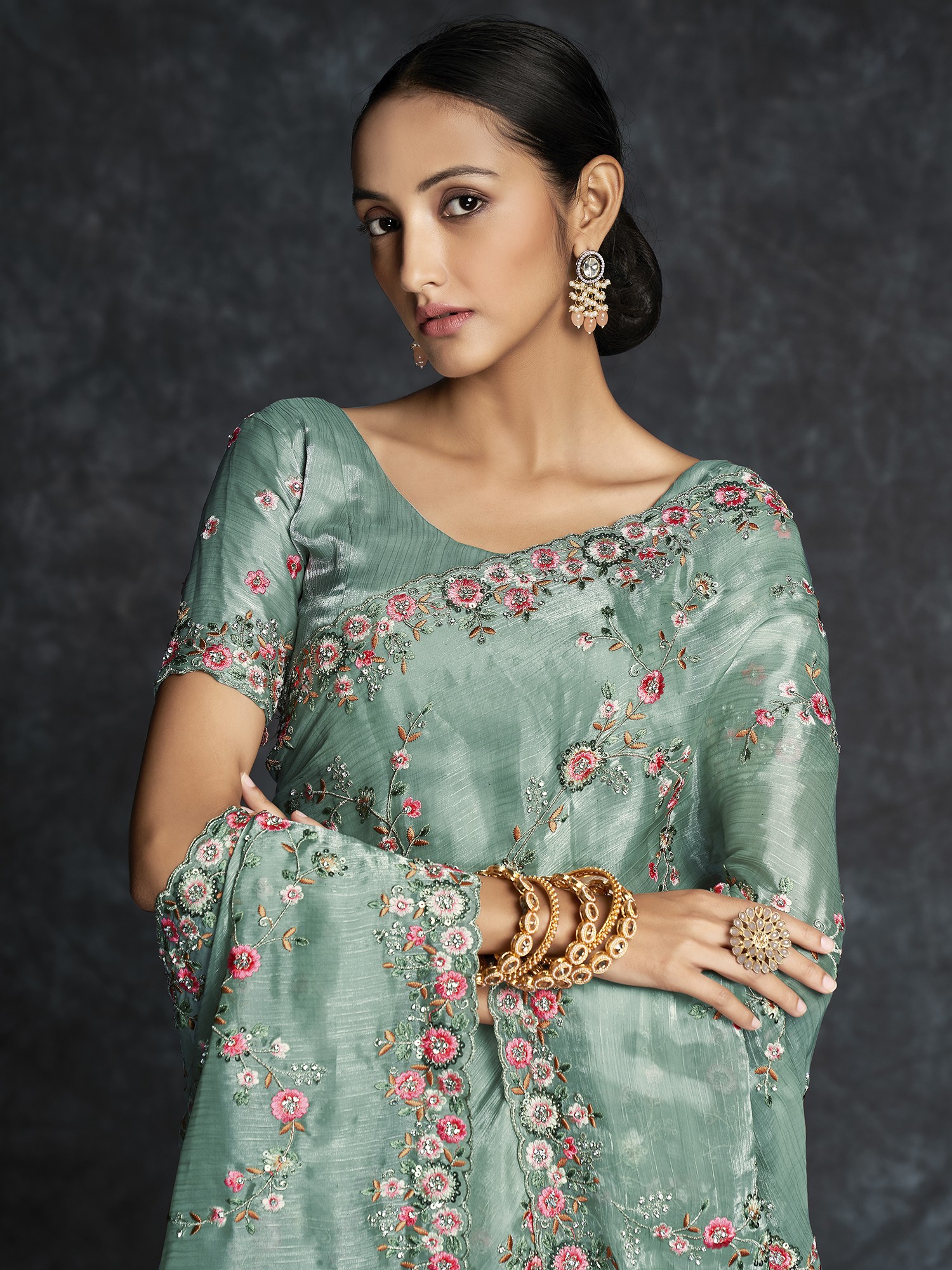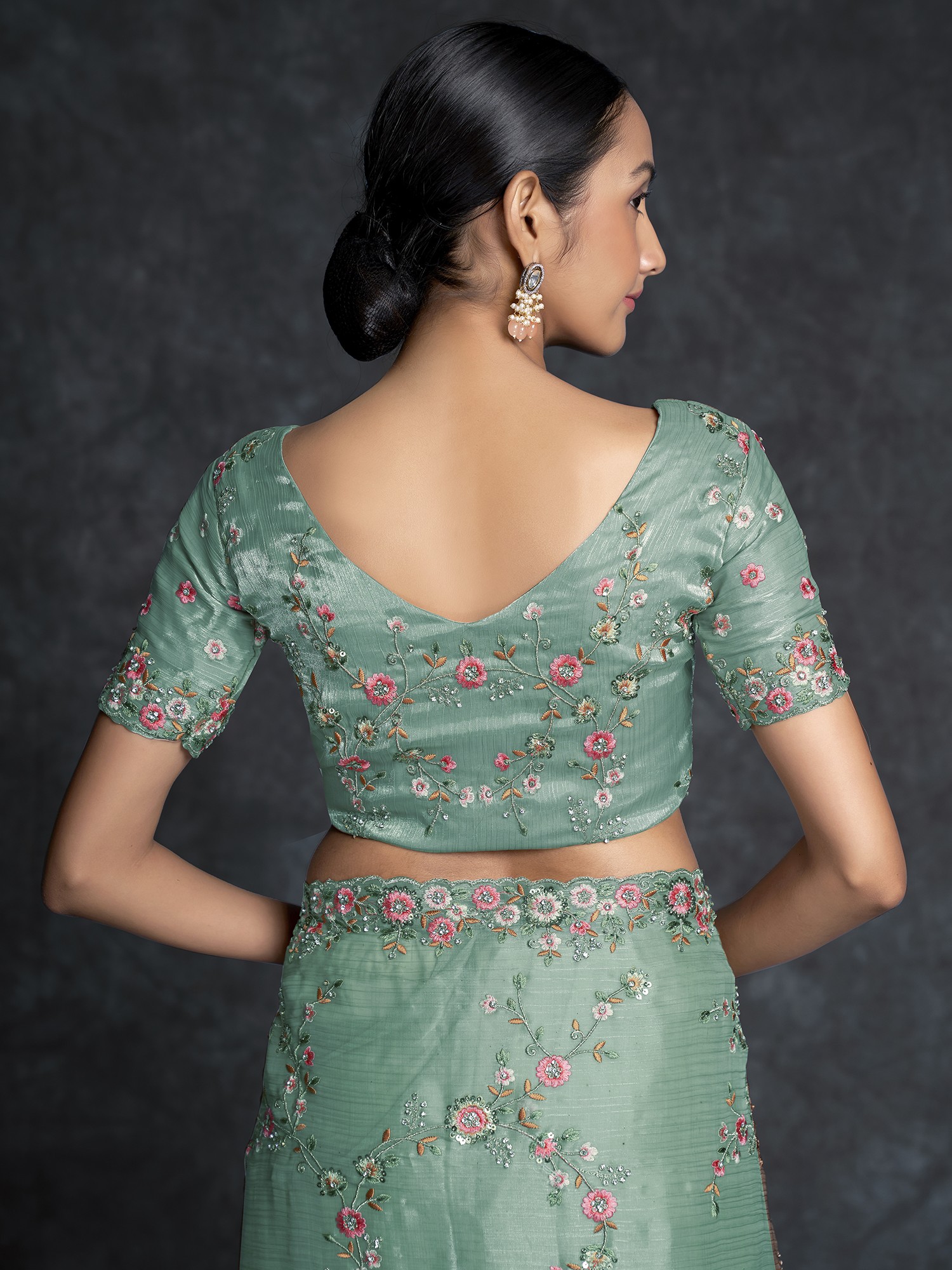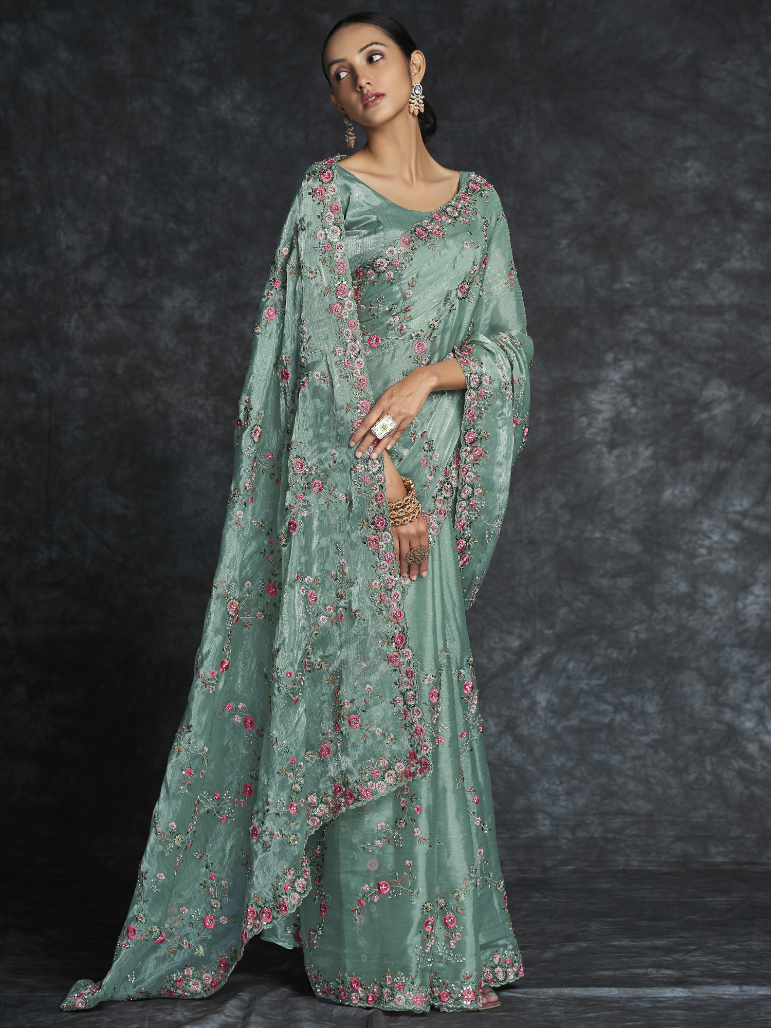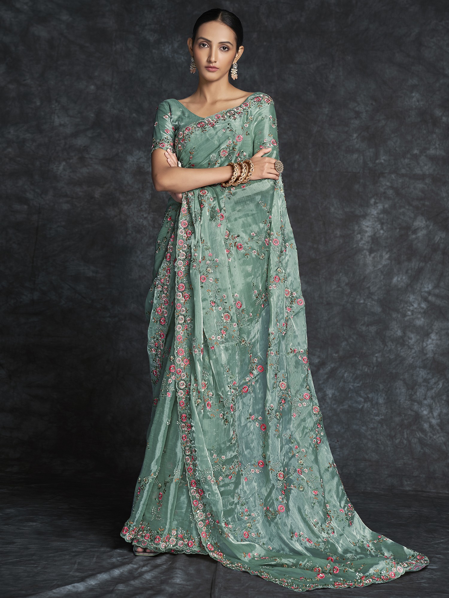 Unveil opulent grandeur with our Organza Meenakari Vine Motif Heavy Embroidered Saree. The organza fabric's luxurious drape meets meticulous embroidery, creating a flourishing garden on fabric. Each vine motif is a masterpiece, meticulously woven with Meenakari artistry. The interplay of colors and texture tells a story of refined taste. As a fashion connoisseur, this saree is your canvas to paint elegance in bold strokes. With each fold, you'll embody art in motion, transforming any event into a fashion spectacle. Elevate your style with a piece that transcends fashion, bridging the gap between opulence and artistic mastery.