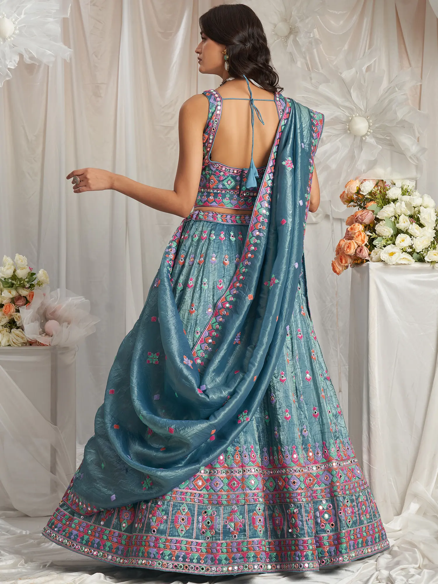 The choli, a sleeveless marvel, boasts a V-neckline and is densely embellished with a geometric pattern of vibrant threads and small, sparkling mirrors. This intricate detailing extends seamlessly to the broad border of the flowing lehenga skirt. The skirt itself is a masterpiece, featuring a repeating motif of embroidered flowers and diamond shapes interspersed with reflective mirror accents. The play of colors – a harmonious blend of blues, pinks, greens, and oranges – against the base fabric creates a truly mesmerizing effect. The hemline of the lehenga is finished with a rich, broad band of intricate embroidery and mirrors, ensuring a grand and impactful presentation.