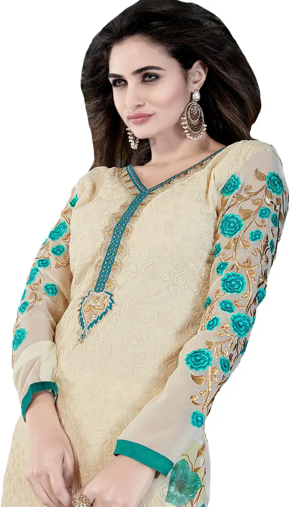 Ivory Churidar Kameez Suit with Embroidery on Neck and Patch Border