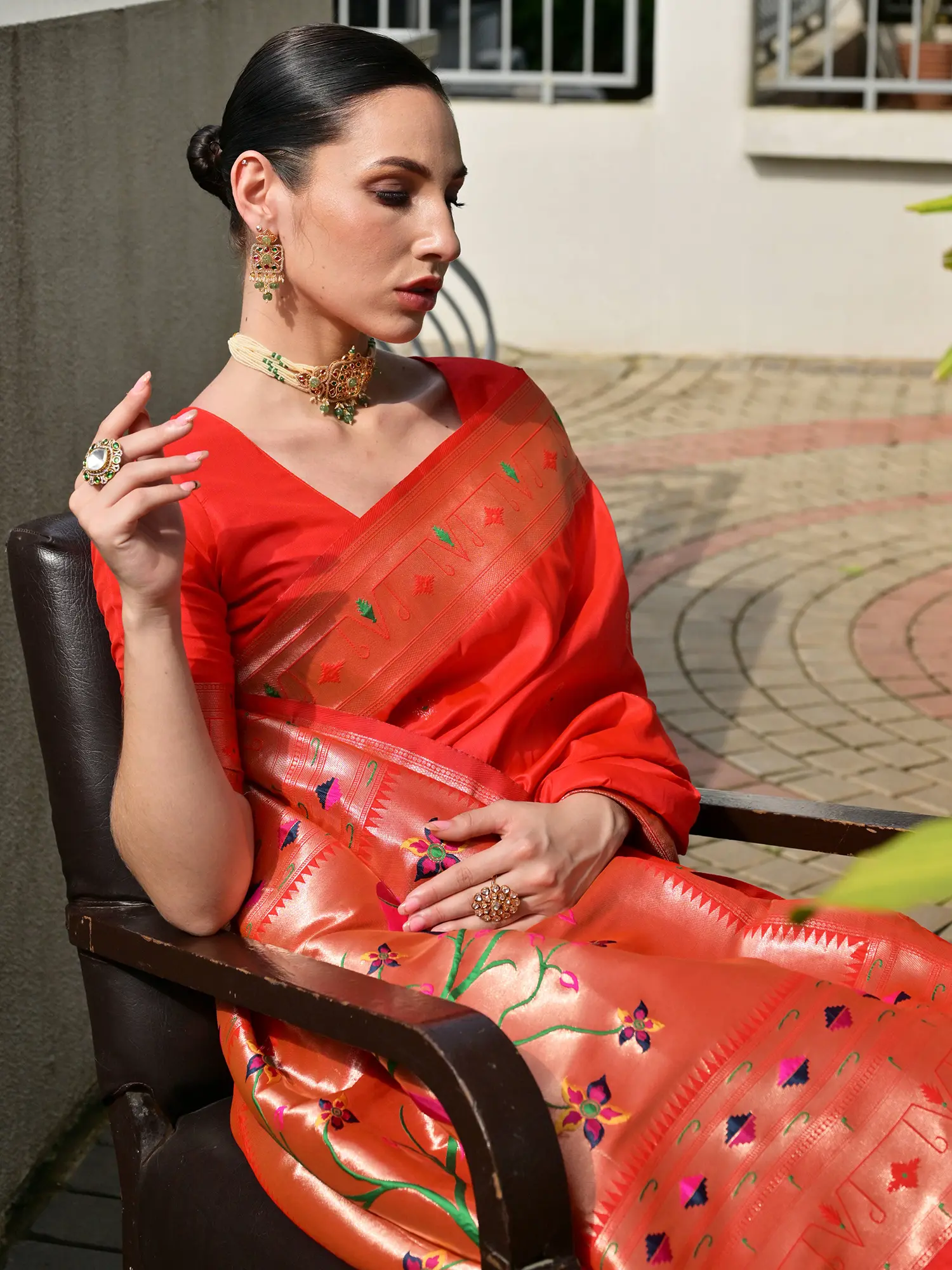 Coral-Paradise Paithani Silk Saree with Hand-Woven Peacocks on Aanchal