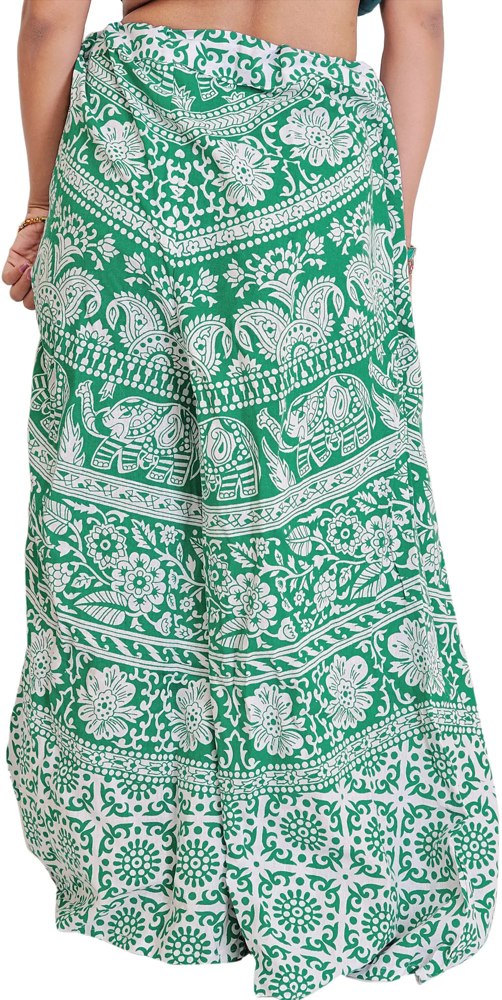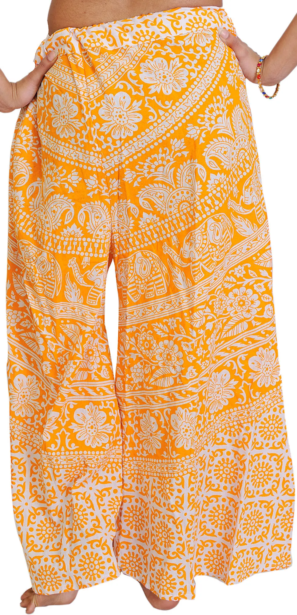 Enjoy comfort and style in these Pilkhuwa Palazzo Pants, which feature adorable printed flowers and elephants. The palazzo pants' relaxed fit and wide-leg silhouette allow for maximum mobility, making them ideal for both informal get-togethers and celebratory events. An air of playfulness is added by the whimsical print, resulting in an enjoyable and stylish appearance. These palazzo pants look great when worn with a kurta or solid-colored shirt to create a stylish look that seamlessly blends trendiness and comfort. These chic and adaptable palazzo pants will add a stylish touch to your outfit.