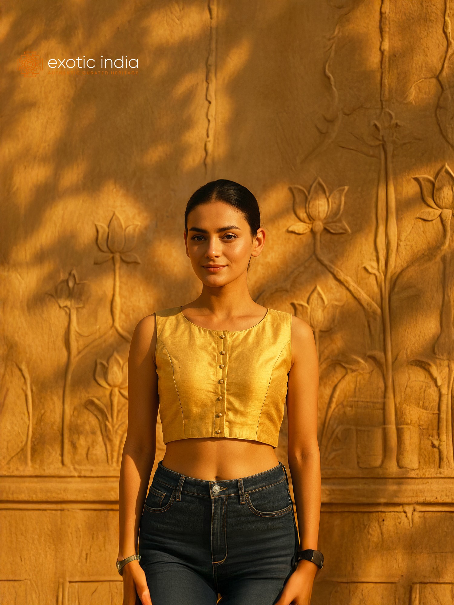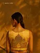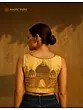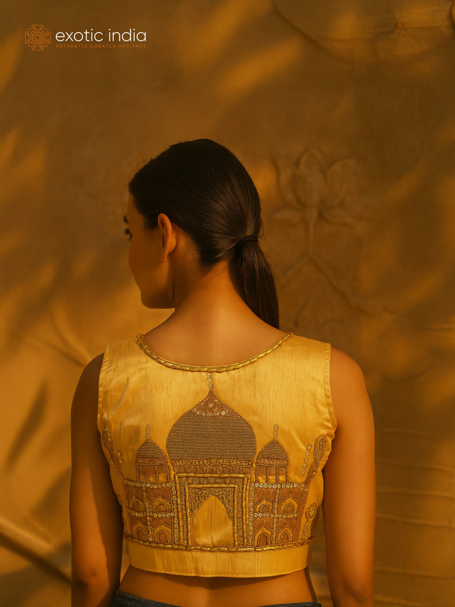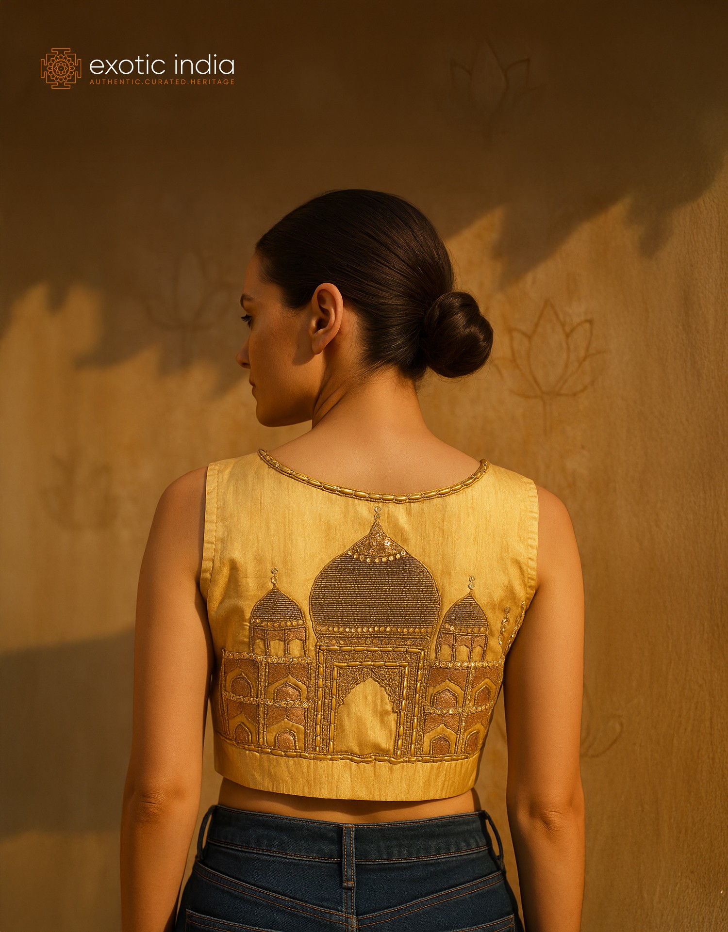 This Pale-Gold Designer Choli from Jodhpur with Tajmahal on the Back Embroidered with Zari and Beads is a tribute to the age-old Zardosi craftsmanship of India. The Choli is made of art silk which has a regal shine. The pale gold color of the choli is a color that goes with any saree. The back of the choli is decorated with the image of the Taj Mahal exclusively crafted by using the Zardosi technique. There has been a beautiful use of beads and zari to manifest the exact design of the Taj Mahal. This choli is a perfect fit for any evening function where the wearer needs to shine on the eternal Taj Mahal.
