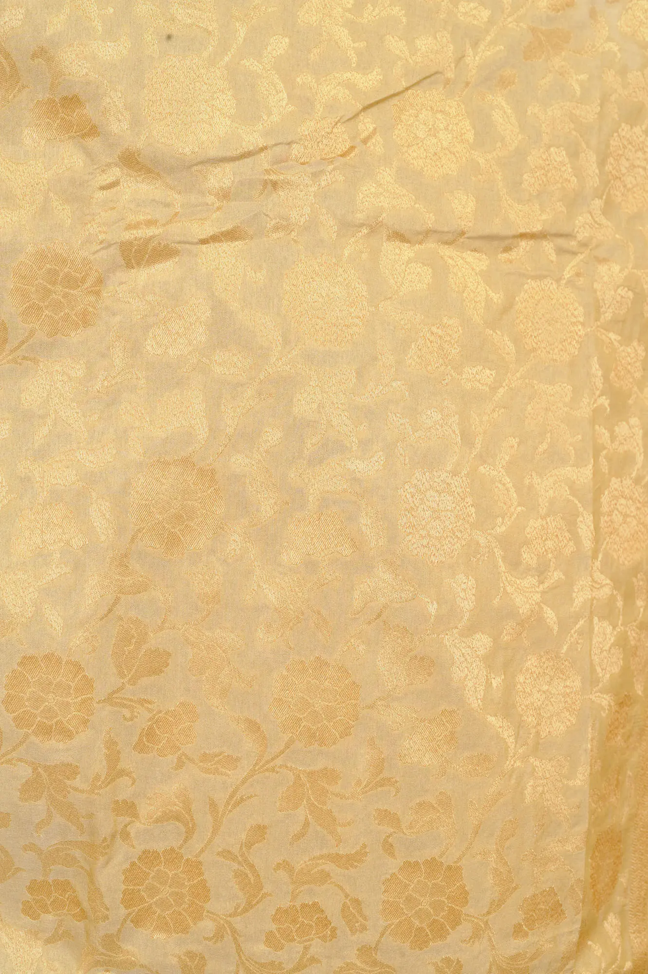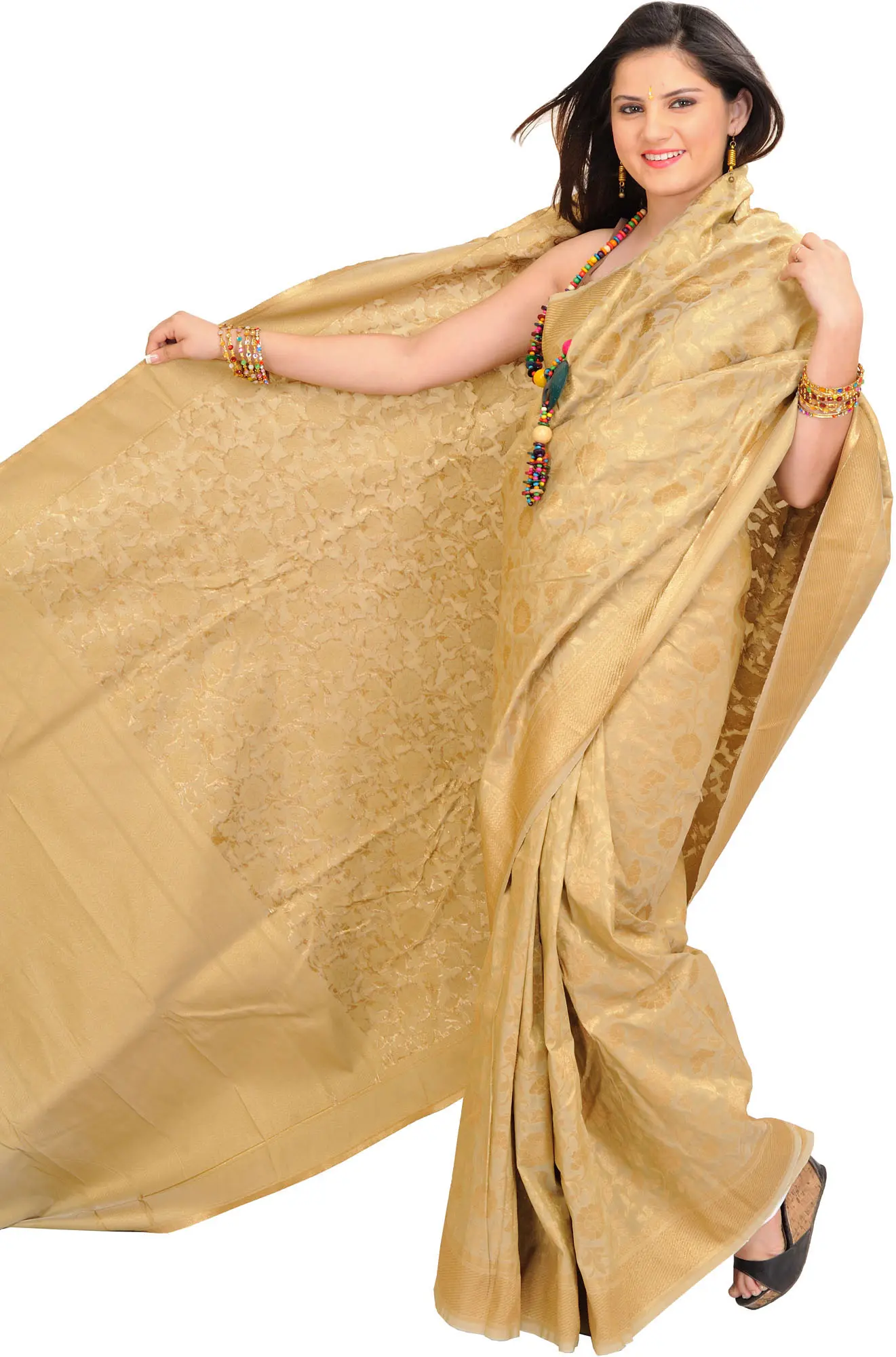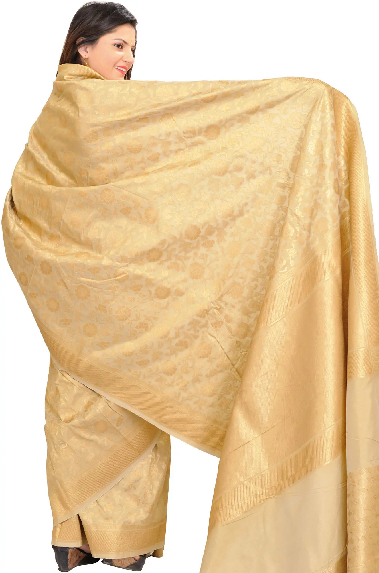 Pale-Khaki Saree from Banaras with Woven Golden Flowers All-Over