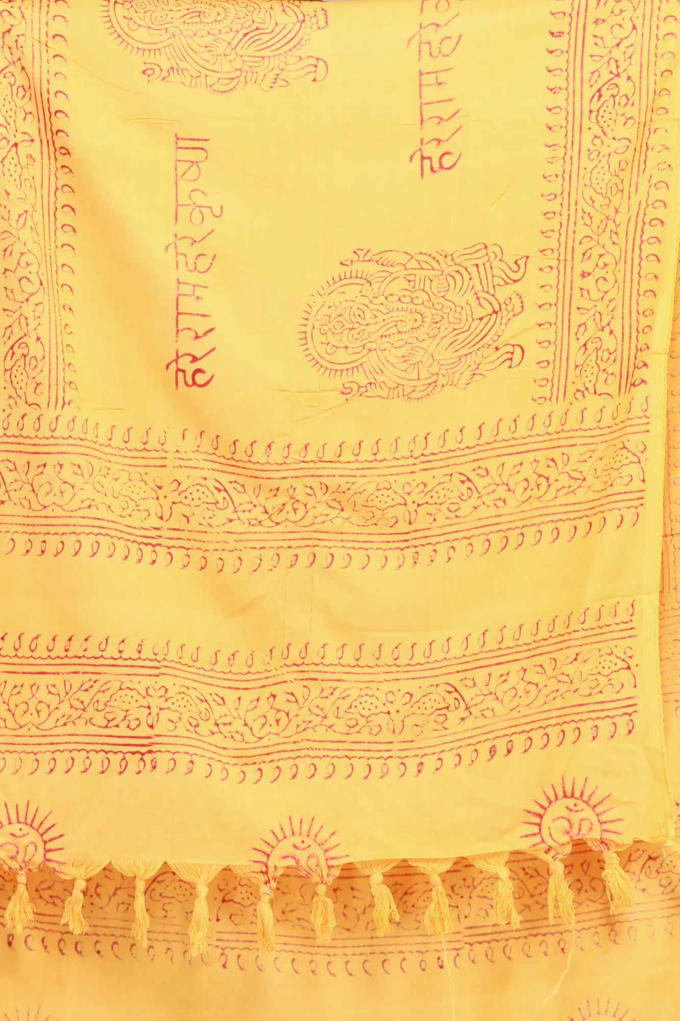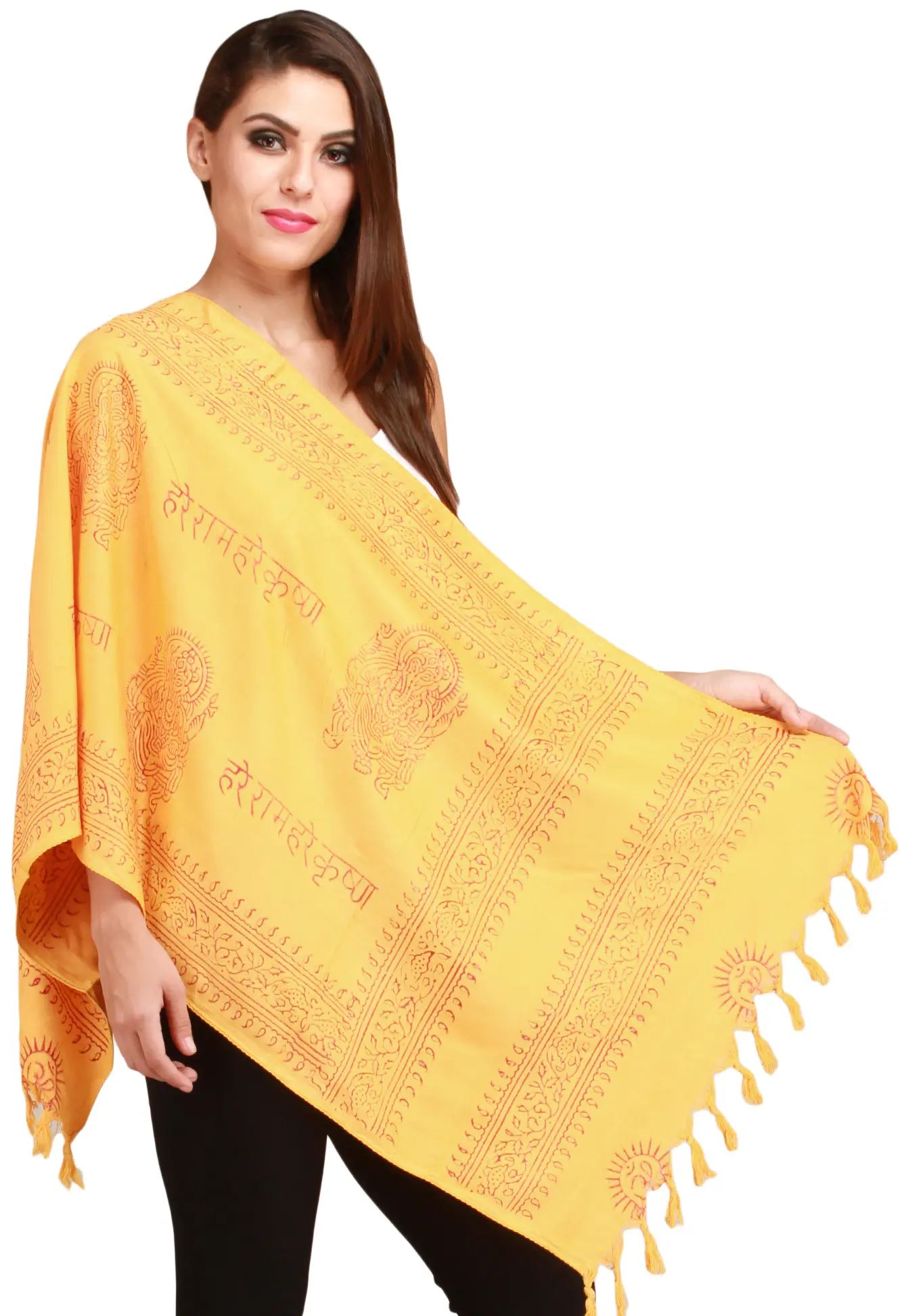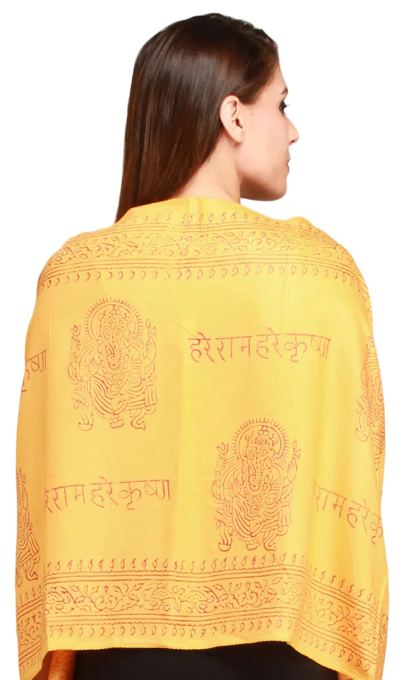 Wrap yourself and embark on a divine journey with this beautiful Scarf. This Scarf has been crafted from polycotton and adorned with the sacred image of Lord Ganesha and the enchanting mantra “Hare Radha Hare Krishna”. The vibrant pale-marigold hue of this art-piece symbolises enlightenment and joy, reflecting the essence of ‘Sanatana Dharma’. Embrace the sacred energy, channelling the divine essence of “Hare Radha Hare Krishna” into your spiritual practice. Illuminate your path with this celestial accessory, a testament to your unwavering faith.