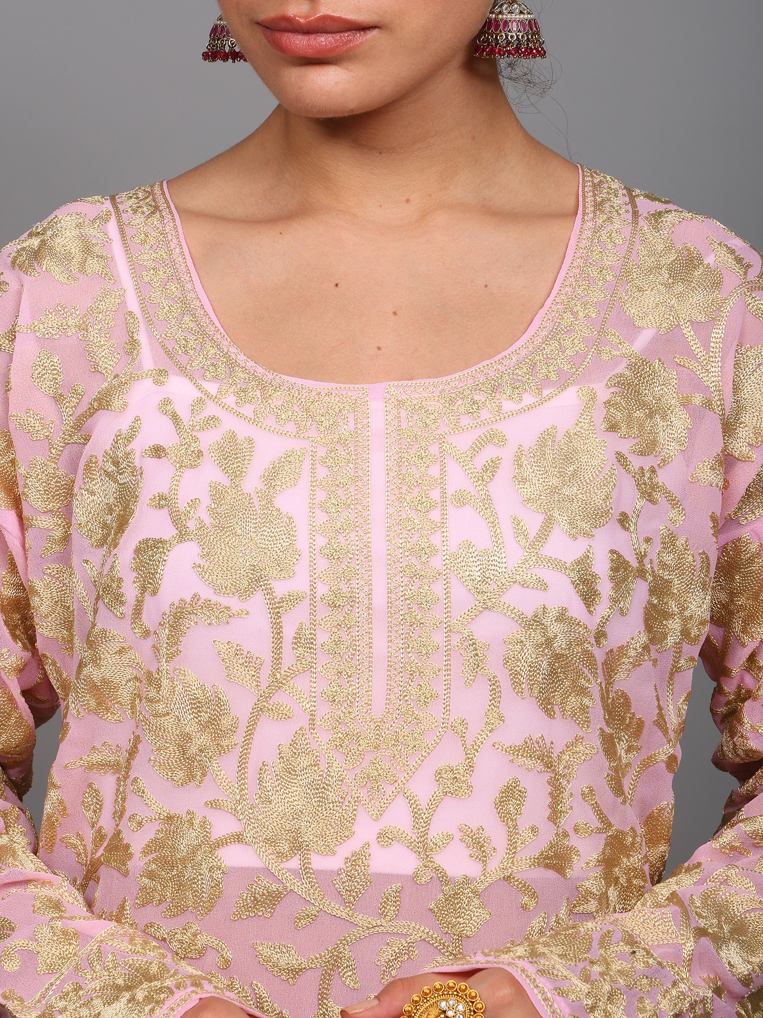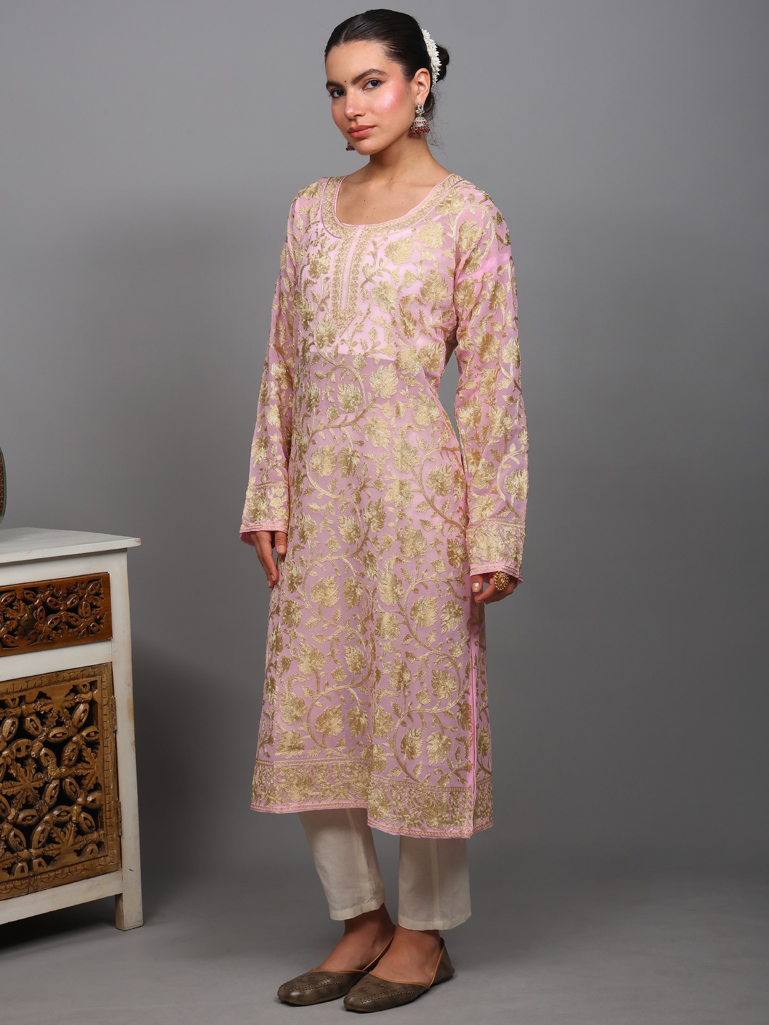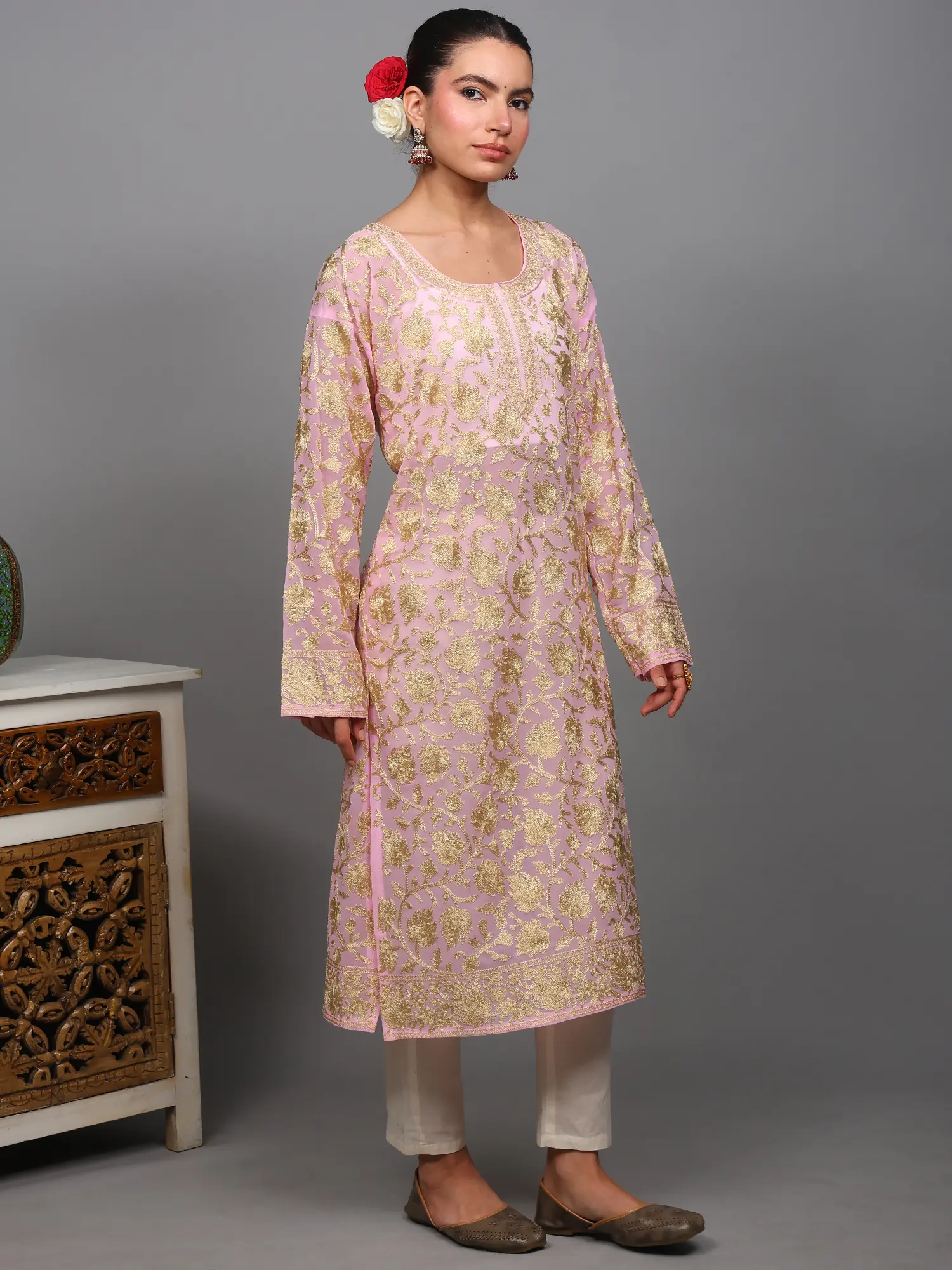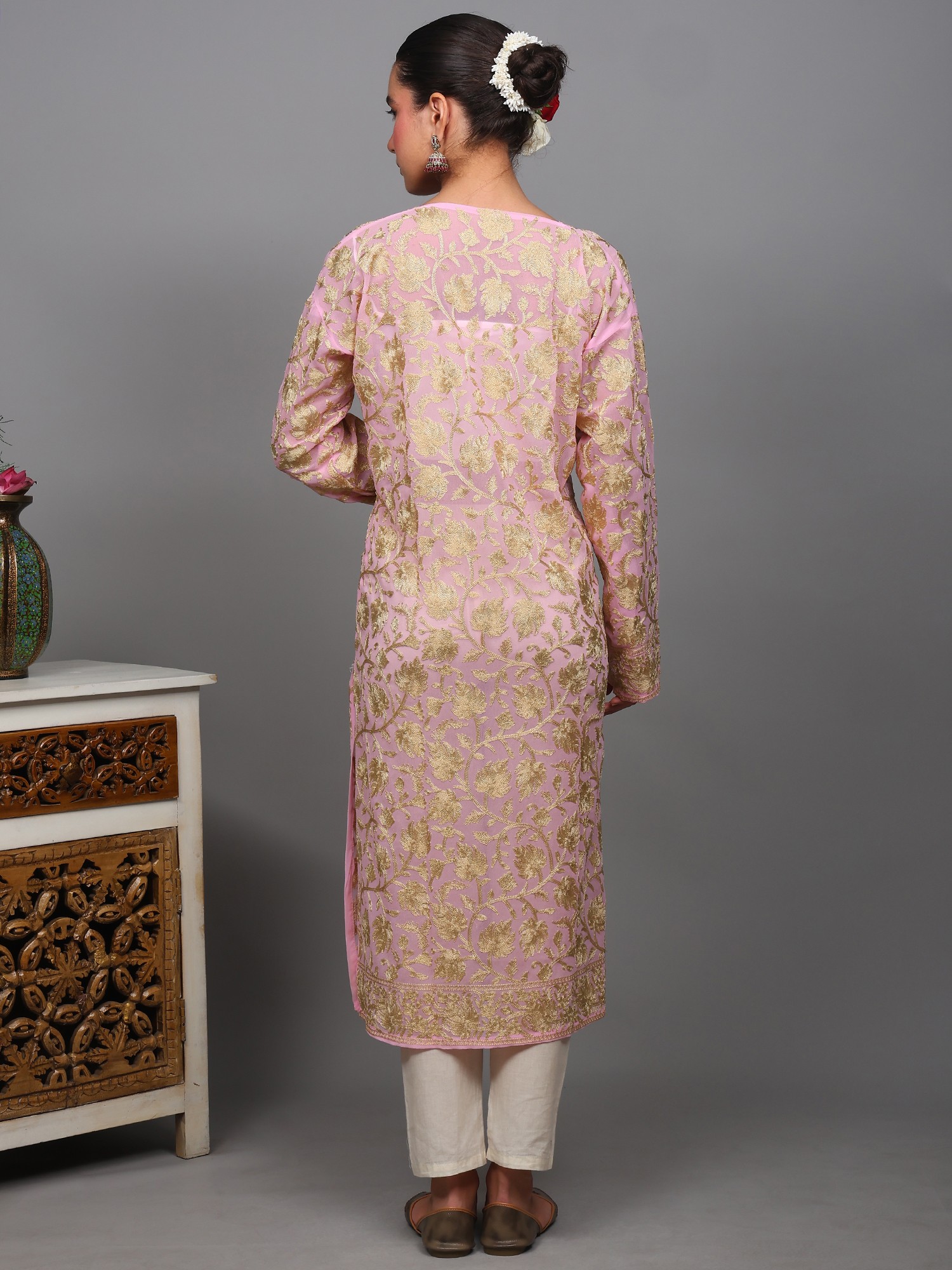 Parfait-Pink Georgette Long Kurti with Aari Embroidered Maple Vines