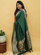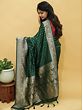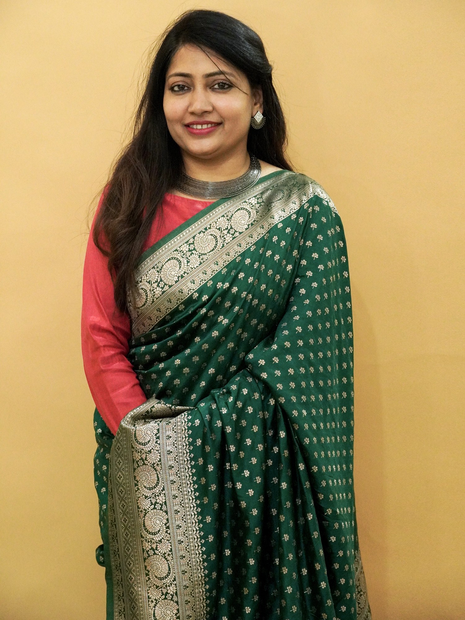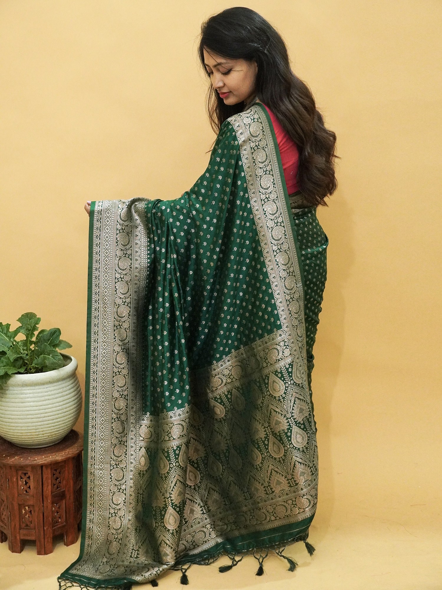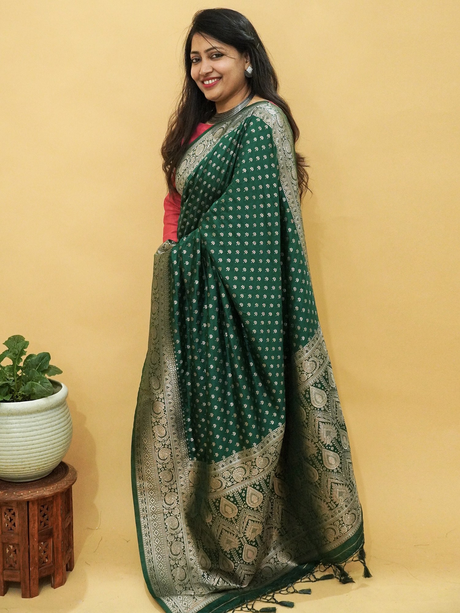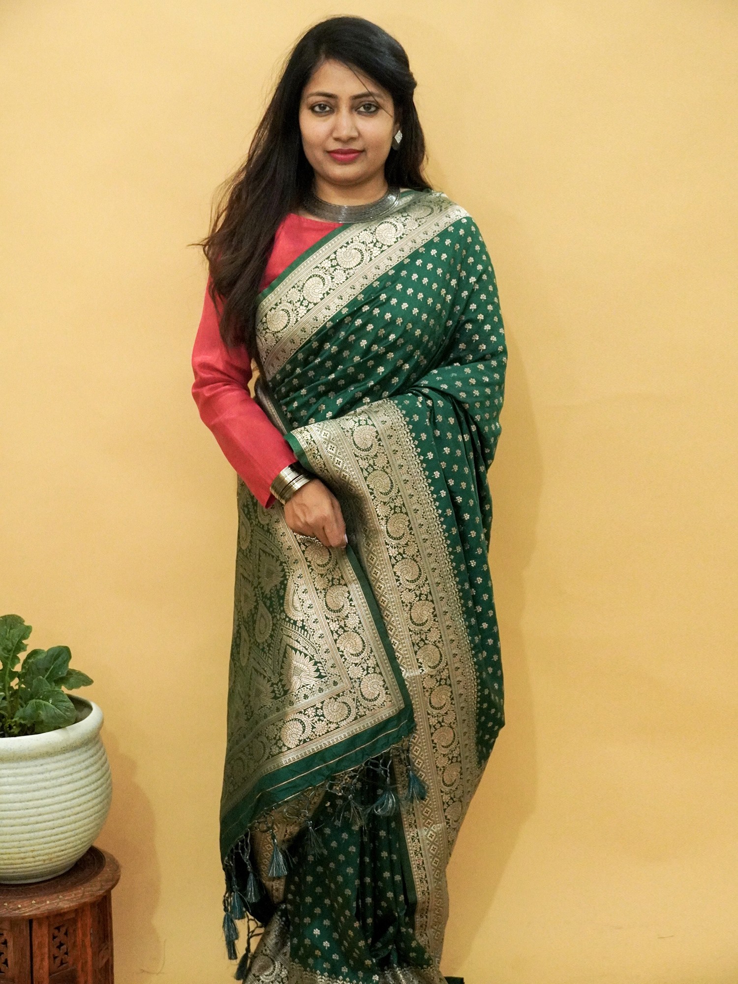 Available in a variety of rich Indian colors, this brocaded silk Banarasi Saree needs to be in your shopping cart now! The beautiful silk field of the saree is covered in tiny Butis, creating a stunning profusion of floral beauty on the saree.