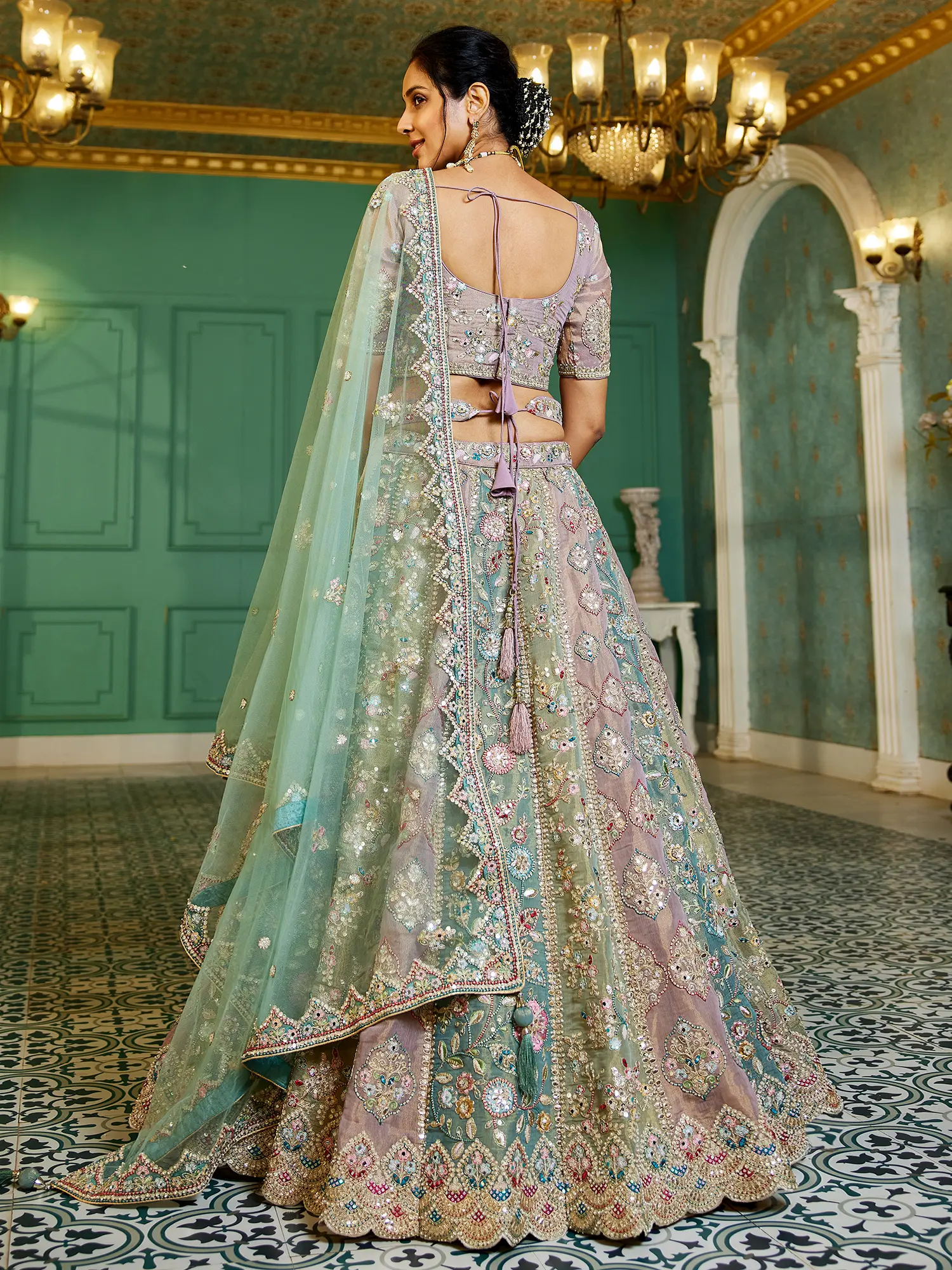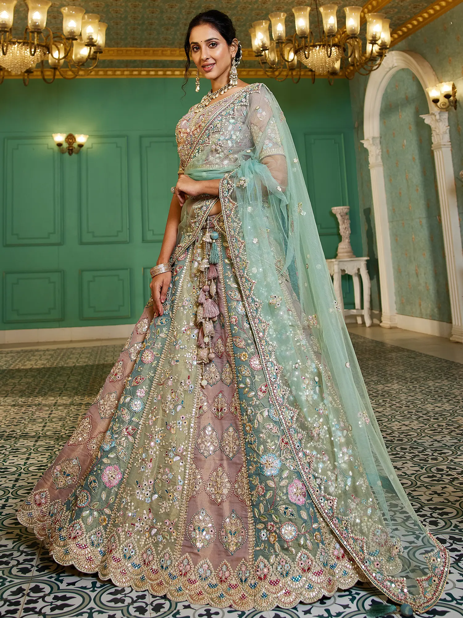 Zephyr-Green Designer Banarasi Lehenga Choli with Metallic-Thread Embroidery and Velvet Applique