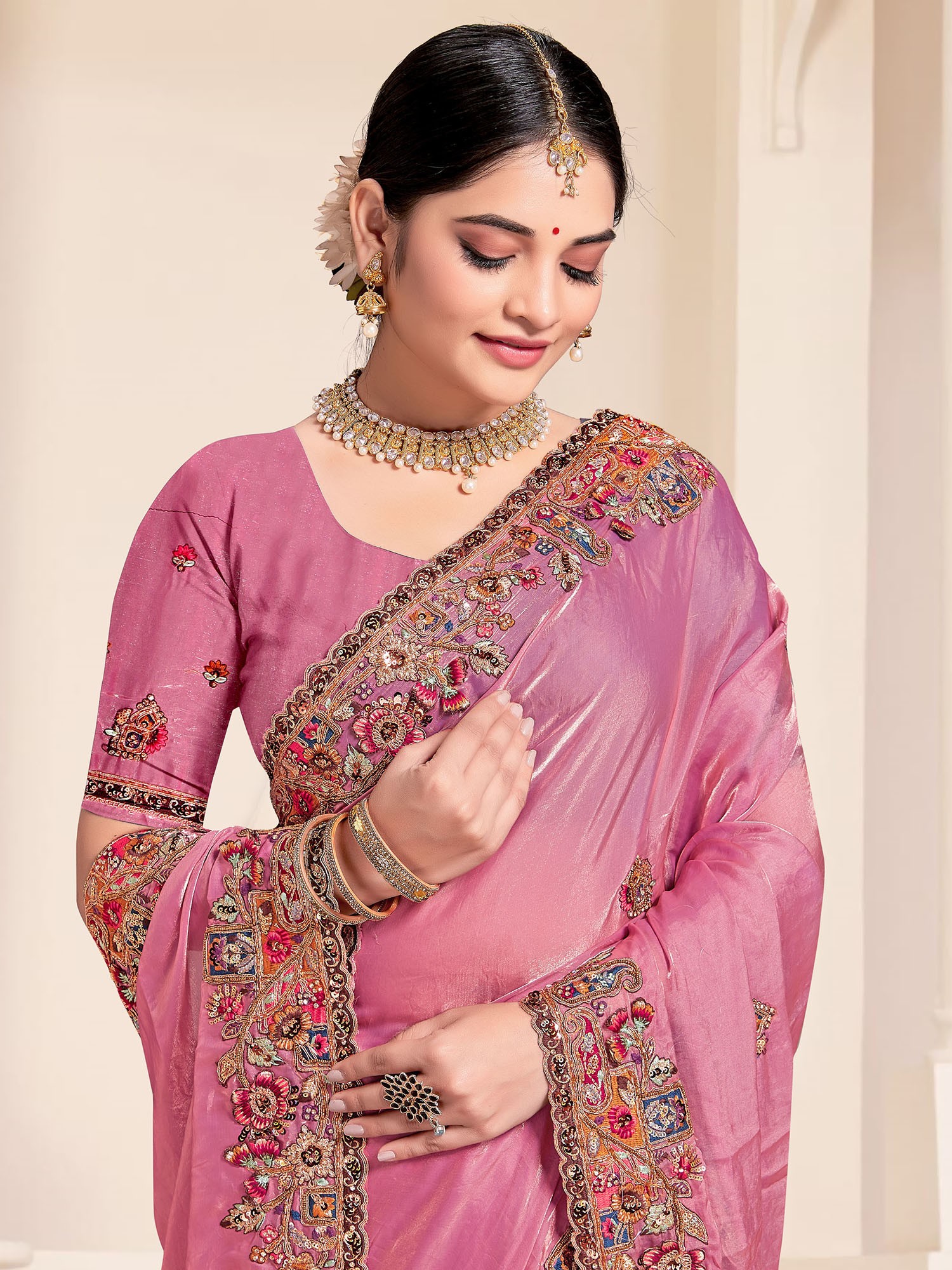 Patch Border Two Tone Silk Sequins And Embroidery Work Fancy Saree With Blouse