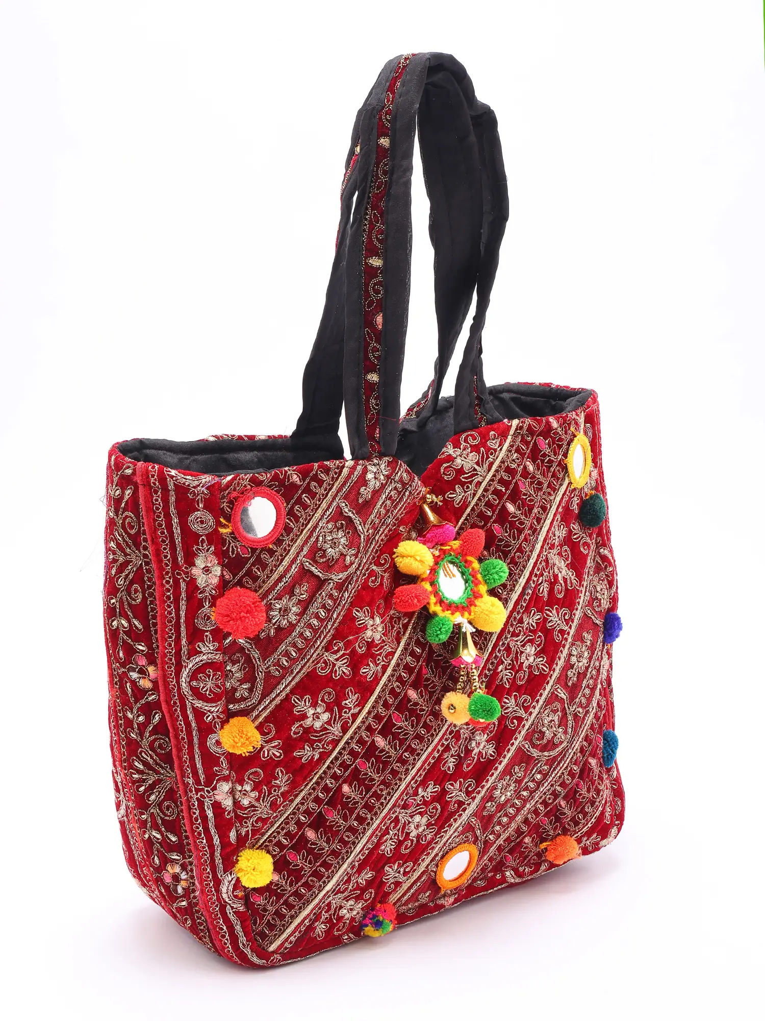 Patchwork Shopper Bag from Kutch with Zari-Mirror Embroidery and Pom Poms