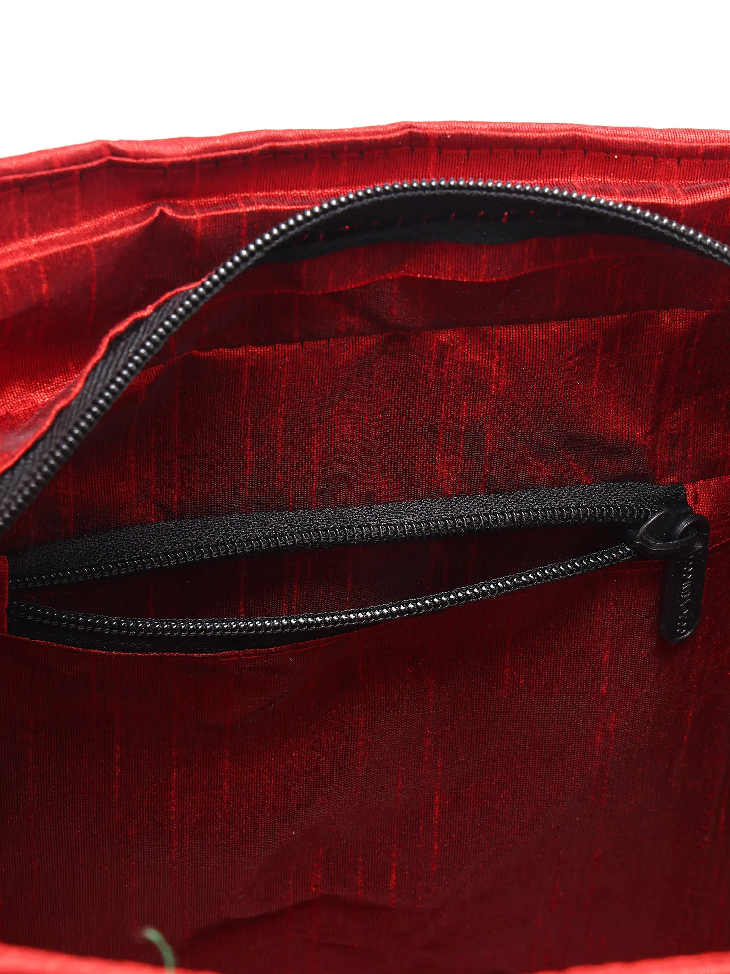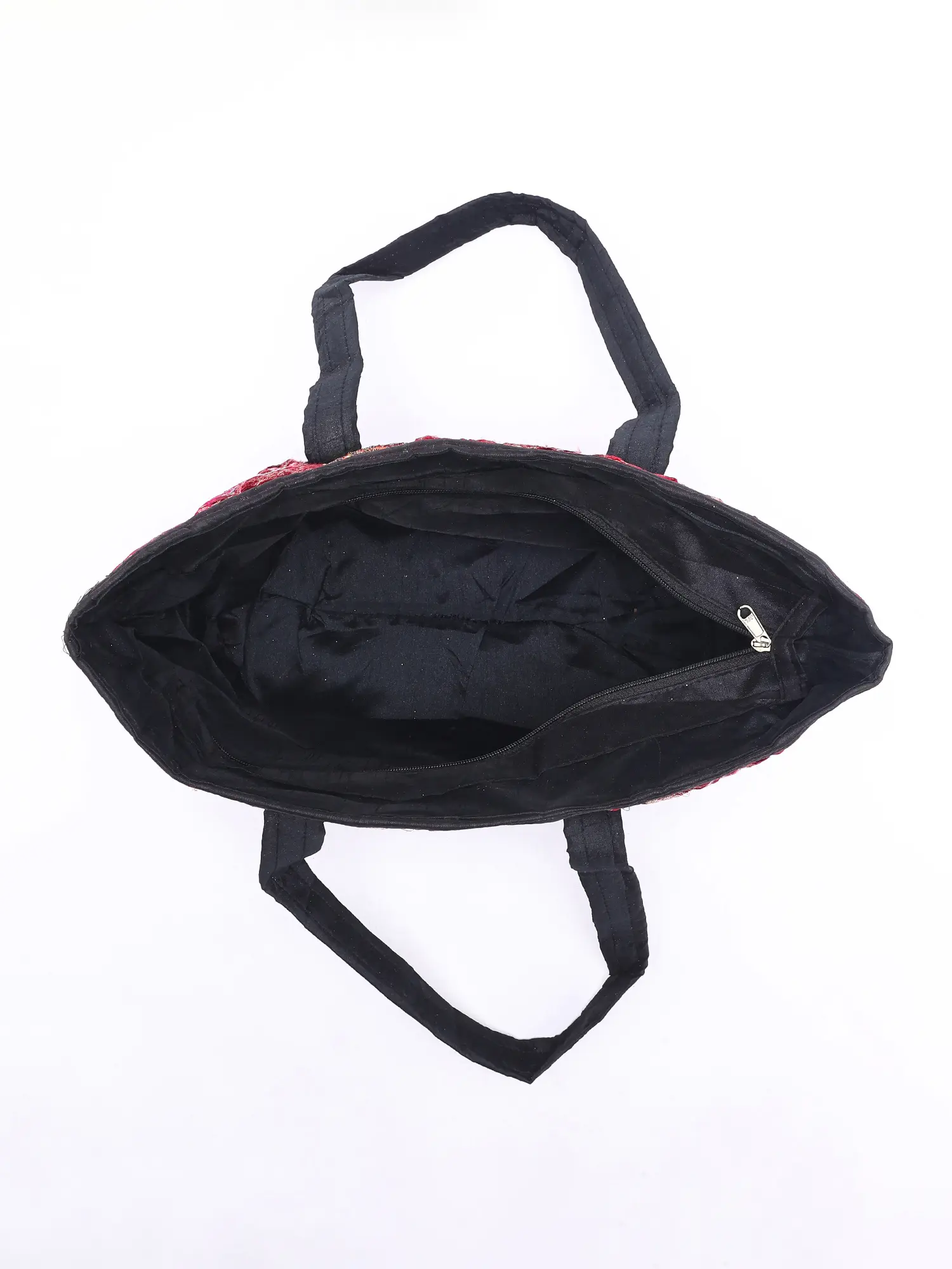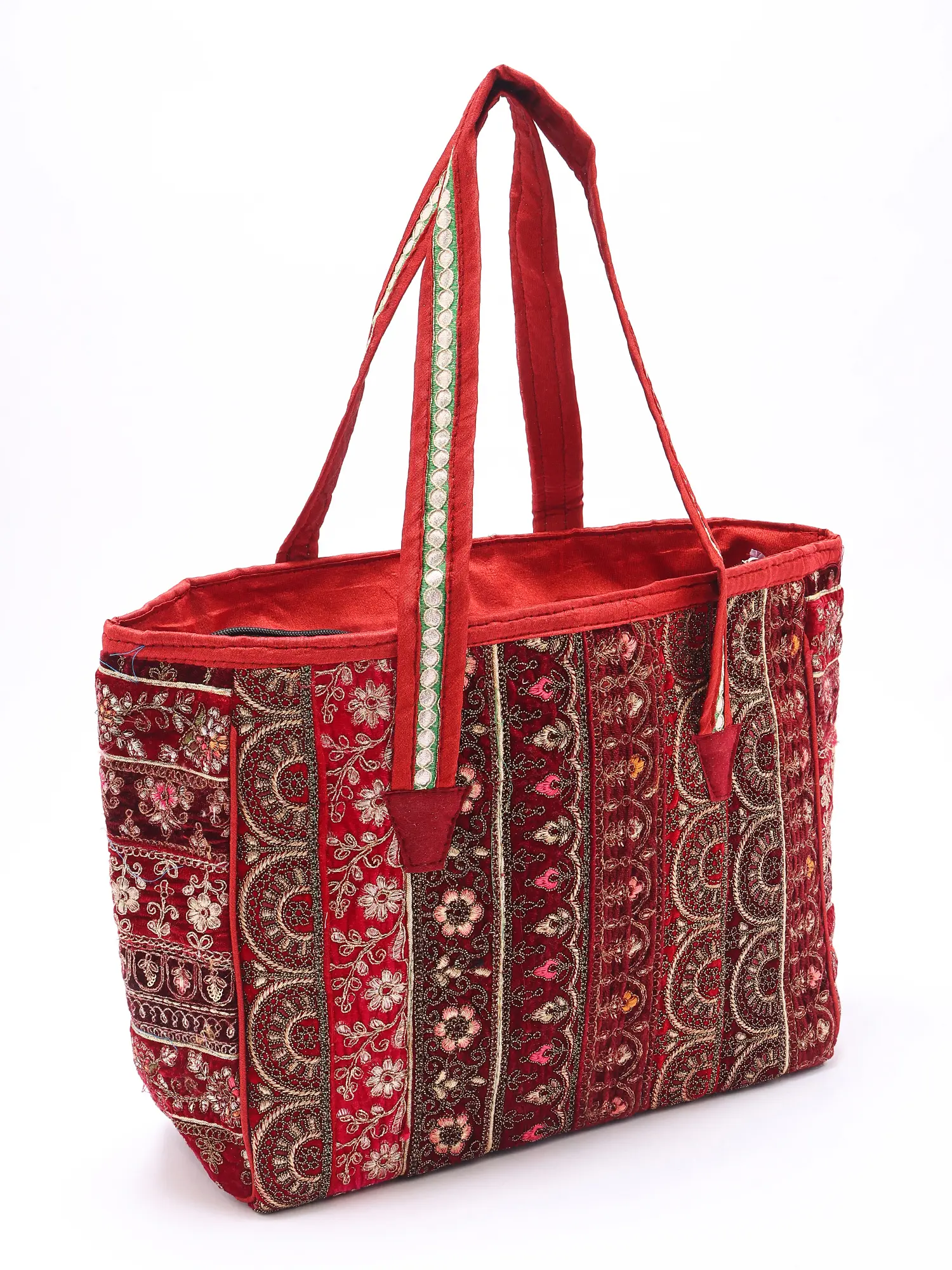 The foundation of this luxurious tote is sumptuously soft velvet, providing a rich backdrop for the dazzling floral motifs. Adorning the velvet are delicate Zari threads, a type of metallic embroidery that lends a brilliant shimmer and an air of opulence. The intricate floral patterns, rendered in shades of crimson, rose, and touches of warm orange, are not just decorative; they are a language of nature woven into fabric, evoking the beauty of blooming gardens and verdant landscapes. The patchwork design creates a dynamic visual appeal, with vertical strips of varying velvet textures and embroidery styles, each panel complementing the other to form a harmonious and eye-catching composition.