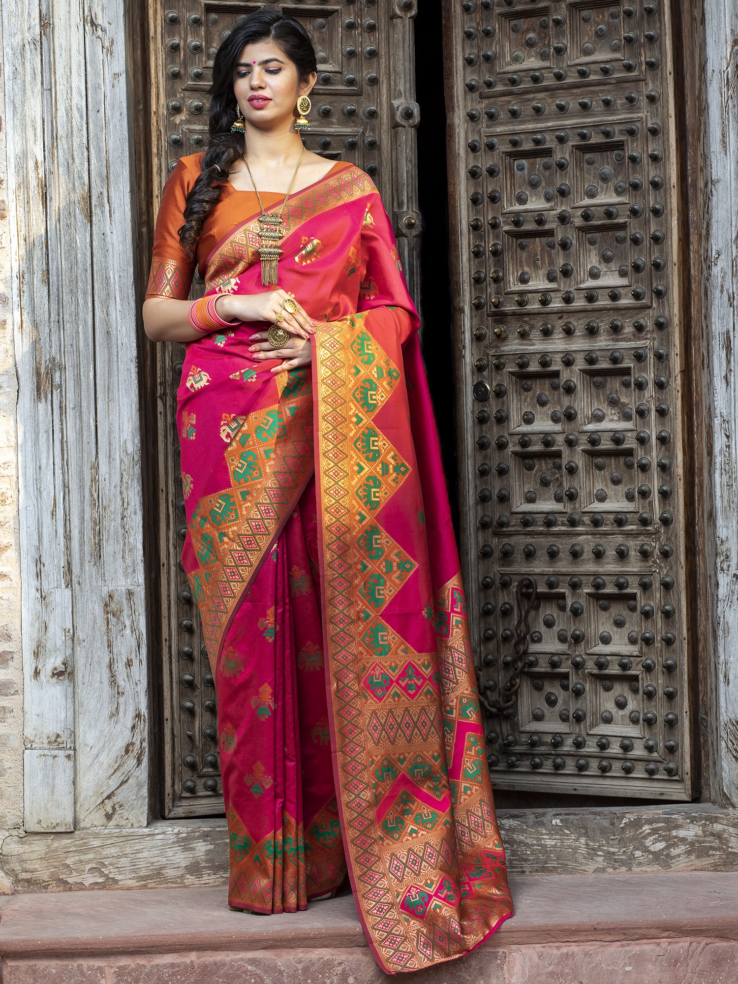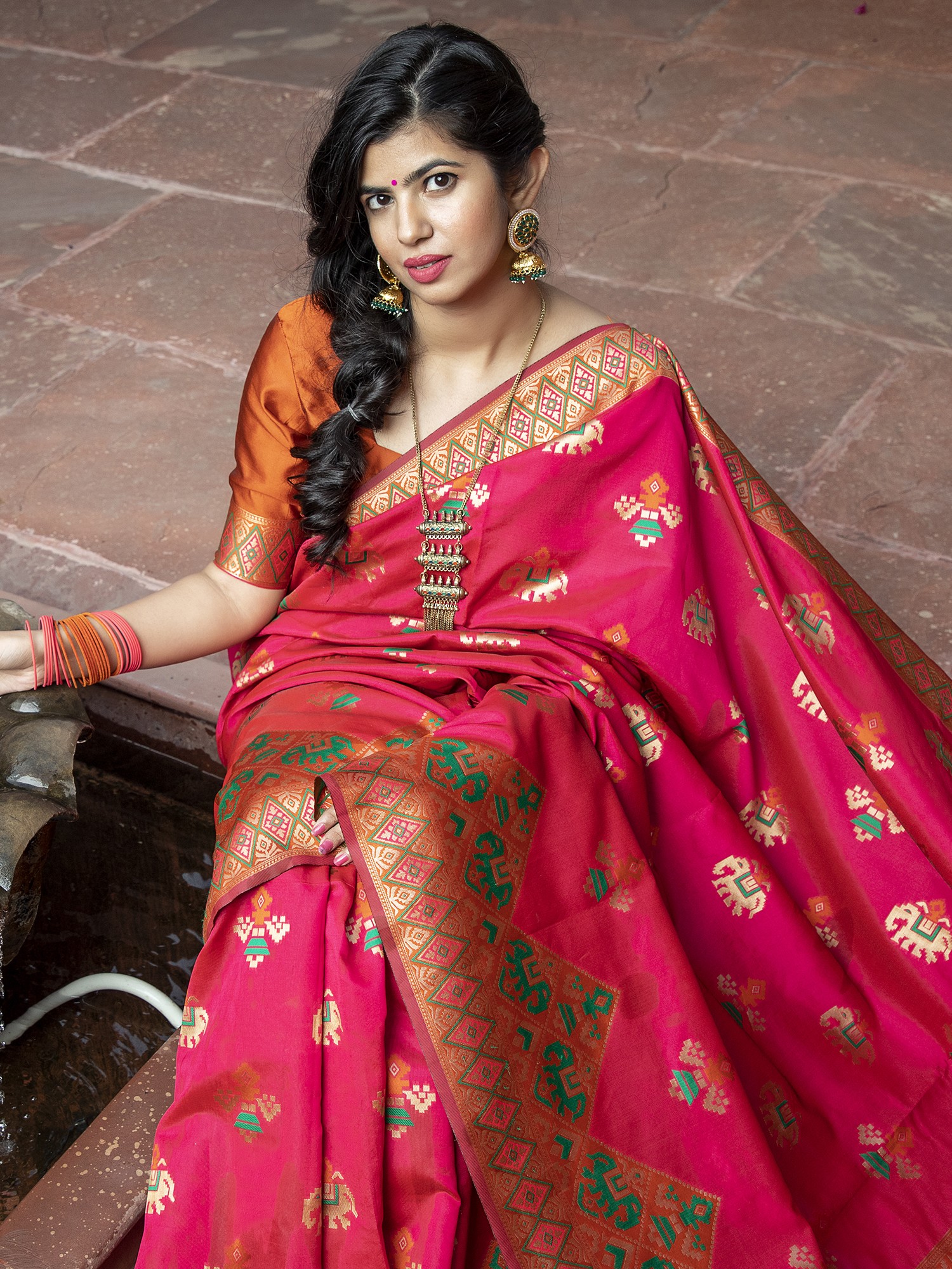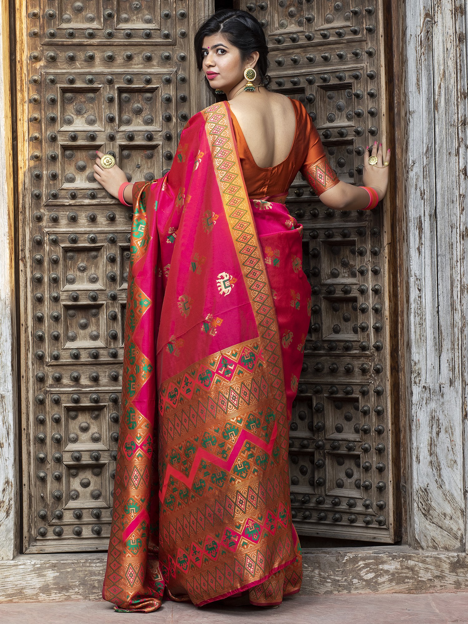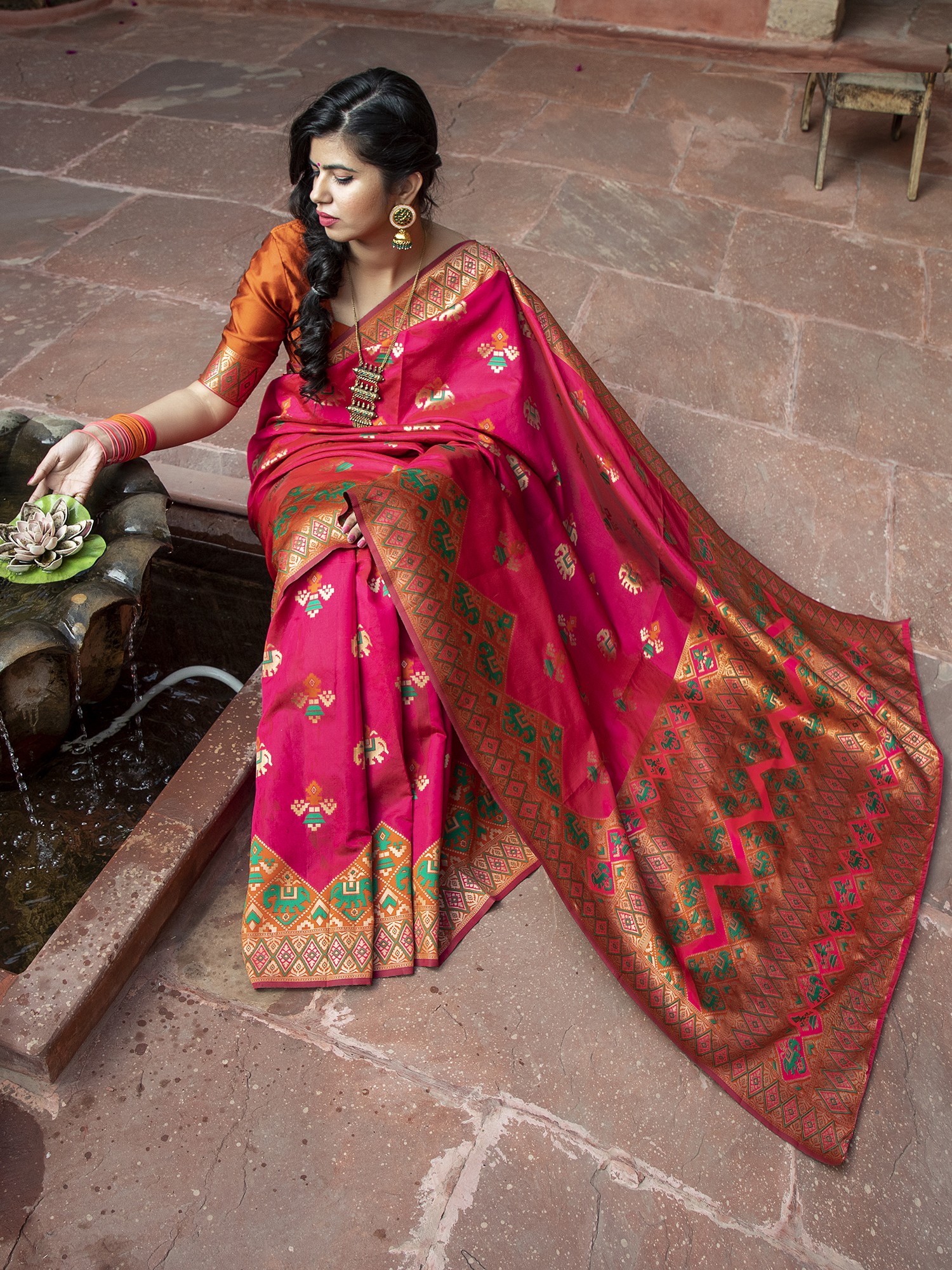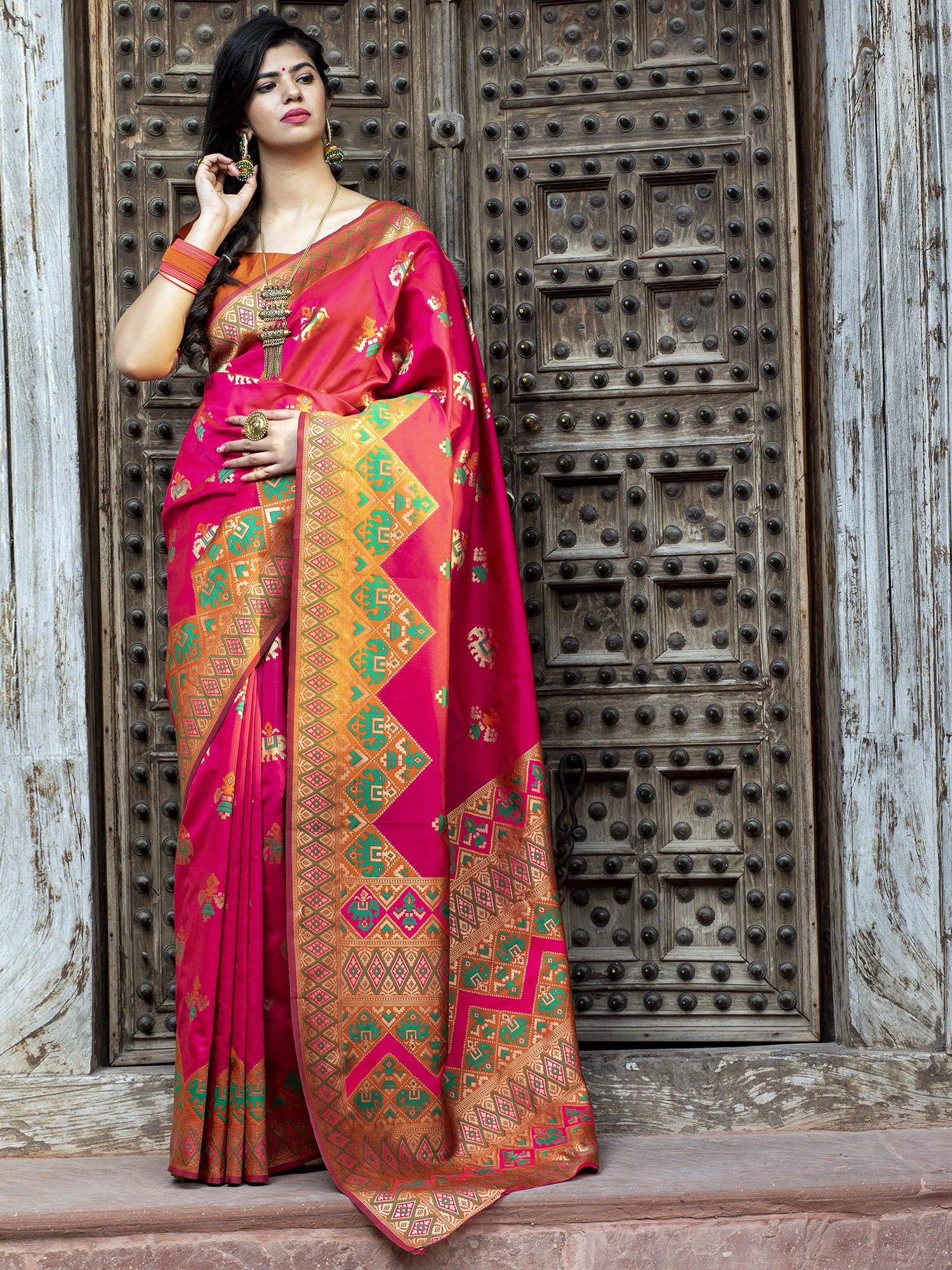 The beauty of Patan’s Patolas lies in their unbroken bond with the land of Gujrat, whose rich history and heritage is celebrated on the silken spread of these drapes. Classic elephant and bird motifs, along with ethnic patterns are beautifully placed all over the Patola, with an intricate work on the border and pallu, which makes these sarees a lovely addition to your treasure of traditional Indian wear.