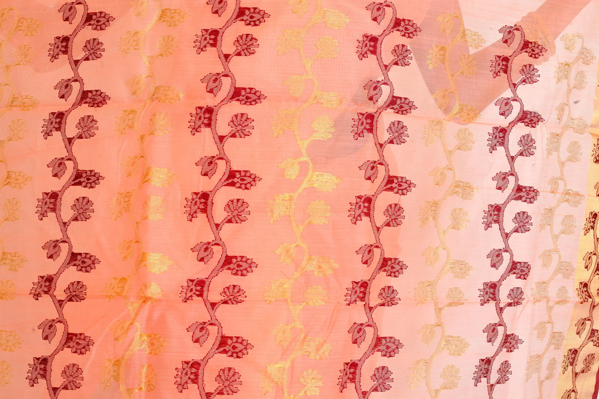 The Peach-Pink Chanderi Saree is a celebration of subtlety and regal charm. Its lovely hue, a delicate fusion of peach and pink, exudes grace without overwhelming. This masterpiece boasts minimal embellishments, allowing its serene elegance to shine through. Crafted from breathable cotton, it ensures comfort even on the warmest days, while a golden border adds a touch of opulence. The true showstopper is the hand-woven flowers adorning the Aanchal, creating a stunning contrast to the serene backdrop. As you drape this sari, gorgeous floral creepers on the pallu unfurl, weaving a tale of timeless beauty and understated sophistication.