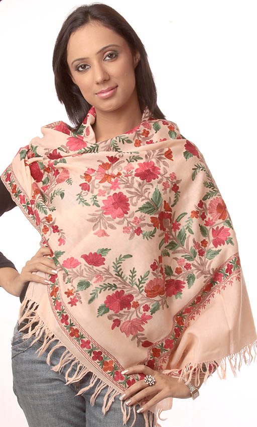 Peach Stole from Kashmir with Floral Embroidery