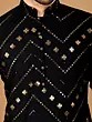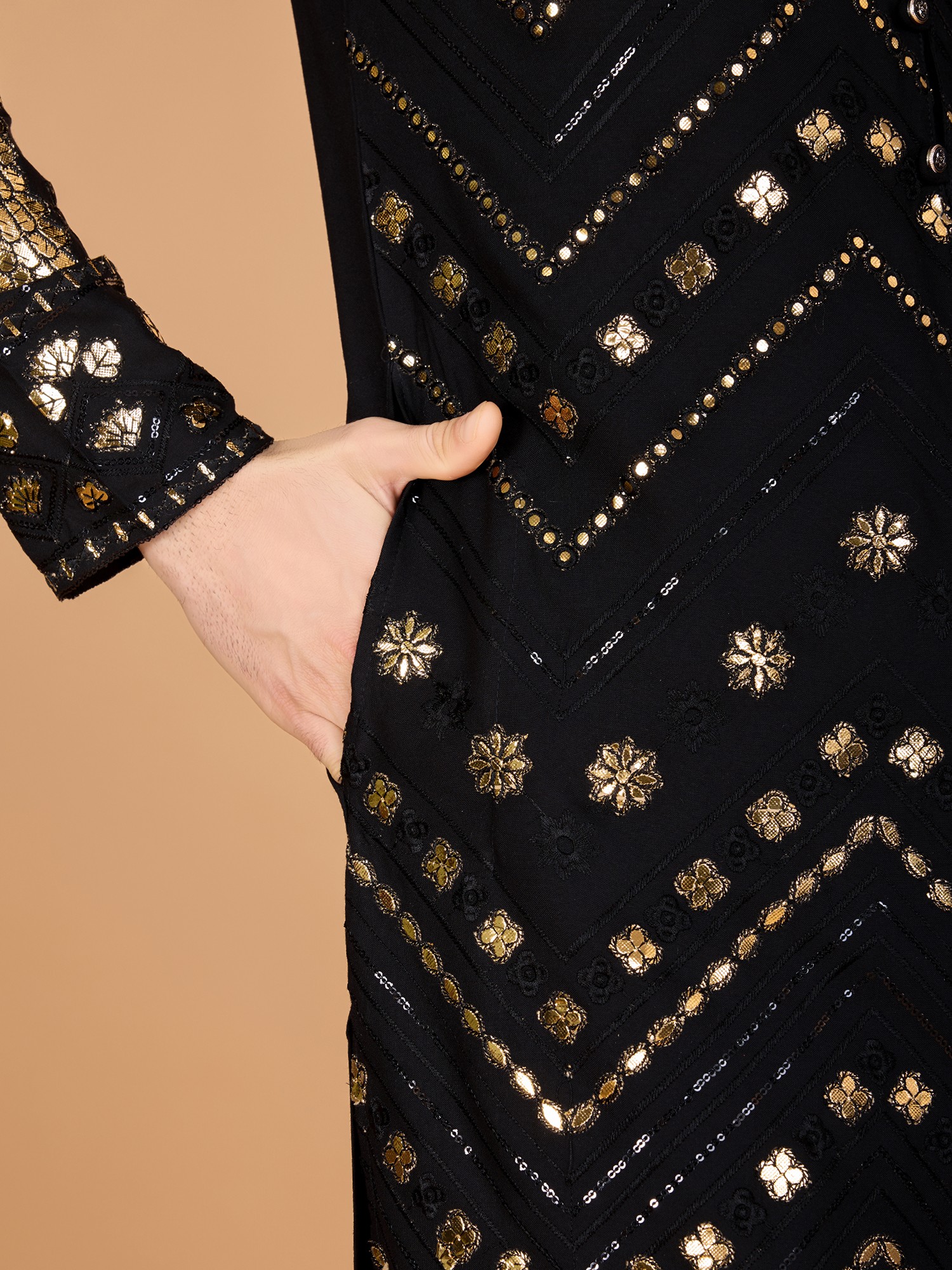 This striking kurta is an ideal choice for occasions where you want to exude sophistication and grace. Its elegant design features intricate detailing that sets it apart from the ordinary. The deep, rich color of the fabric serves as a perfect backdrop for the dazzling embellishments, making it a visually captivating piece.