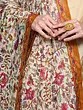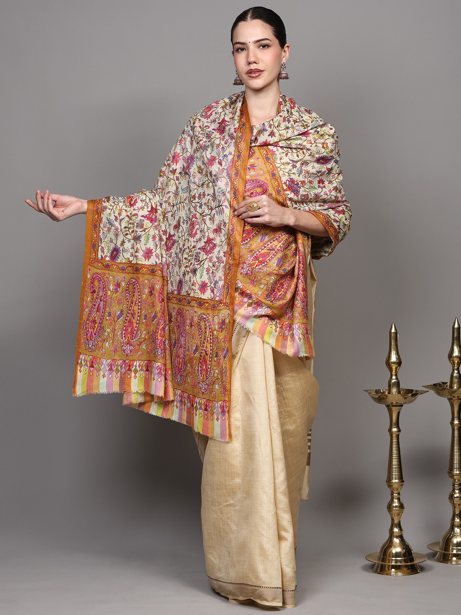 What truly elevates this shawl is the intricate Aari embroidery that adorns its entirety. This ancient needlework technique, renowned for its precision and beauty, has been expertly applied to accentuate the Kalamkari designs. Delicate threads in shades of crimson, fuchsia, emerald green, sapphire blue, and golden yellow are skillfully woven to add depth, texture, and a subtle shimmer to the already captivating patterns. The embroidery traces the outlines of the flowers and paisley, highlighting their intricate details and giving them a three-dimensional quality. A rich, ochre border, also embellished with intricate paisley work and a delightful fringed hem featuring a cascade of colorful stripes, frames the shawl, adding a final touch of opulence and a playful contrast.