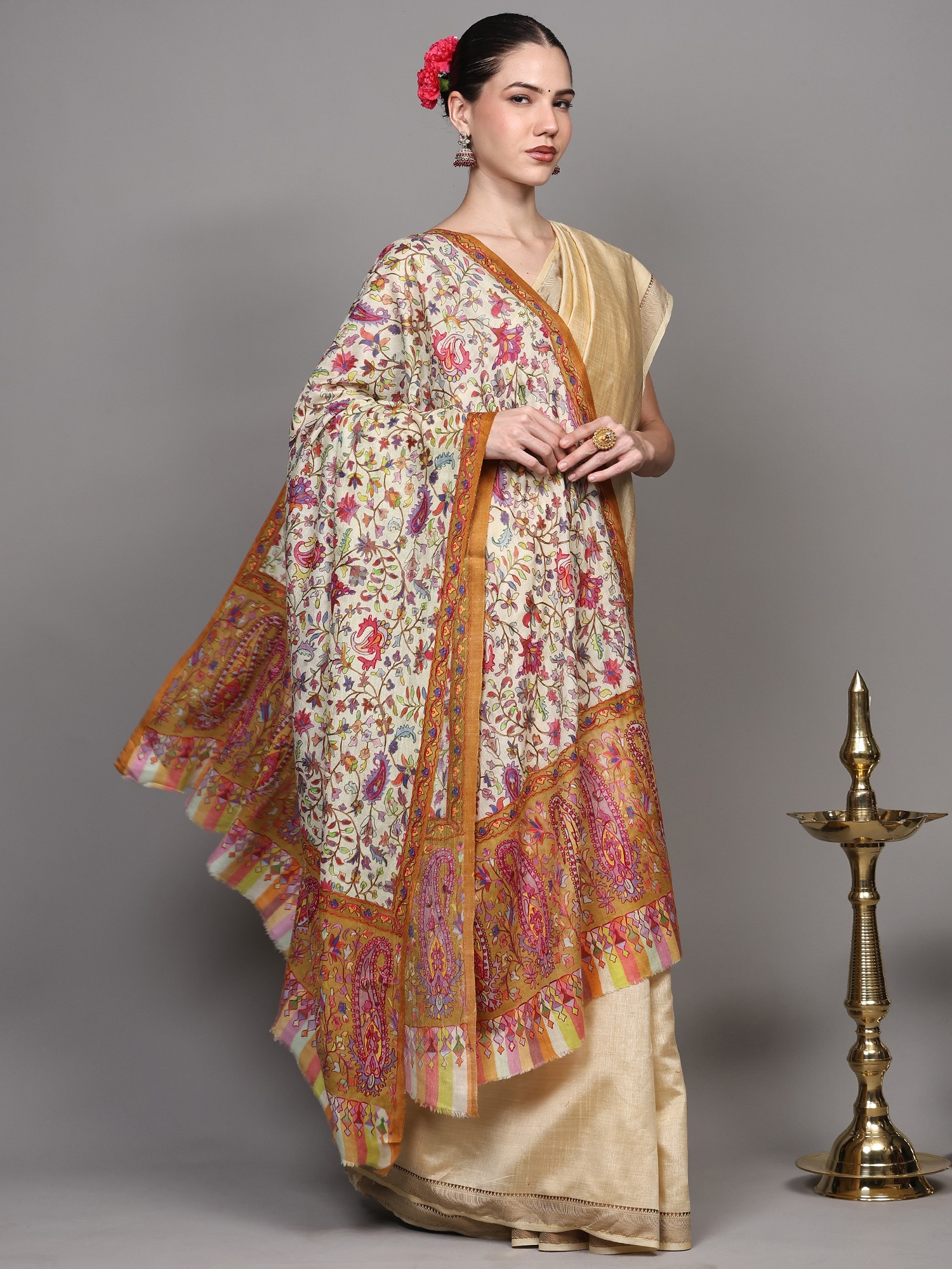 Multicolor Floral Motif Kalamkari Shawl with Chain Stitch Embroidery