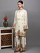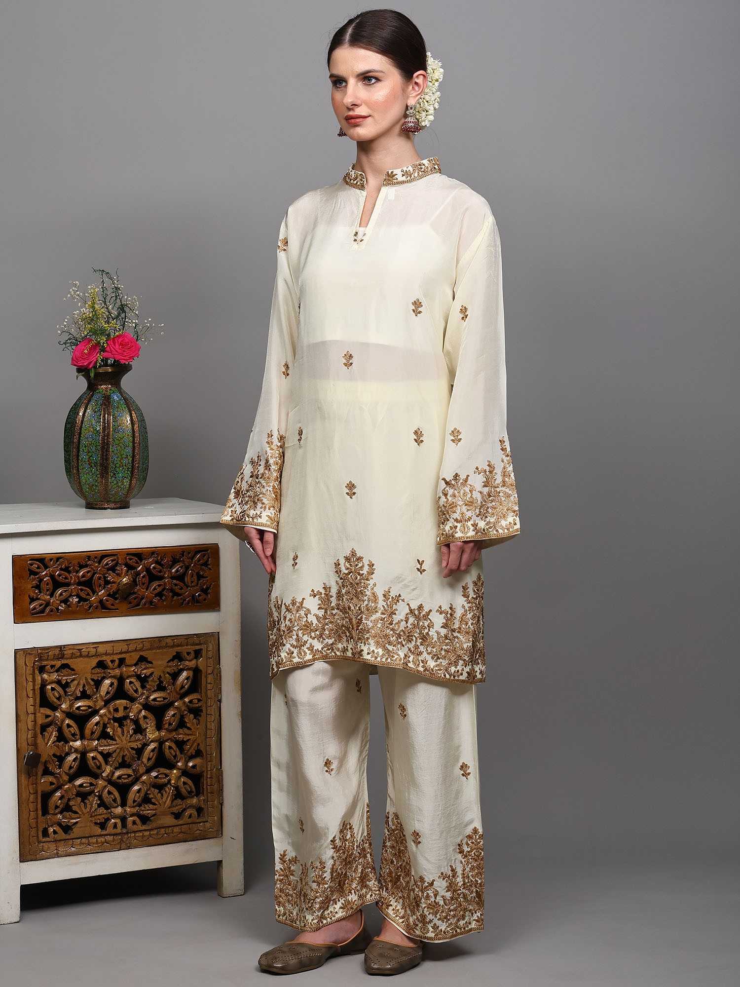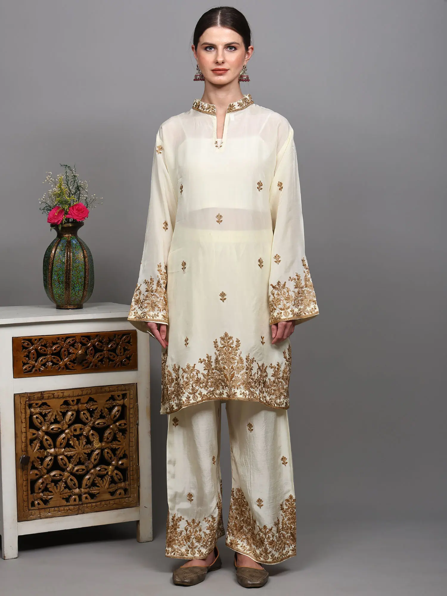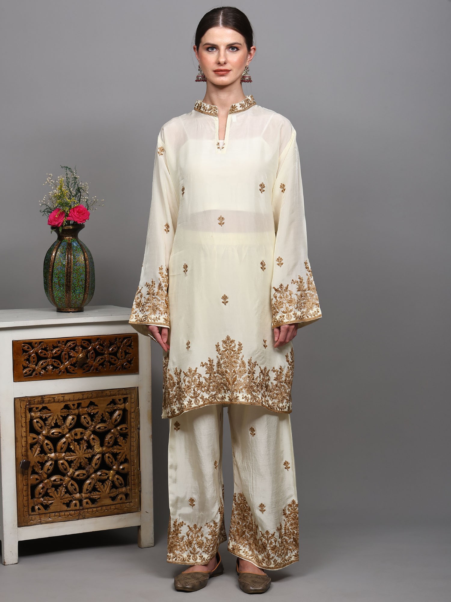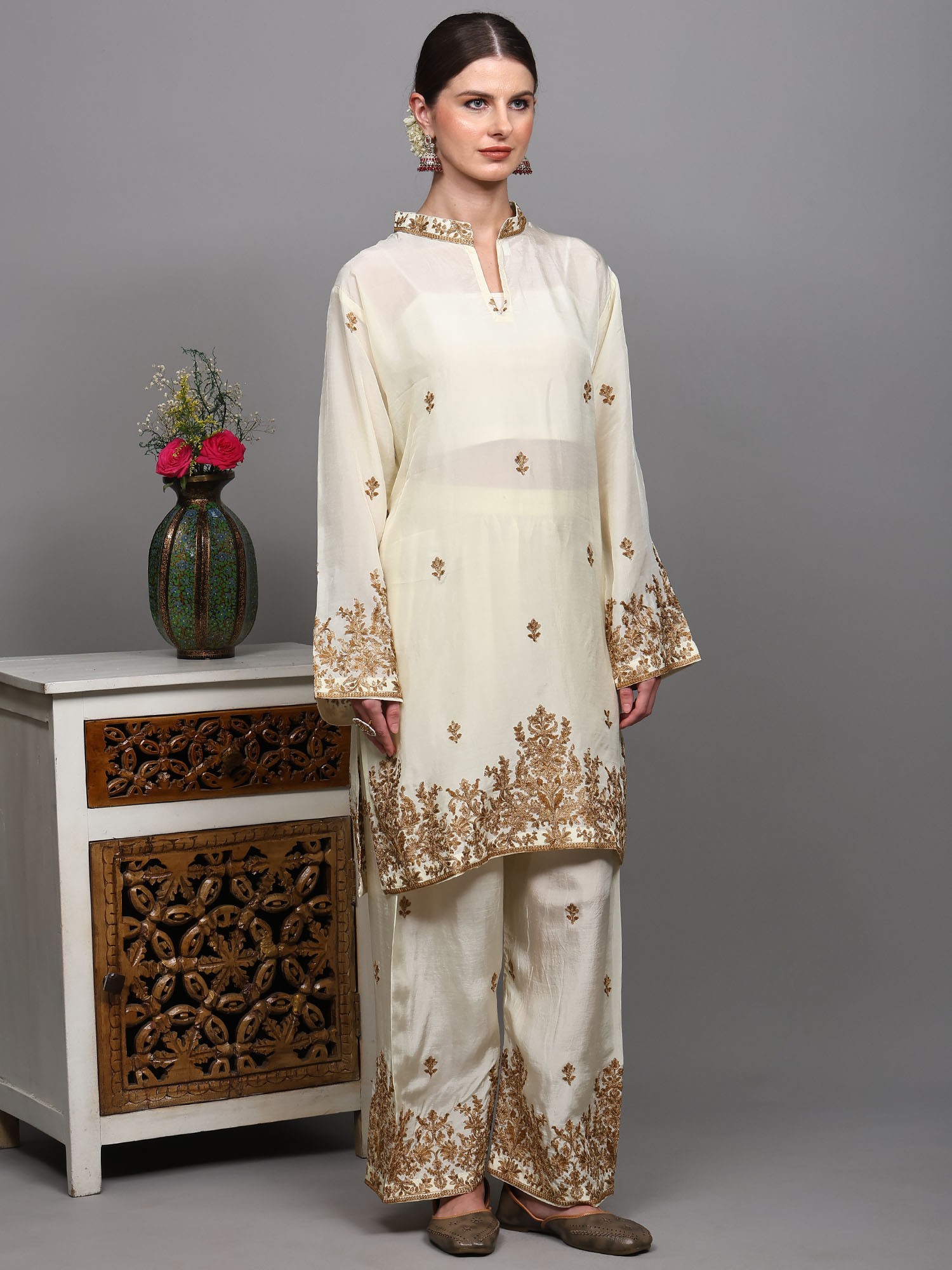 Spectra-Green Georgette Saree from Kashmir with Aari Embroidered Floral Motifs
