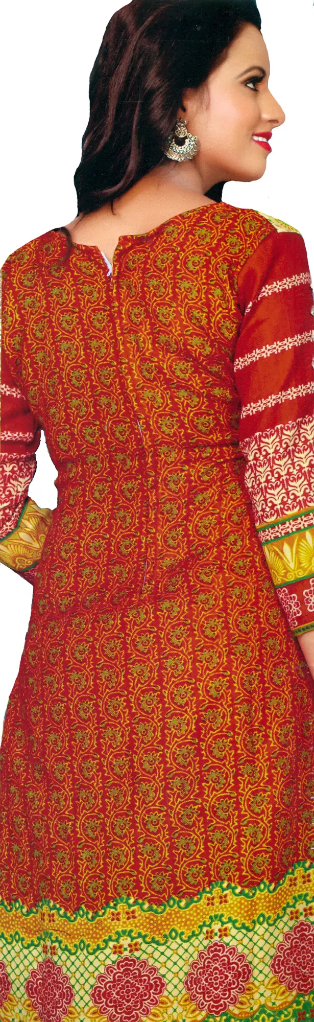 The neckline and hem of the kameez are adorned with a richly detailed print in vibrant shades of red, green, and gold. This eye-catching border work is reminiscent of traditional block prints, adding a touch of artisanal charm. The sleeves are designed with a complementary print and finished with a delicate lace-like border, enhancing the overall elegance of the garment. The striking red churidar bottoms provide a bold contrast to the pearled-ivory kameez, creating a balanced and visually appealing silhouette. ––––––––––––––––––––