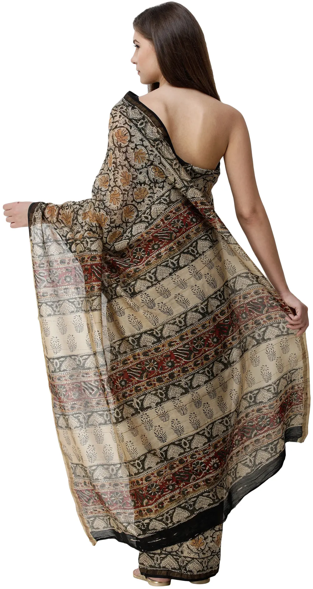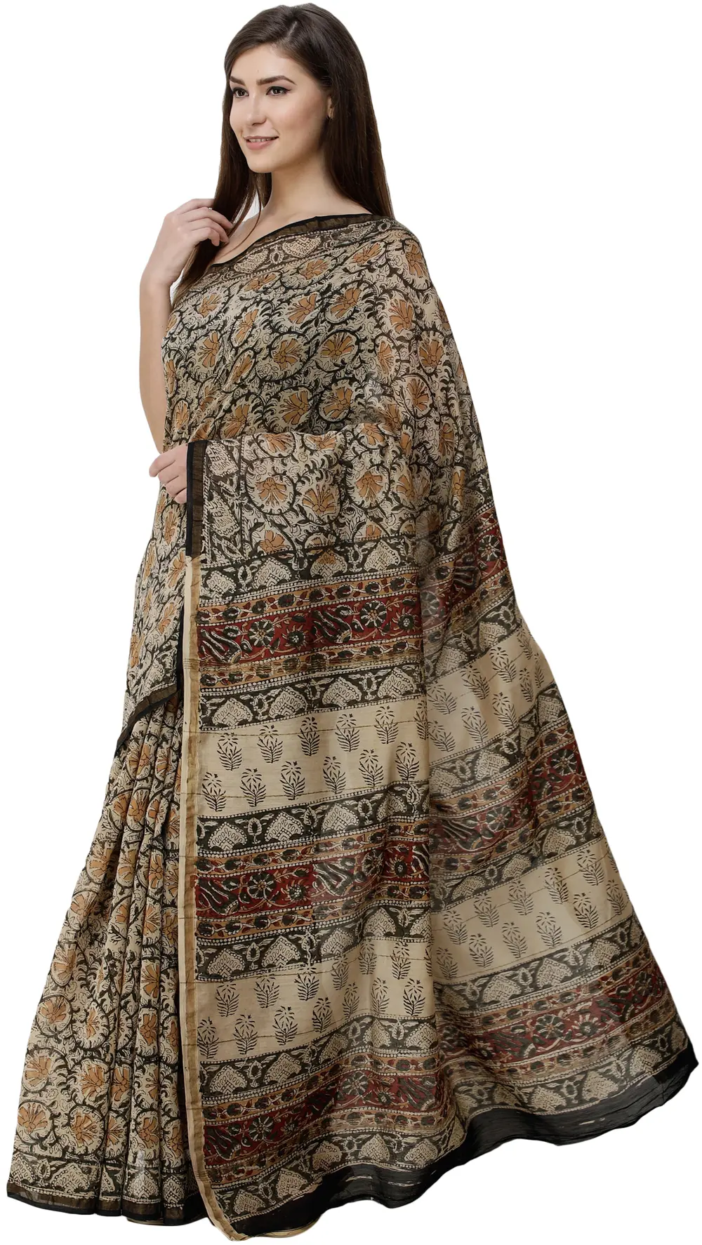 Pebble Kalamkari Sari from Telangana with Printed Flowers All-Over