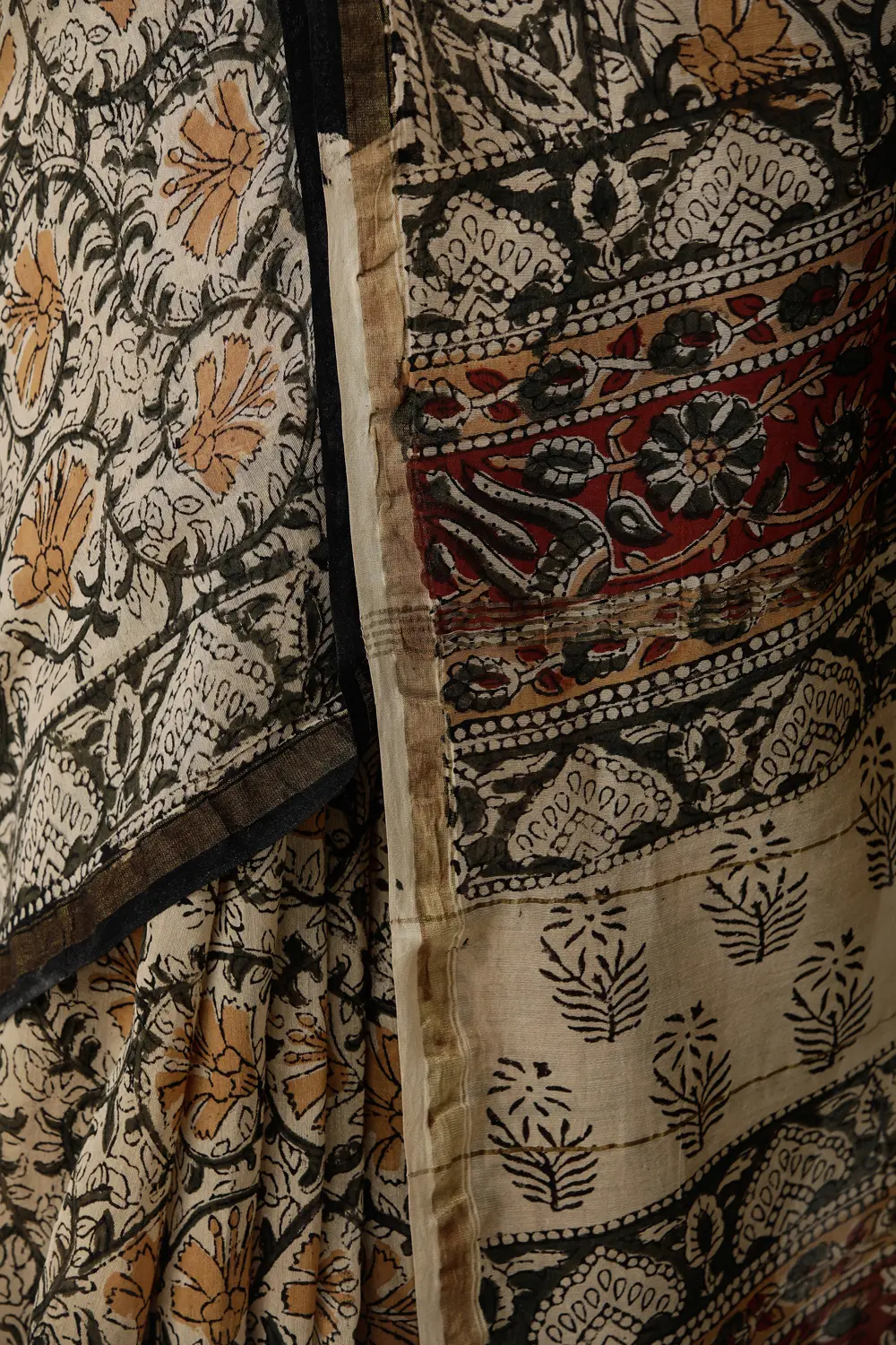 Complementing the all-over floral design, the sari features a striking border that adds a layer of visual intrigue. This border showcases a series of intricately designed horizontal bands, incorporating a rich tapestry of patterns and colors. Deep reds, warm browns, and earthy beiges are artfully arranged, creating a vibrant contrast that draws the eye. Within these bands, you'll find further Kalamkari artistry, with geometric patterns and stylized motifs that echo the floral theme while offering a distinct visual rhythm. The interplay between the all-over print and the meticulously crafted border creates a balanced and harmonious aesthetic, ensuring this sari is as captivating from afar as it is up close.