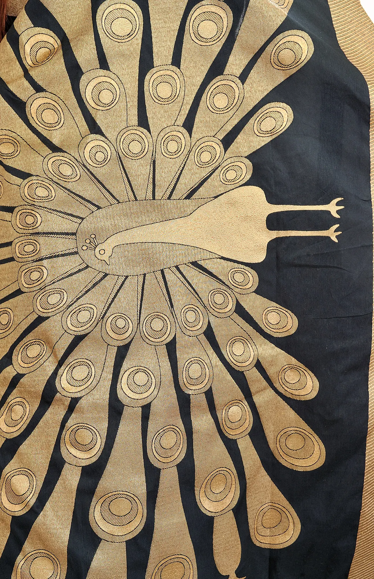 The black color chosen for the saree gives it a stunning depth, while the bold and beautiful peacock dancing on its field with its contemporary form and detailing brings a sense of joy, celebration and beauty to the attire.