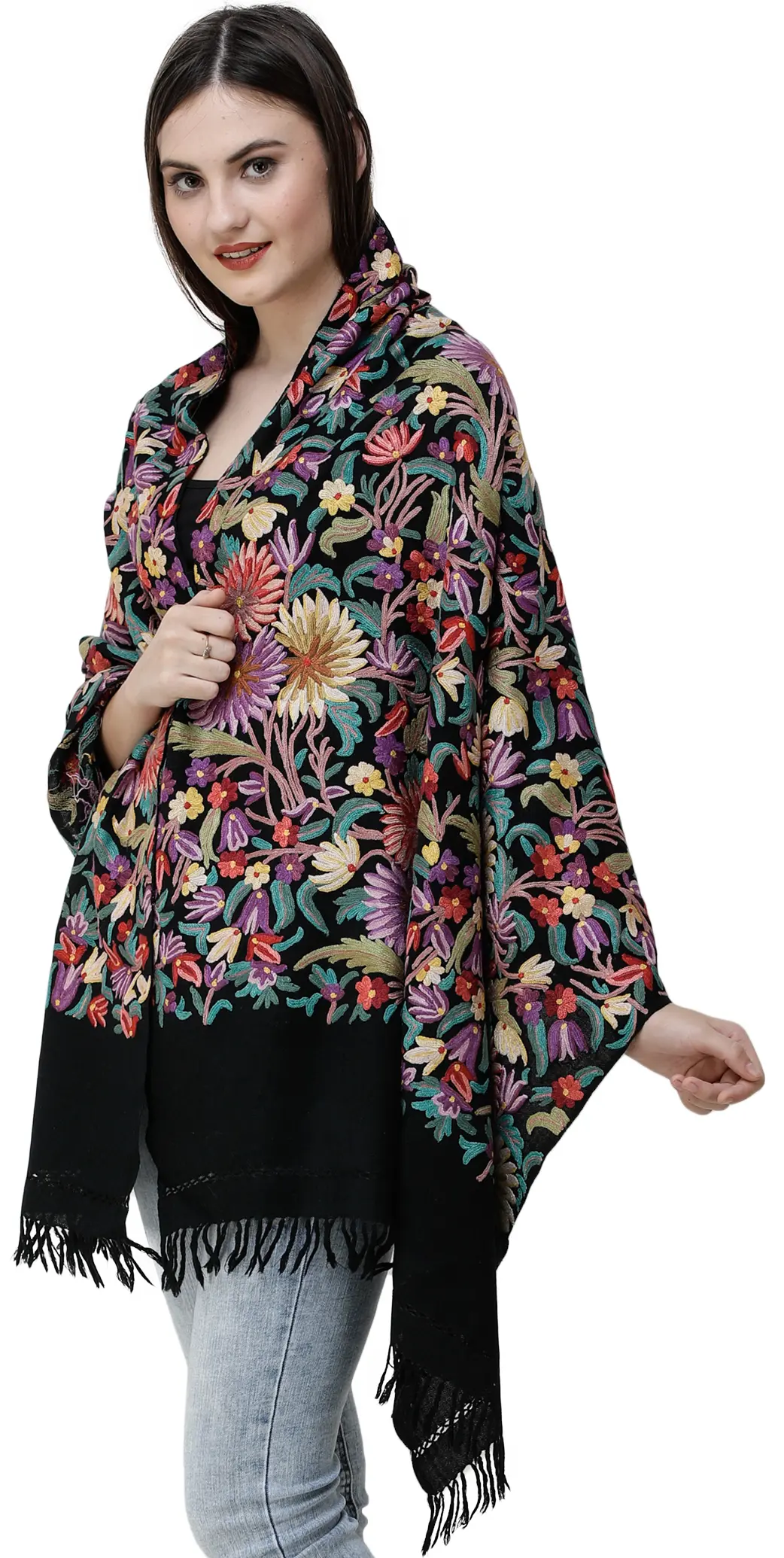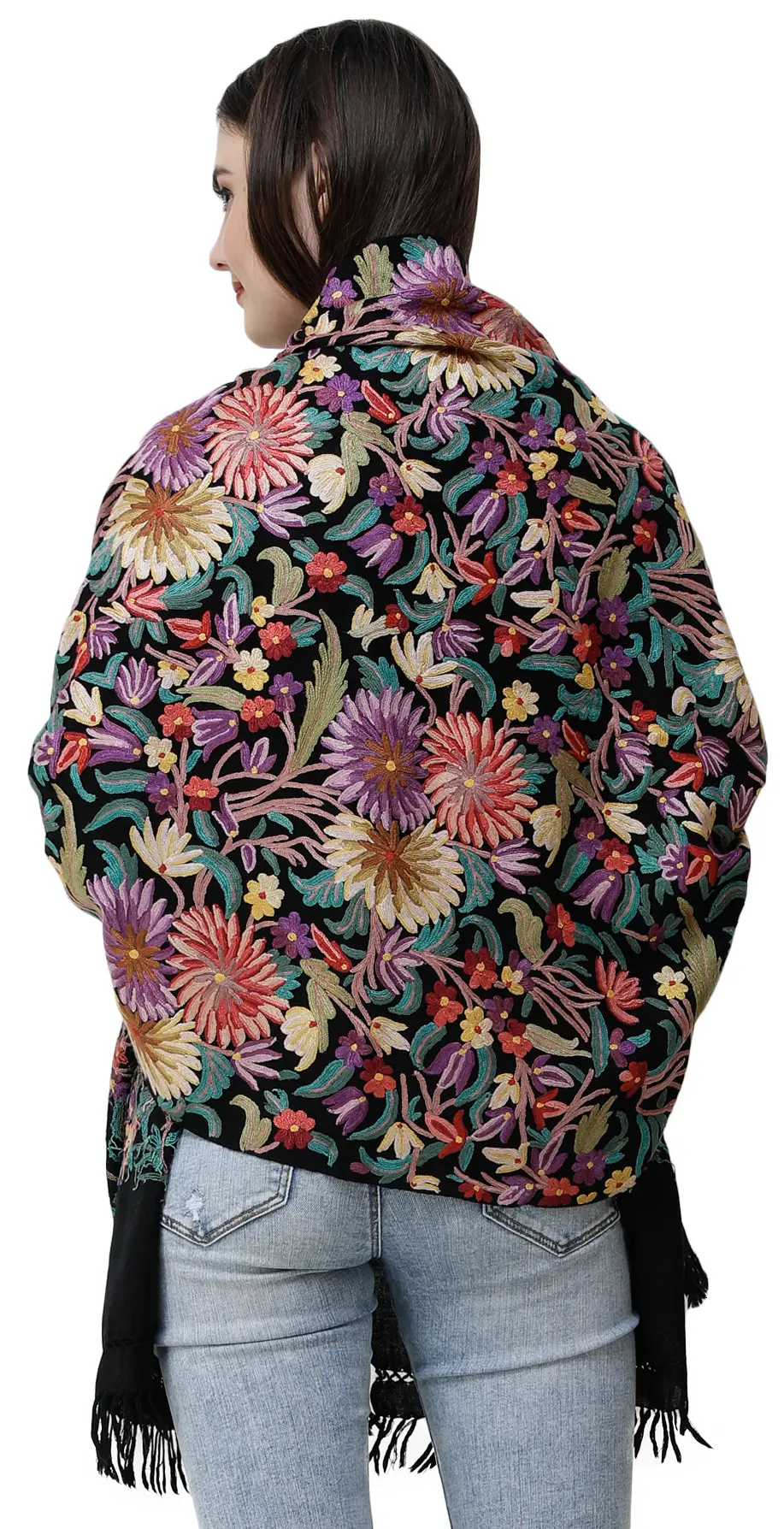Immerse yourself in the rich heritage of Kashmiri craftsmanship with this exquisite stole, a true testament to the artistry passed down through generations. The deep, phantom-black base provides a dramatic backdrop, allowing the vibrant, multicolored Aari embroidery to truly sing. Each stitch is a deliberate stroke of a brush, meticulously forming a breathtaking tapestry of flowers and foliage that cascades across the pure wool fabric. This is not merely an accessory; it's a wearable piece of art, imbued with the soul of skilled artisans.