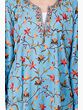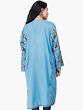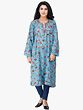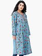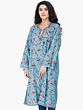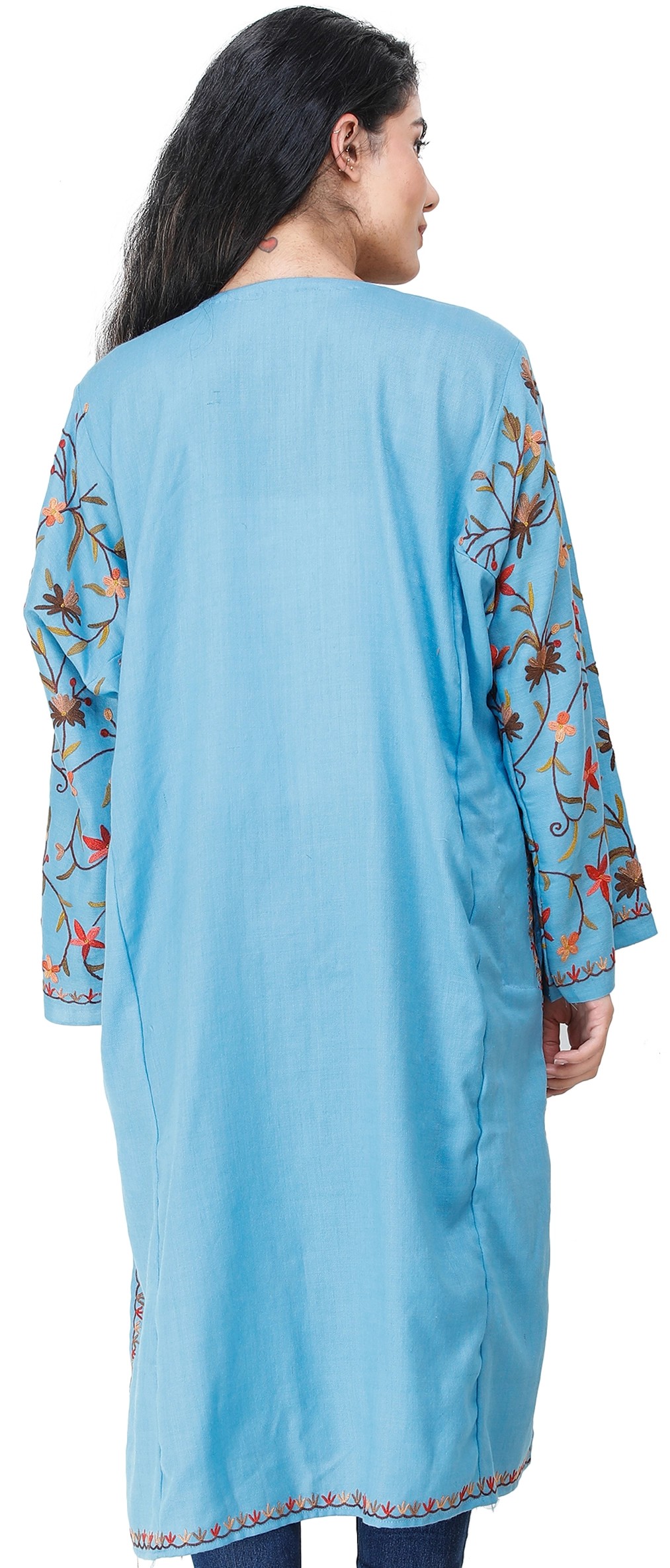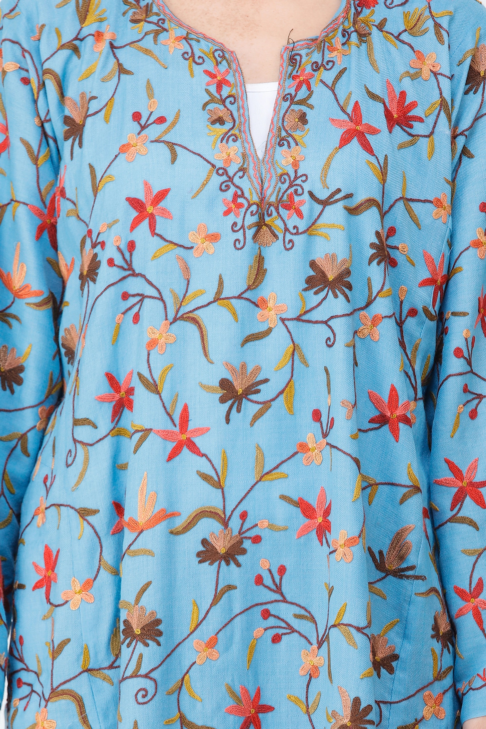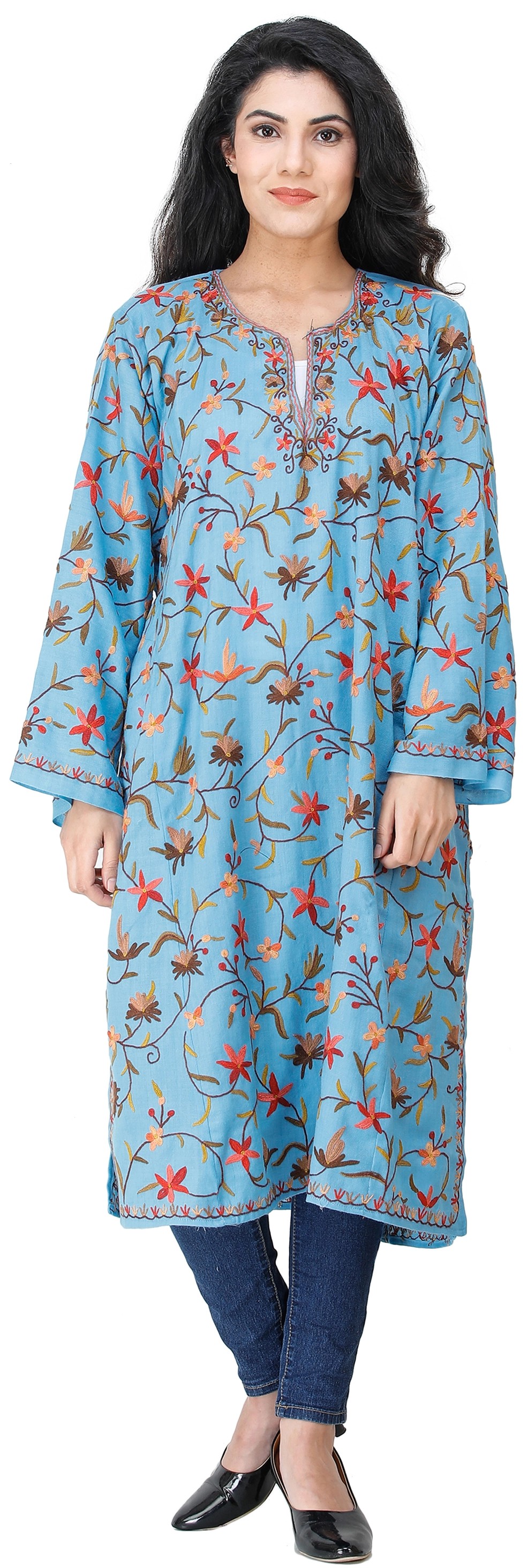 A traditional phiran for women is generally very long, touching the feet, however a relatively modern variation has conquered the markets now, as shown here, a pure wool phiran extending a little longer, below the knees with side slits and is ari embroidered in colorful flowers and a thin border of coiled vines with an exclusive styled neck.