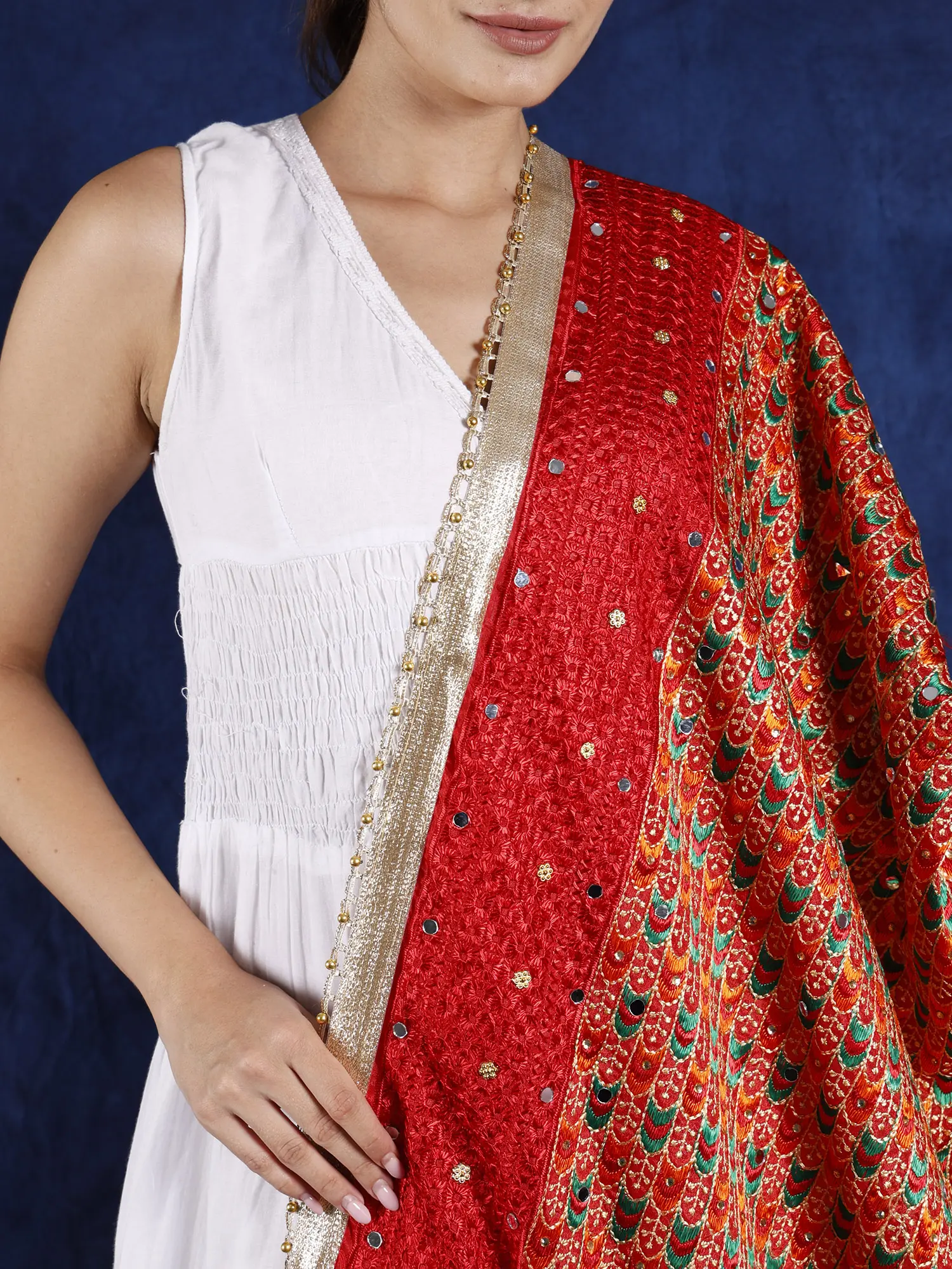 Multicolor Embroidered Phulkari Dupatta from Punjab with Mirrors and Beaded Zari Border