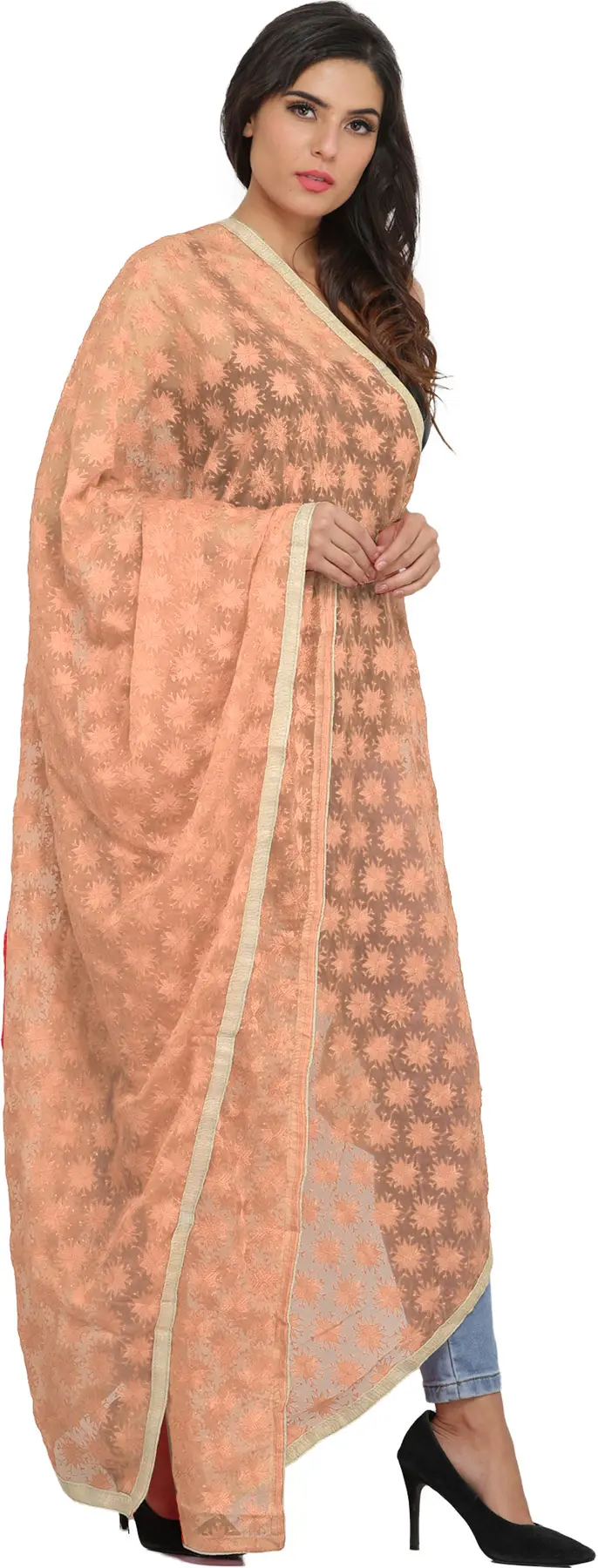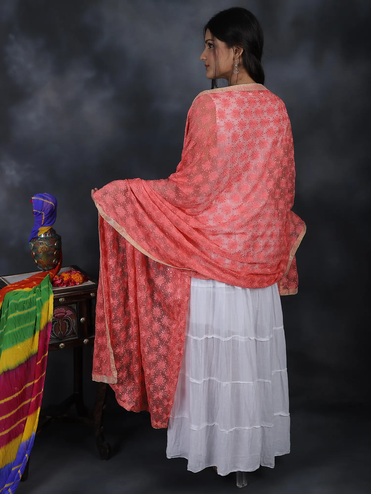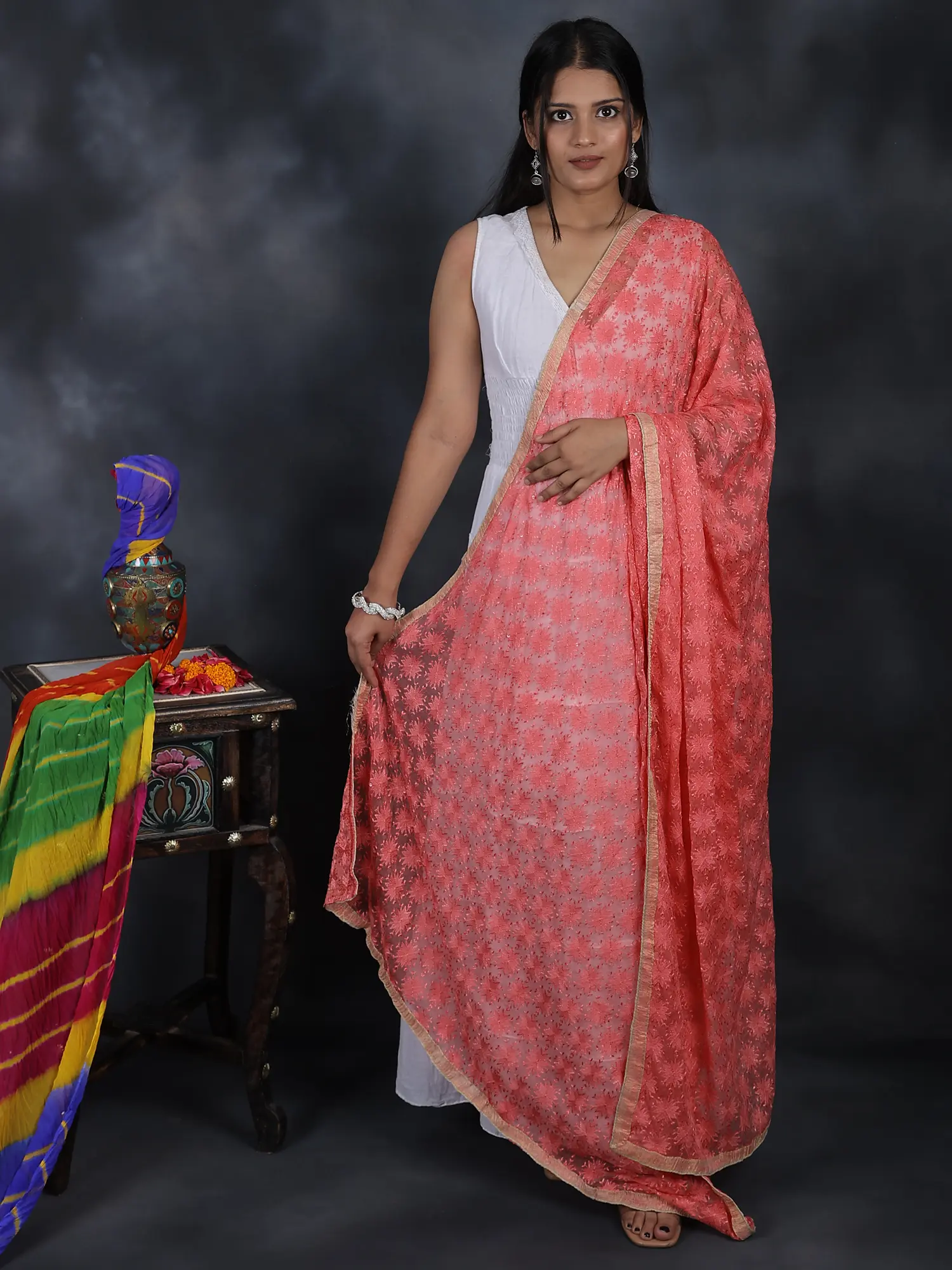 Crafted from a lightweight and breathable chiffon fabric, this dupatta drapes beautifully, offering both comfort and a graceful silhouette. The choice of chiffon ensures it is suitable for various occasions, from festive gatherings to everyday elegance. The dupatta is generously sized, providing ample fabric for versatile styling options. It can be elegantly draped over the shoulders, worn as a headscarf, or even incorporated into ethnic outfits to add a touch of sophisticated charm. The self-color thread embroidery creates a subtle yet captivating texture, allowing the intricate bootis (small floral motifs) to stand out with understated grace.