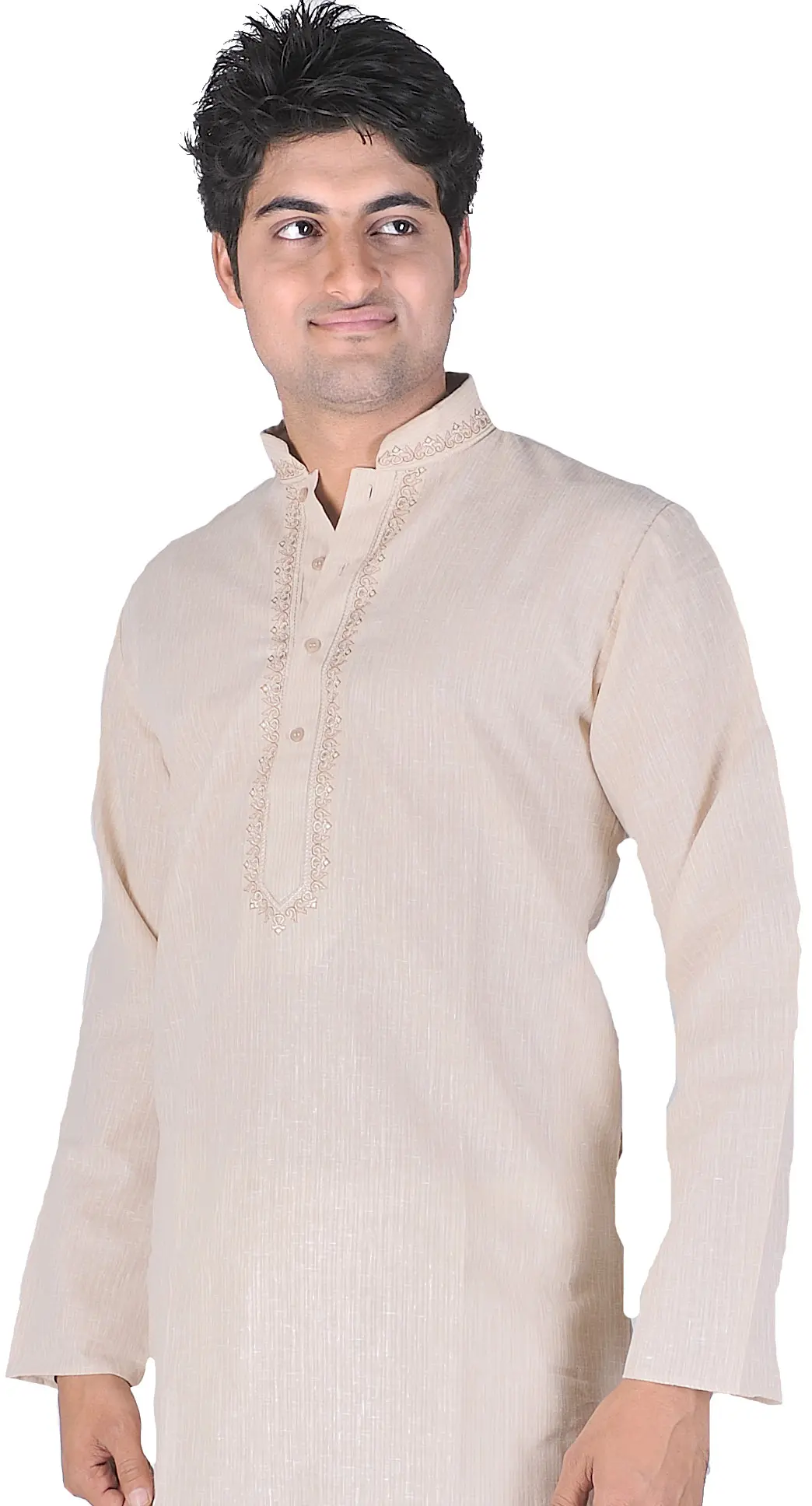 Pure Cotton Kurta Pajama with Thread Embroidery on Neck and Woven Stripes