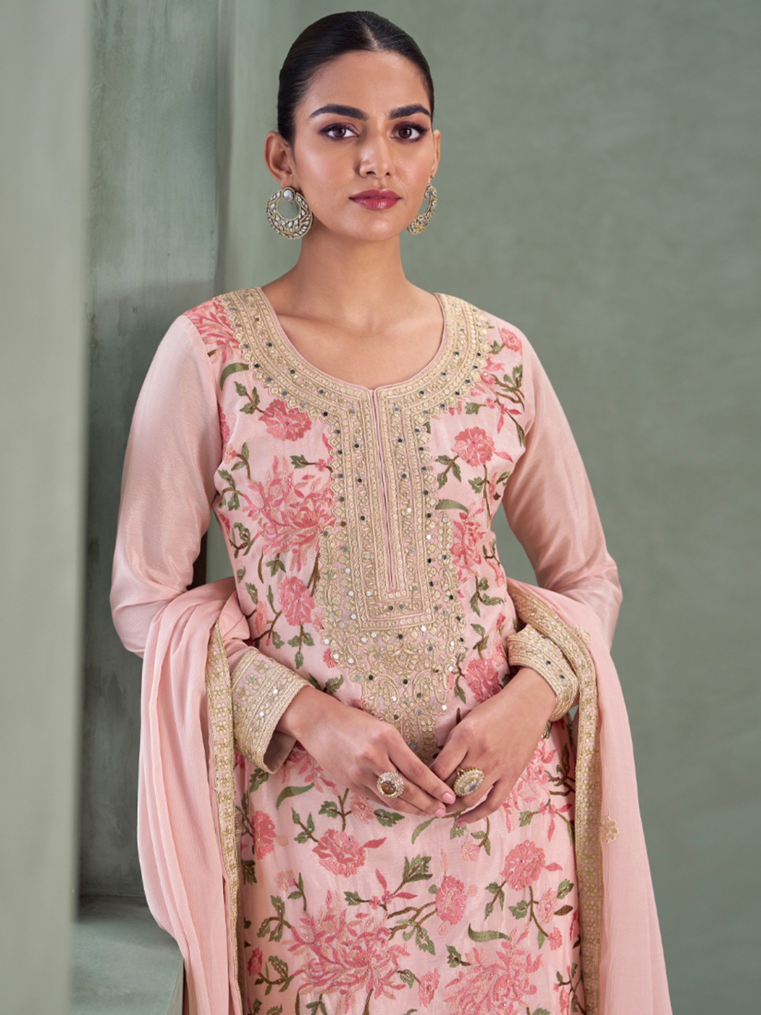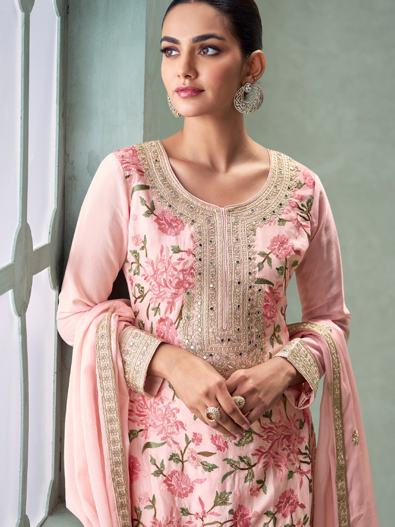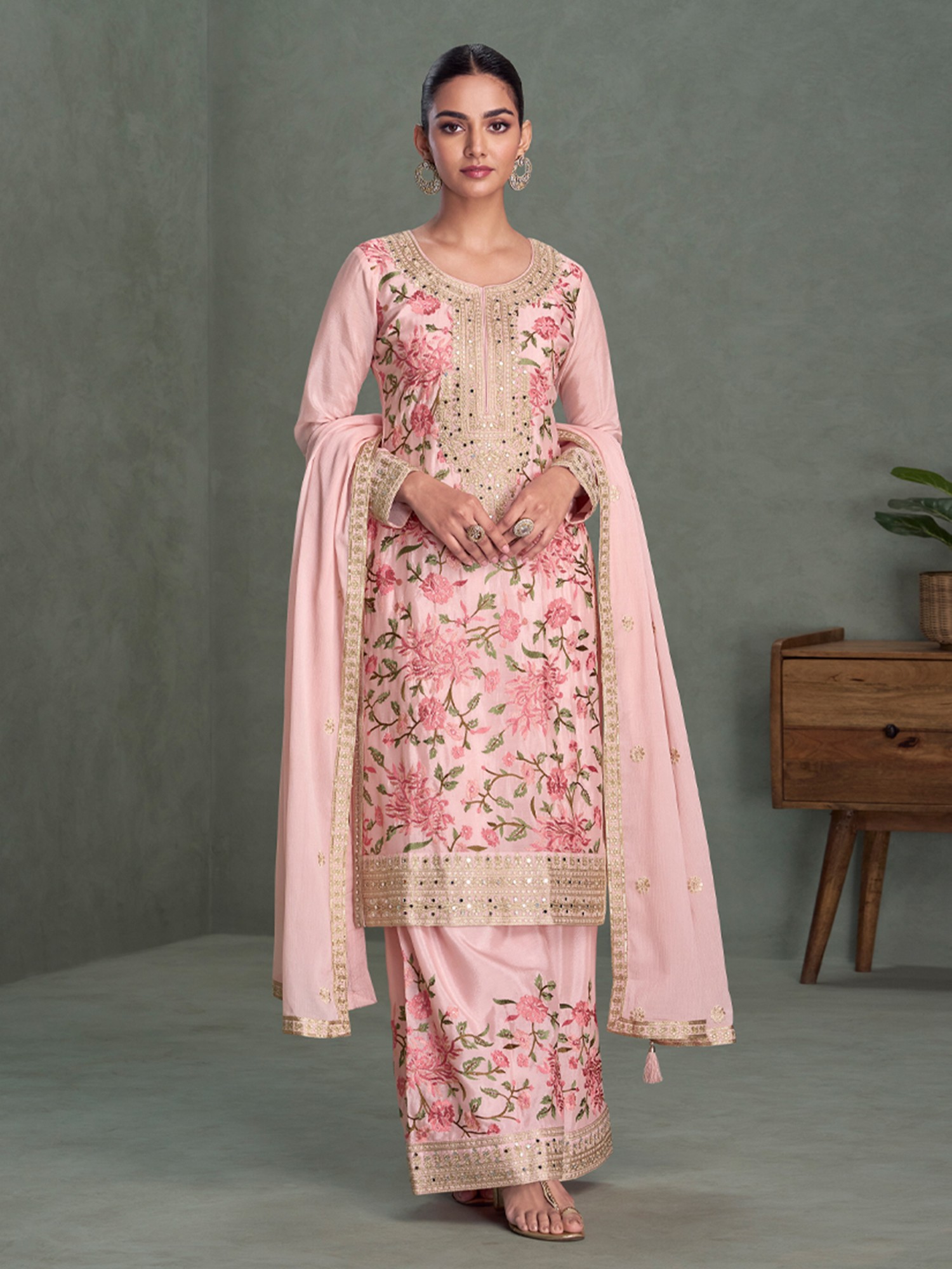 Imagine gracing a wedding, a festive gathering, or a special celebration adorned in this radiant pink ensemble. The vibrant yet soft color palette, combined with the intricate embroidery and the luxurious feel of the Chinon fabric, makes this suit an ideal choice for creating unforgettable memories. It's more than just an outfit; it's an expression of grace, tradition, and contemporary fashion that will undoubtedly turn heads and earn you admiring glances. Elevate your ethnic wear collection with this stunning piece that promises style and elegance for any celebratory affair.