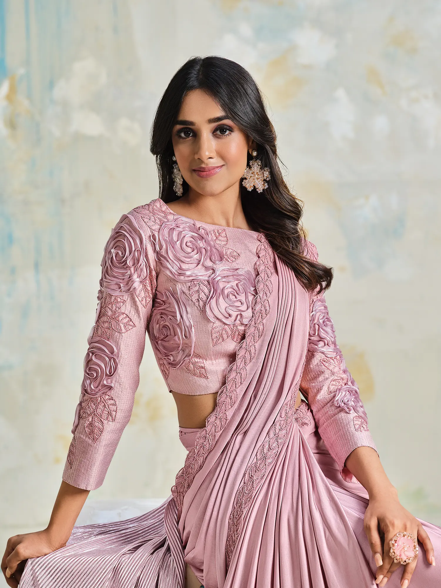 Pink-Flare Applique Floral Embroidered Work Lycra Designer Saree With Attractive Tassels Pallu