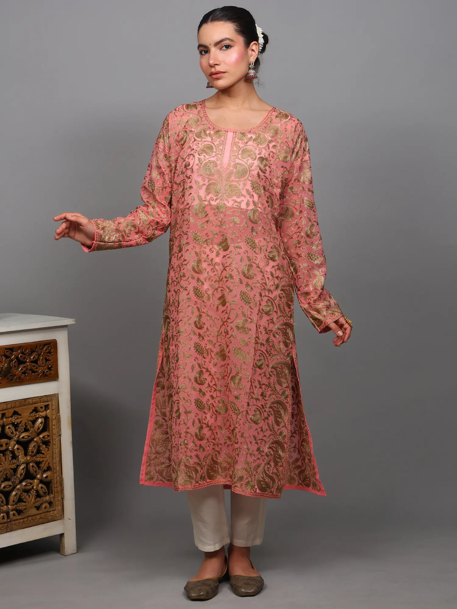 This kurti is a testament to timeless style and versatility. Its graceful length and elegant embroidery make it an ideal choice for a variety of events. Pair it with cream or white palazzos for a chic and comfortable daytime look, perfect for casual outings or luncheons. For more formal gatherings, complement it with matching silk trousers and statement jewelry to create a show-stopping ensemble. The inherent elegance of the georgette and the richness of the gold embroidery also make this kurti suitable for festive celebrations, family get-togethers, or even semi-formal evening events.