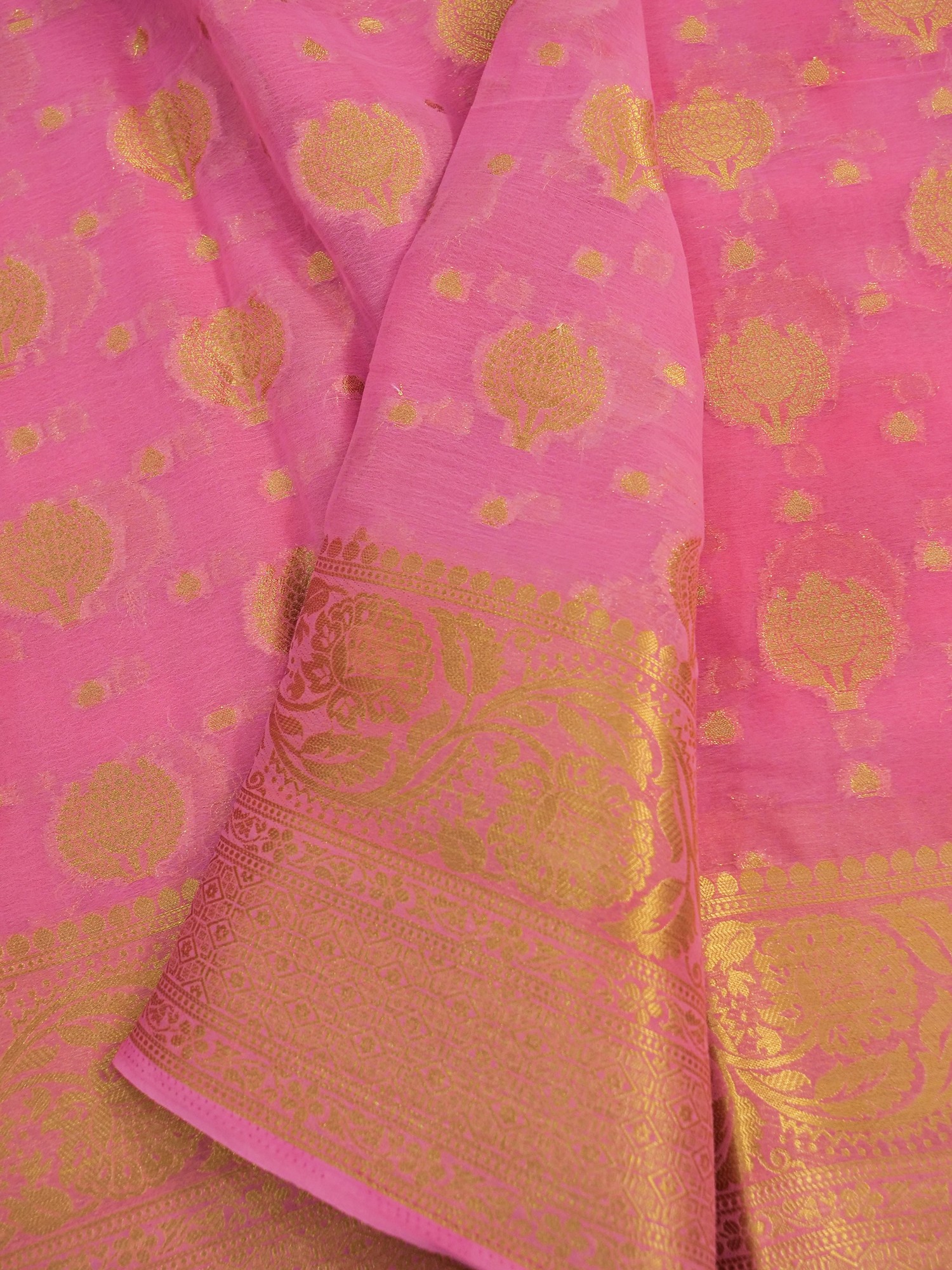 The monotone pink chiffon Banarasi Saree is a lovely attire for parties and special occasions where you want to grace the event looking like a fresh lotus blossom. The fabric of chiffon ensures that you get a light and uncrinkled drape throughout any party, while you flaunt the exquisite detailing on this partywear Banarasi saree.