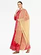 Completing this resplendent look is a lightweight Chanderi dupatta. Known for its sheer texture and subtle sheen, Chanderi fabric offers an ethereal contrast to the rich velvet. The dupatta is edged with a fine gold border that mirrors the embroidery on the kurti and sharara, ensuring a harmonious aesthetic. Its delicate weave and graceful fall add an element of sophistication, allowing it to be draped in various elegant styles. The airy nature of the Chanderi makes it comfortable to wear, even during warmer festivities, while still adding a touch of glamour.