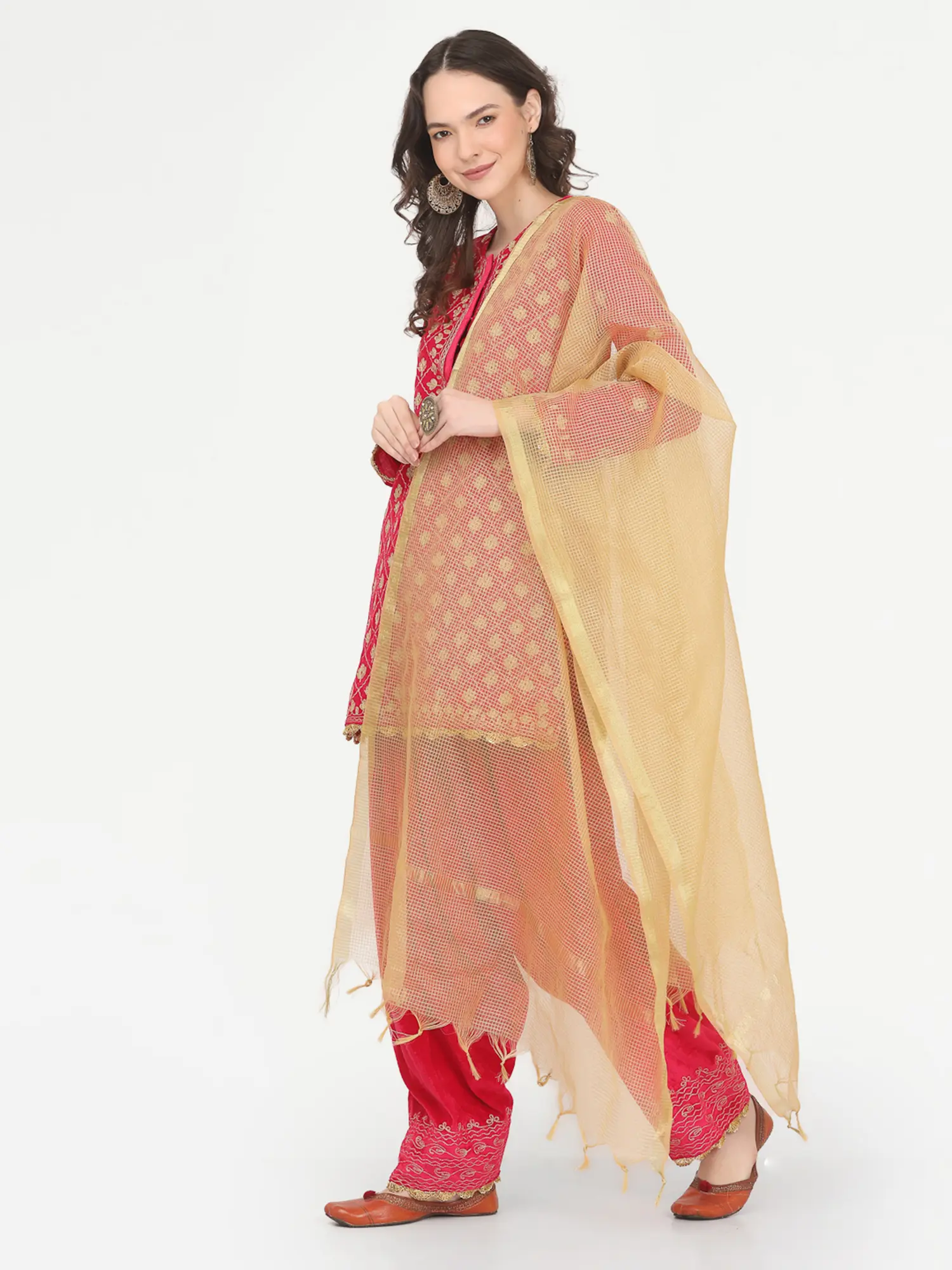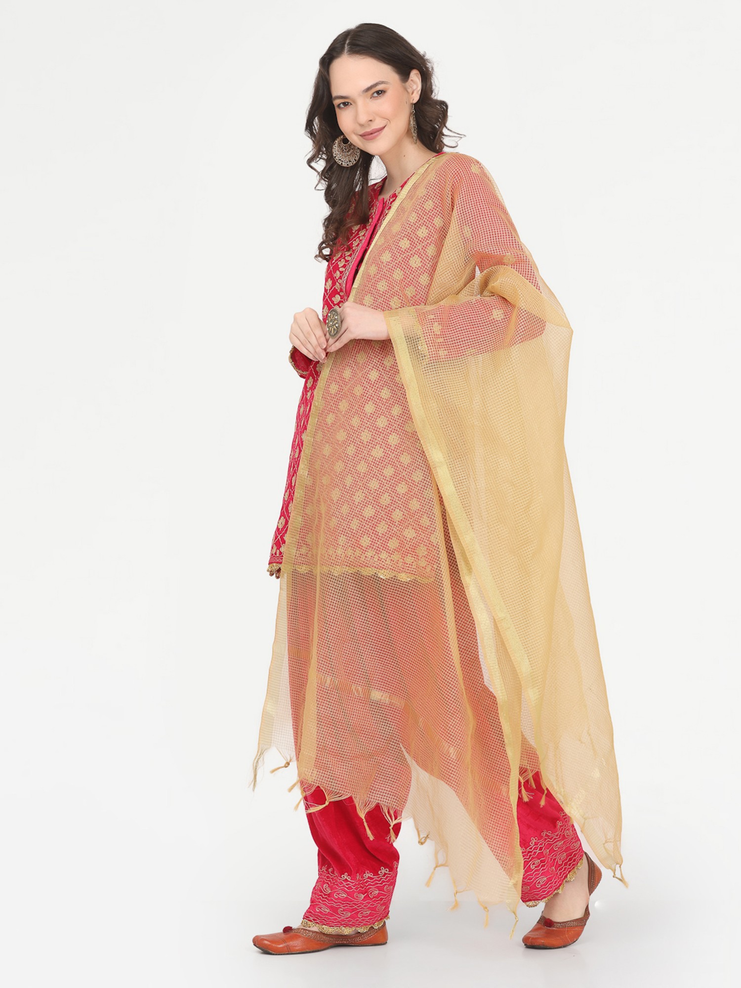 Complementing the richness of the velvet kameez is a resplendent Chanderi silk dupatta. This lightweight and sheer dupatta is adorned with a delicate golden weave that mirrors the embroidery on the kameez, creating a cohesive and elegant look. The traditional Chanderi fabric, known for its lustrous sheen and fine texture, adds an ethereal grace to the ensemble. The dupatta is generously sized, allowing for versatile draping styles, whether you prefer a classic, flowing drape or a more structured arrangement. The golden border of the dupatta, with its subtle fringe, adds a final touch of refined detail.