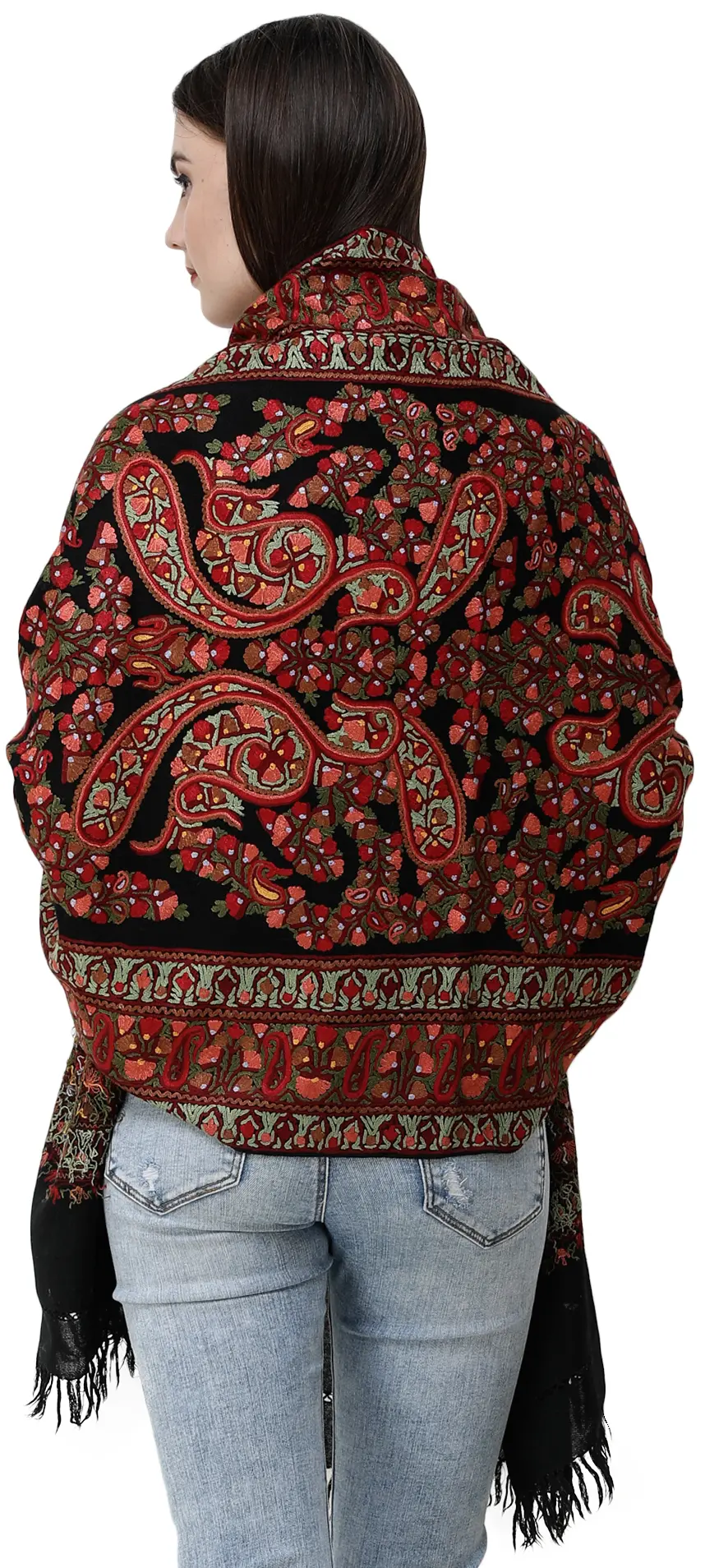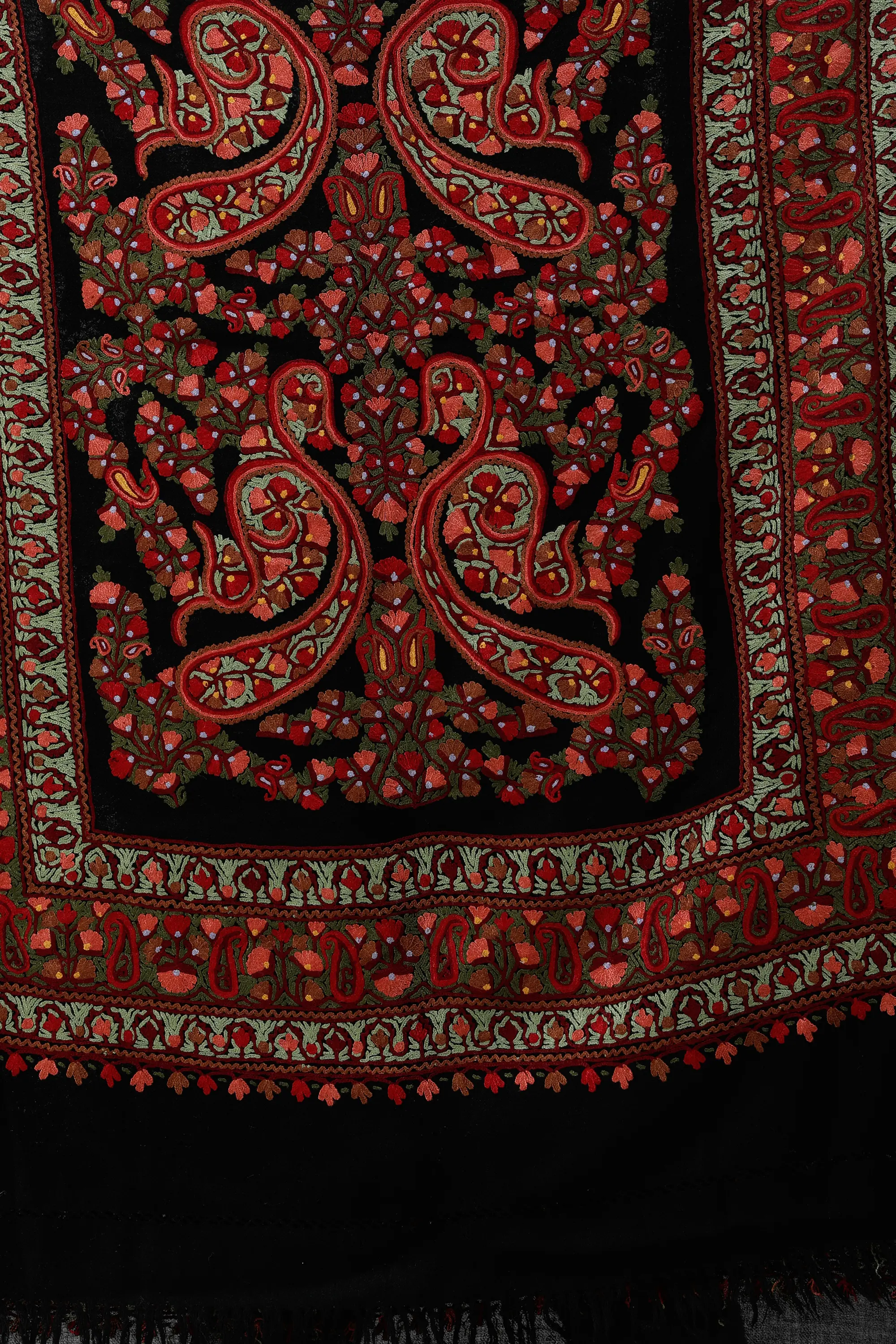 Kashmiri hand embroidery continues to be one of the most unique forms of art with an exquisite needle and thread work. This Kashmiri stole is stitched specifically for winters in a pirate black shade with the base of pure wool to give warmth. The attractive feature is the neat and clean use of multicolored threads to create flower patterns all over.