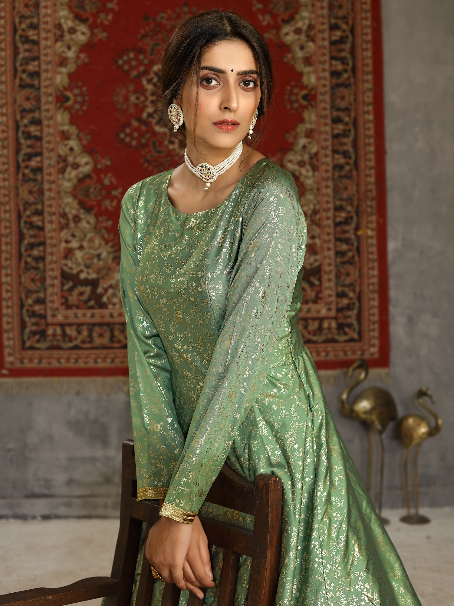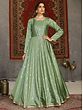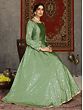 A muted shade of regal green, this Pista-green Anarkali gown has been crafted using the luxurious taffeta fabric and embellished with metallic work that gives the dress a stunning charm. The neckline and sleeves of the gown are stitched with a tasteful simplicity, to let the fabric and the pattern take centre stage. With an intricate floral pattern all over and an ethnic golden patti border on the hem, this Anarkali gown is a testament to the contemporary appeal of Indian fashion.