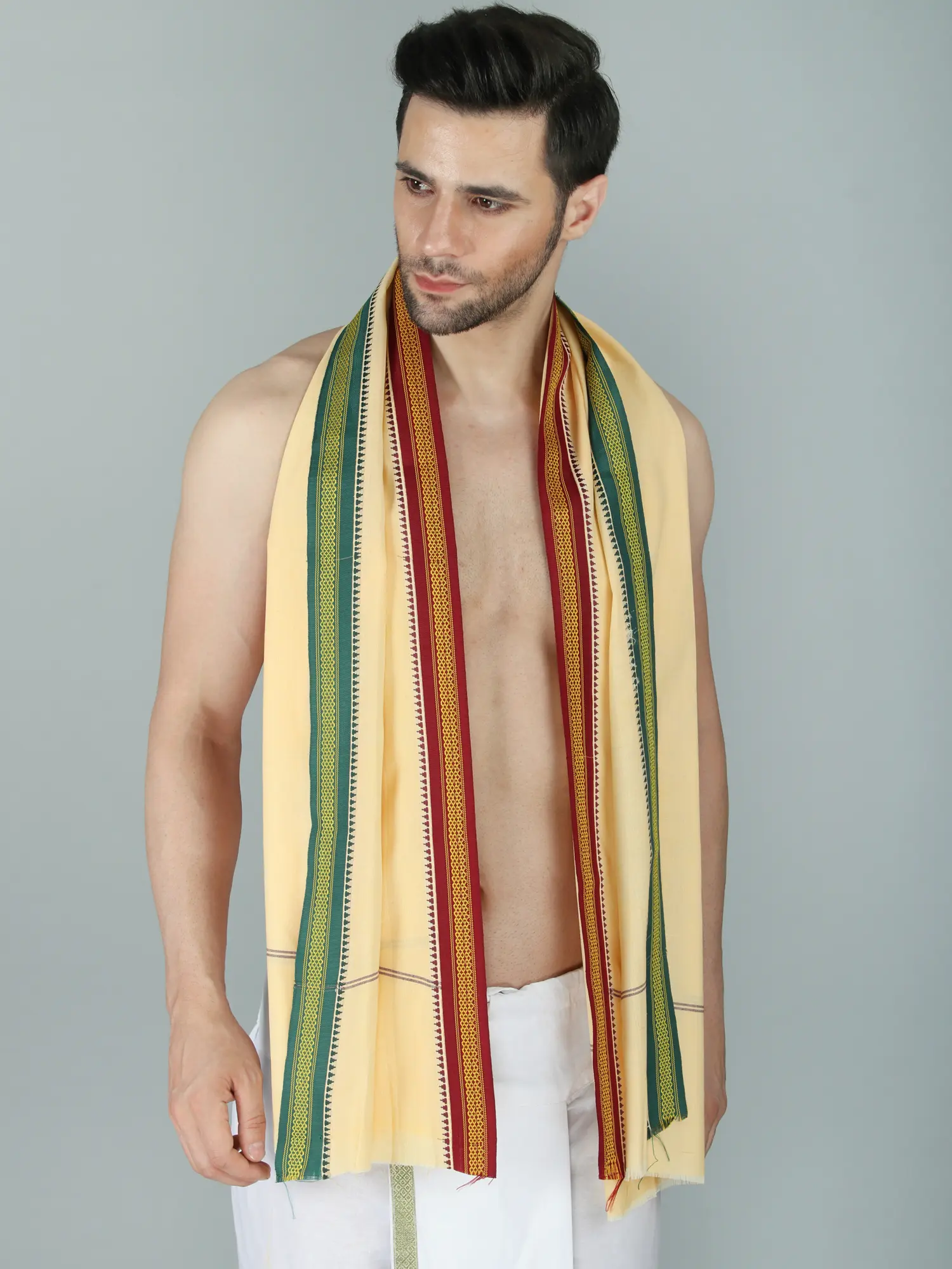 This angavastram is a versatile addition to any wardrobe. It drapes elegantly over the shoulders, complementing traditional Indian wear like dhotis, kurtas, and sherwanis. Whether you are attending a wedding, a religious ceremony, or a cultural event, this angavastram will undoubtedly enhance your look. Its generous size allows for various styling options, from a simple drape to a more elaborate arrangement. The lightweight nature of the fabric ensures it remains comfortable even when worn for extended periods. It is the ideal accessory to add a polished and distinguished finish to your traditional attire, making you stand out with effortless grace.
