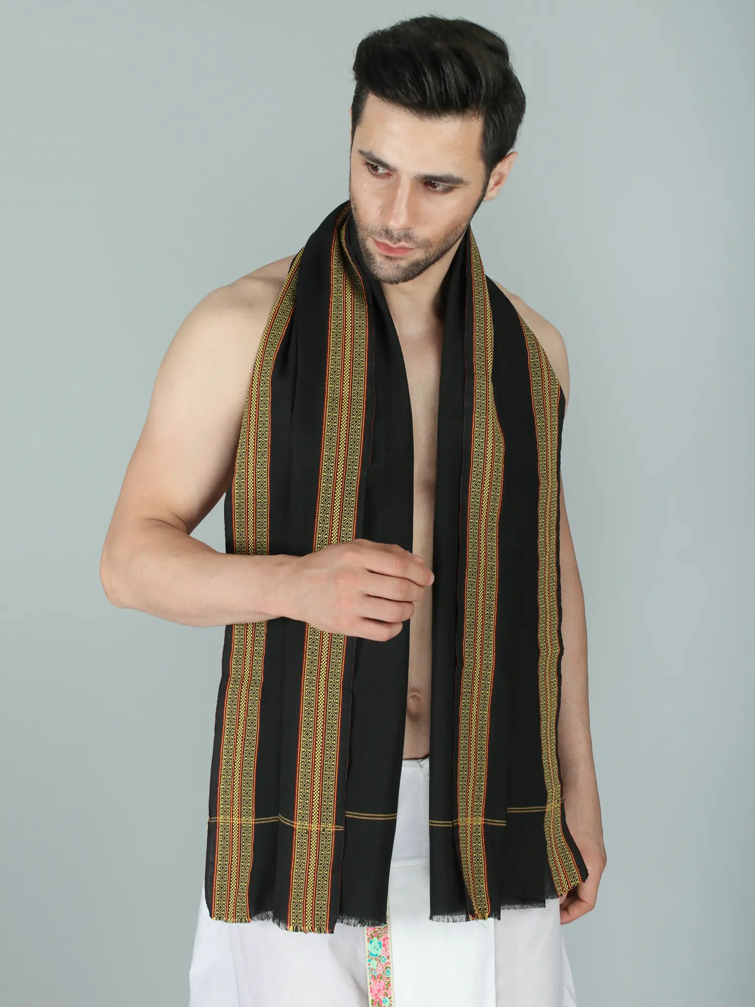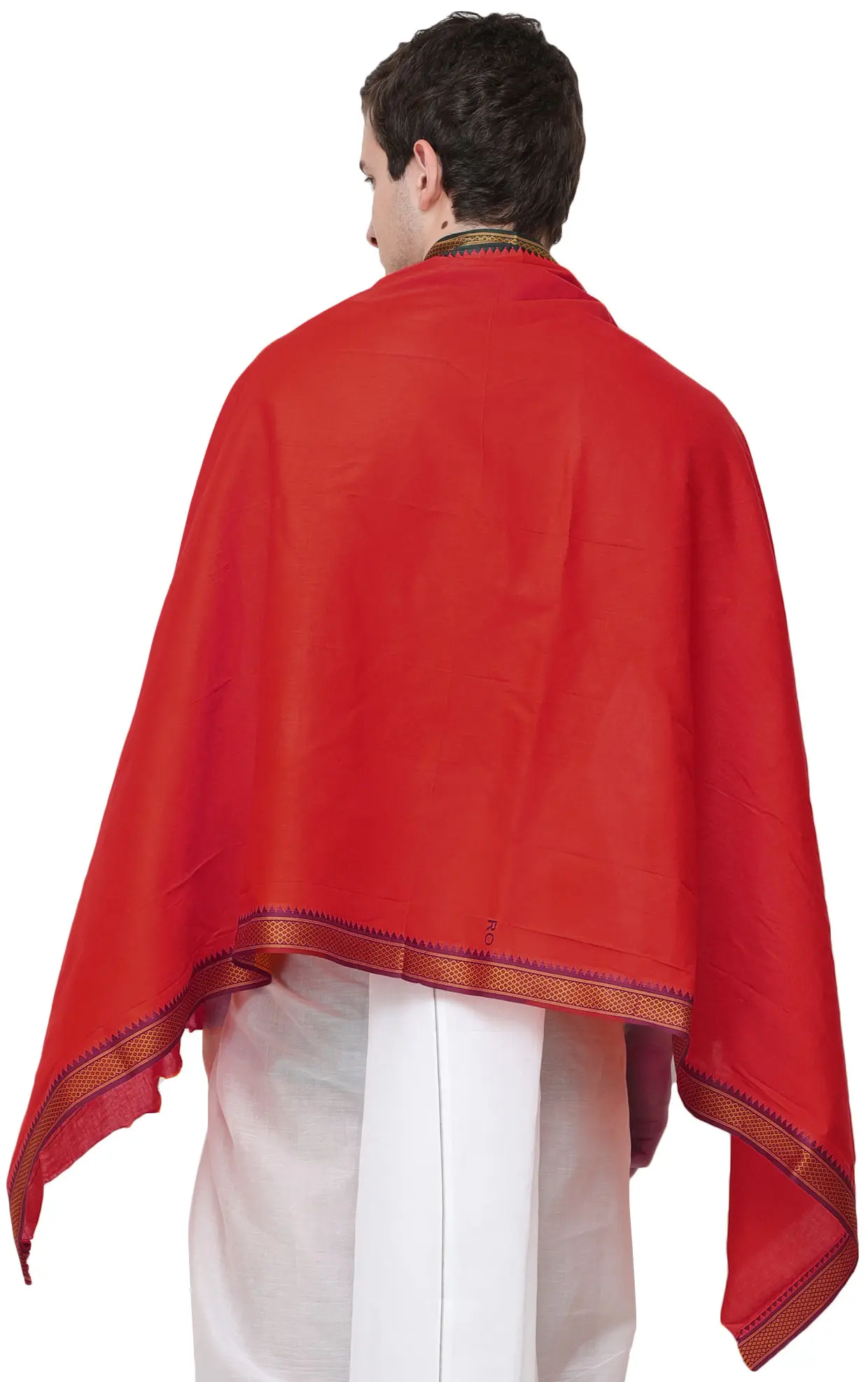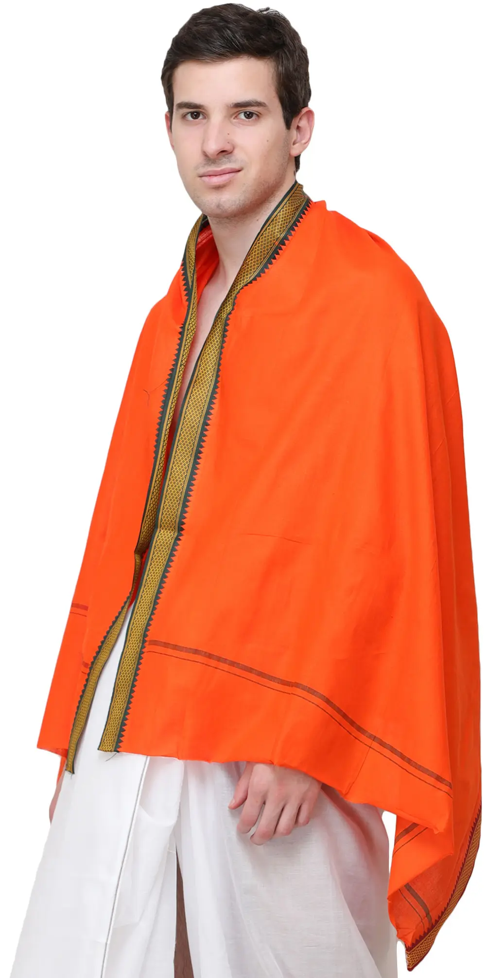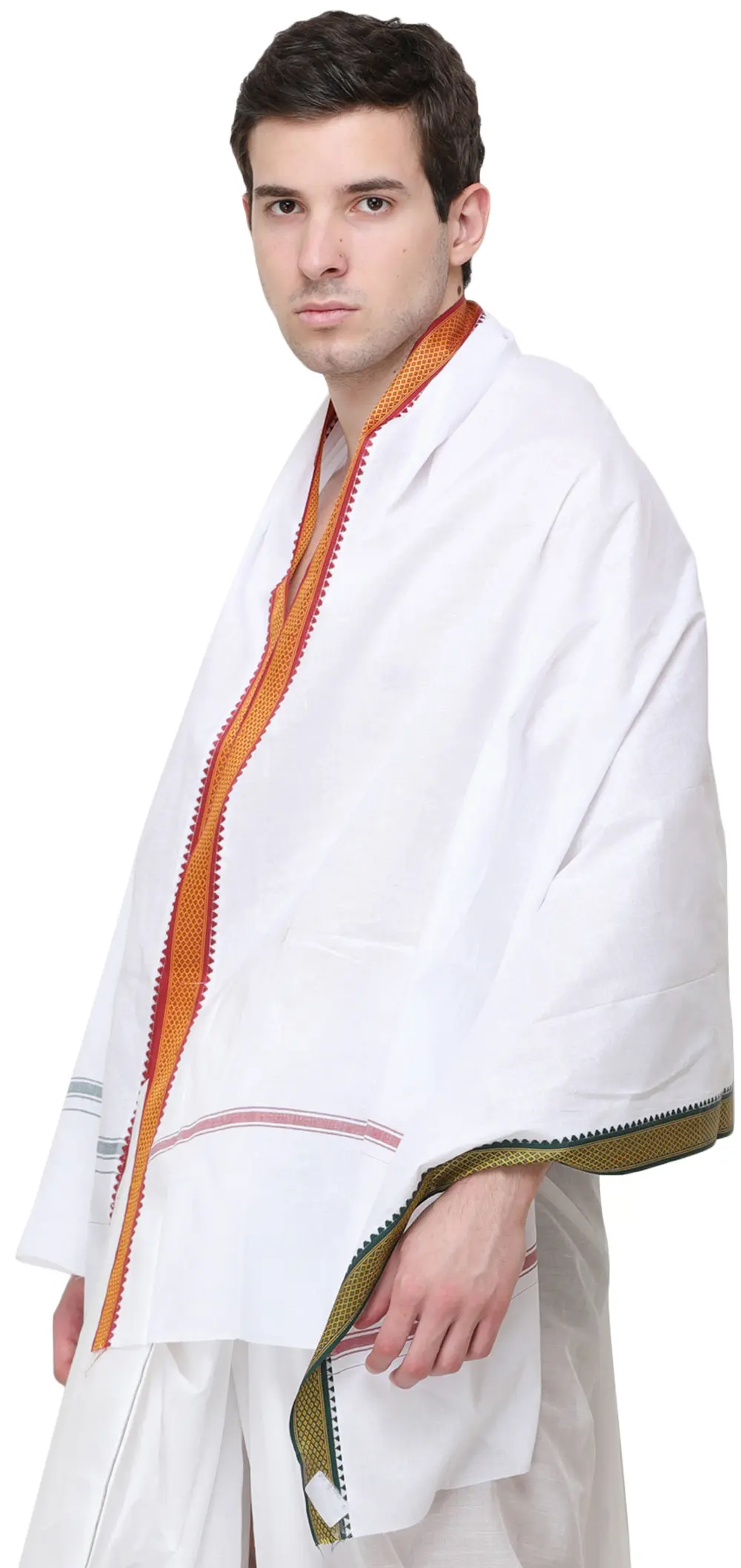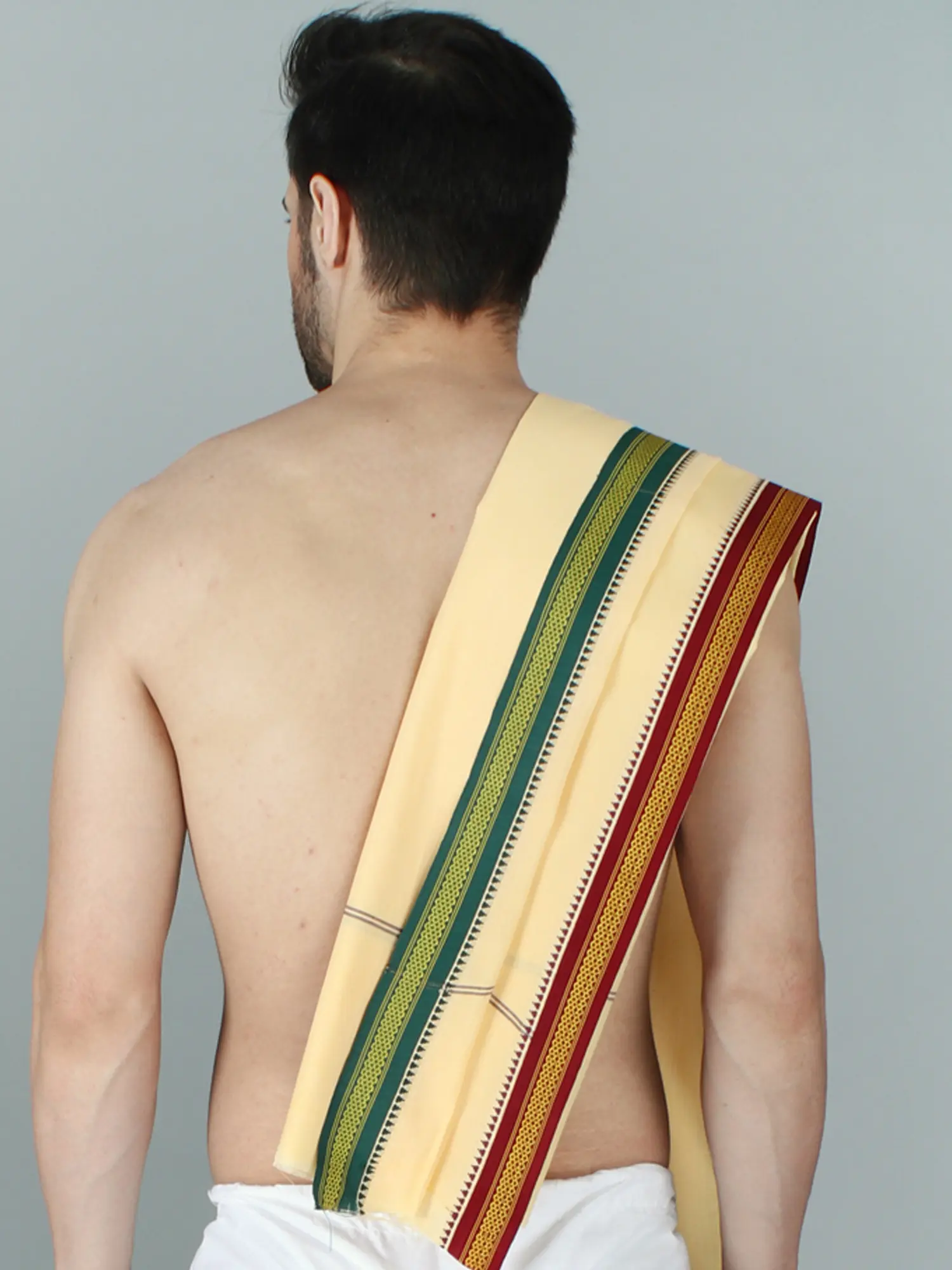 This pure cotton Angavastram in cream is the essence of simple but exquisite elegance. This cotton Uttari features a vibrant Ganga Jamuna border in orange and green. The bright-cream color exudes purity and refinement, while the beautifully woven border adds regal flair. The material is of the greatest grade. Carrying it on the shoulders or wrapping it around the body, the delicate and soft fabric is really useful in both circumstances. The overall appearance of the clothing is incredibly exquisite, making it a wonderful choice for traditional situations.