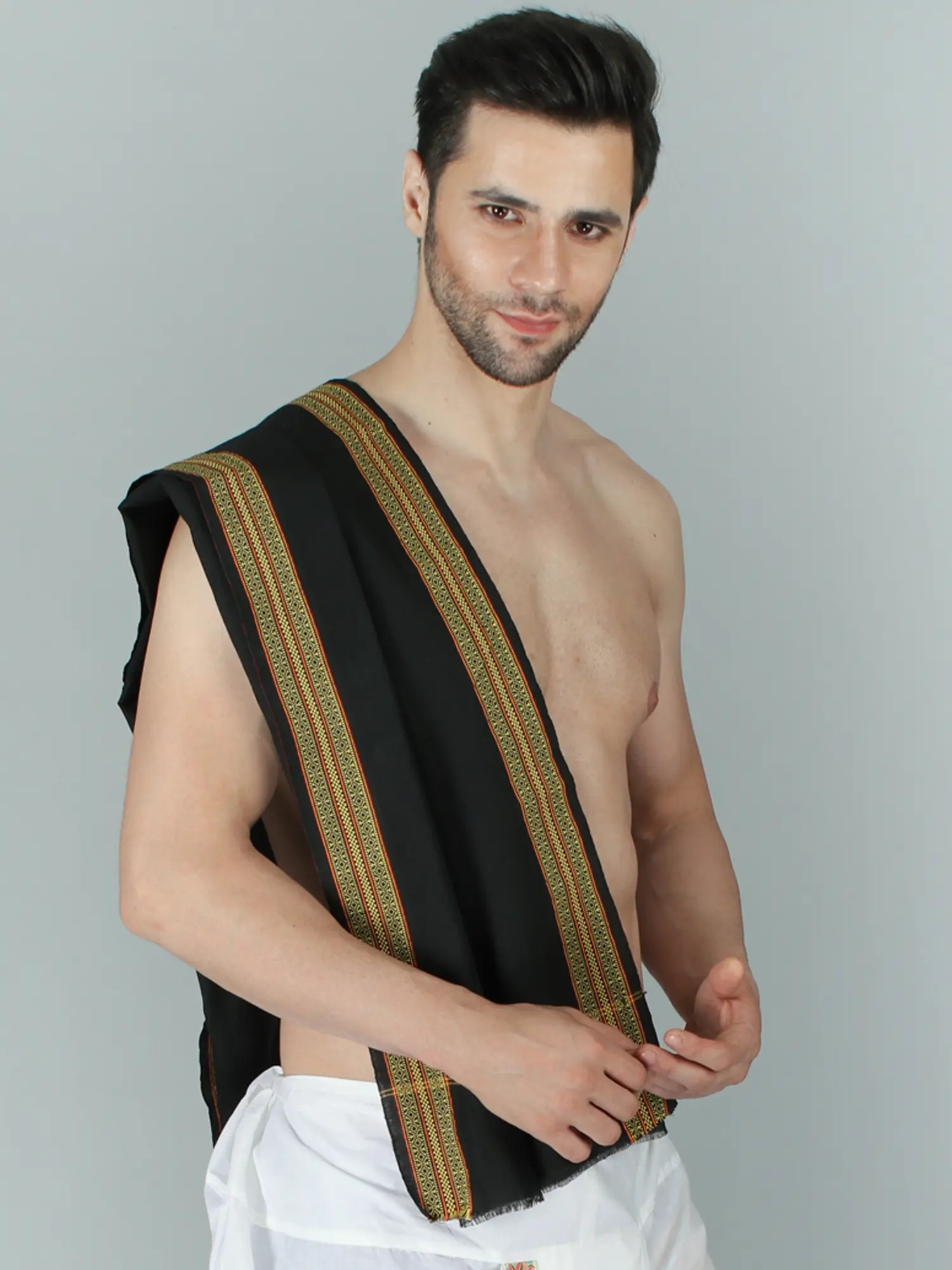 Discover the perfect blend of classic elegance and refined craftsmanship with this exquisite angavastram. Designed for the discerning individual, it offers a sophisticated touch to any traditional ensemble. The rich black fabric serves as a canvas for the stunning Zari woven border, creating a striking visual appeal that commands attention. This angavastram is more than just an accessory; it's a statement of cultural pride and timeless style.