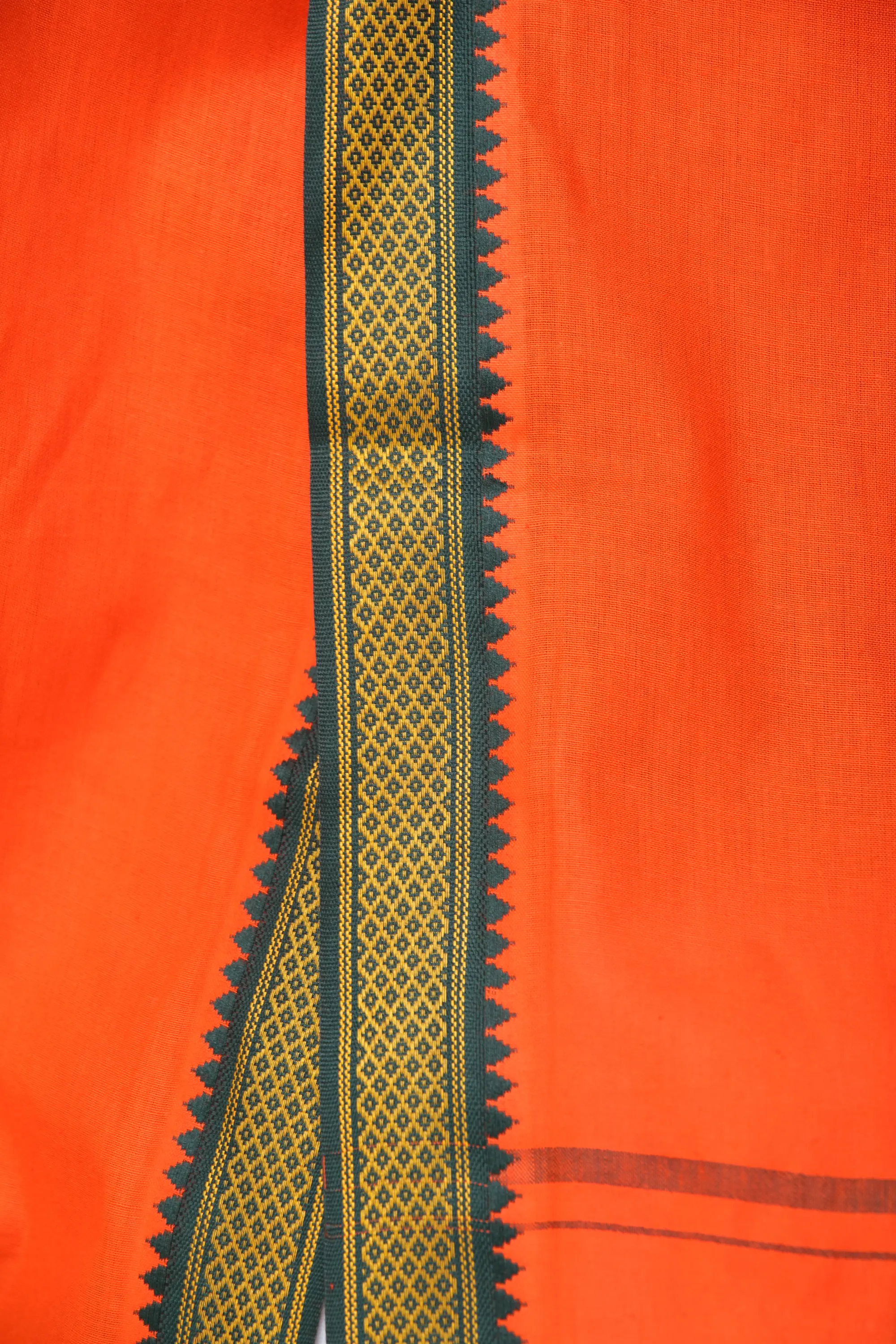 cotton Uttari features a vibrant Ganga Jamuna border in orange and green. The