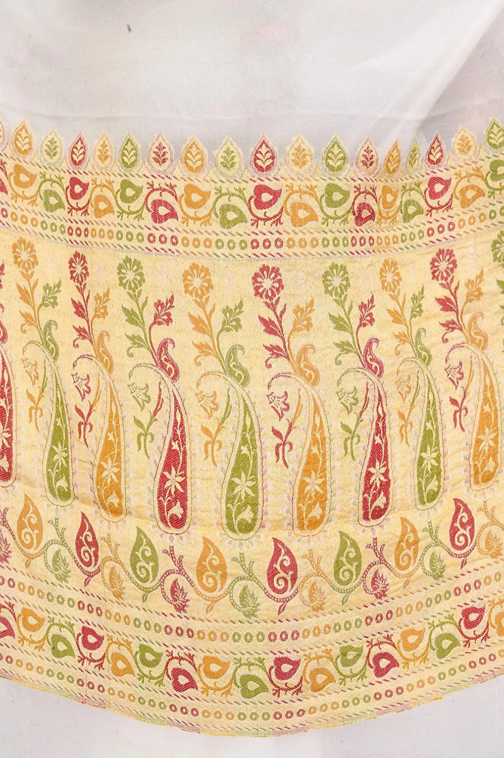 This snow white Banarasi saree is distinctive and individually crafted to give a captivating look to your personality. Be it any type of gathering, you will find all eyes turning upon you. This plain Banarasi sari has a Meenakari border of green and red coloured paisley motifs which scale up as it infiltrates into the pallu. Made up of chiffon material it is very trendy and comfortable wear for all occasions.