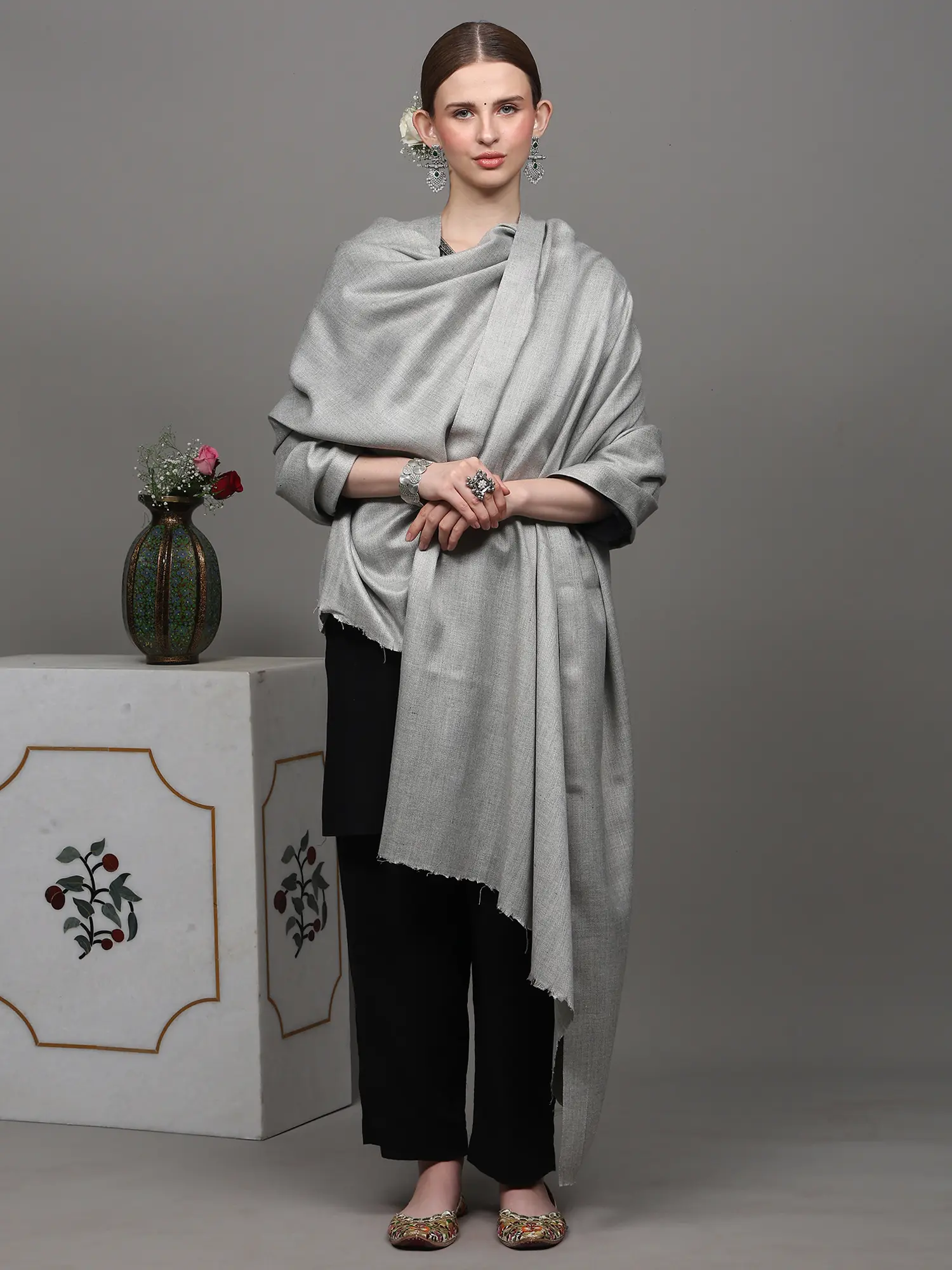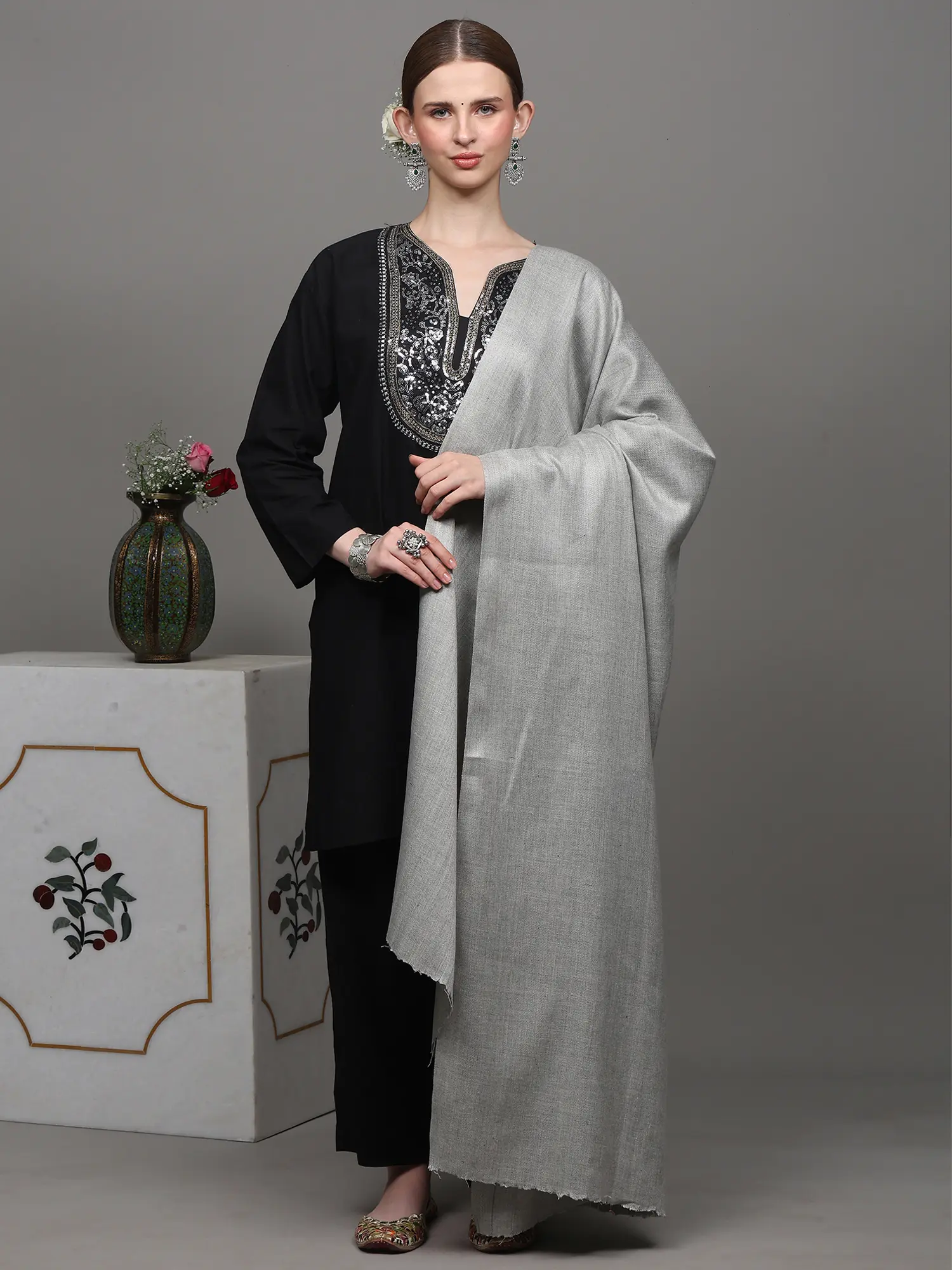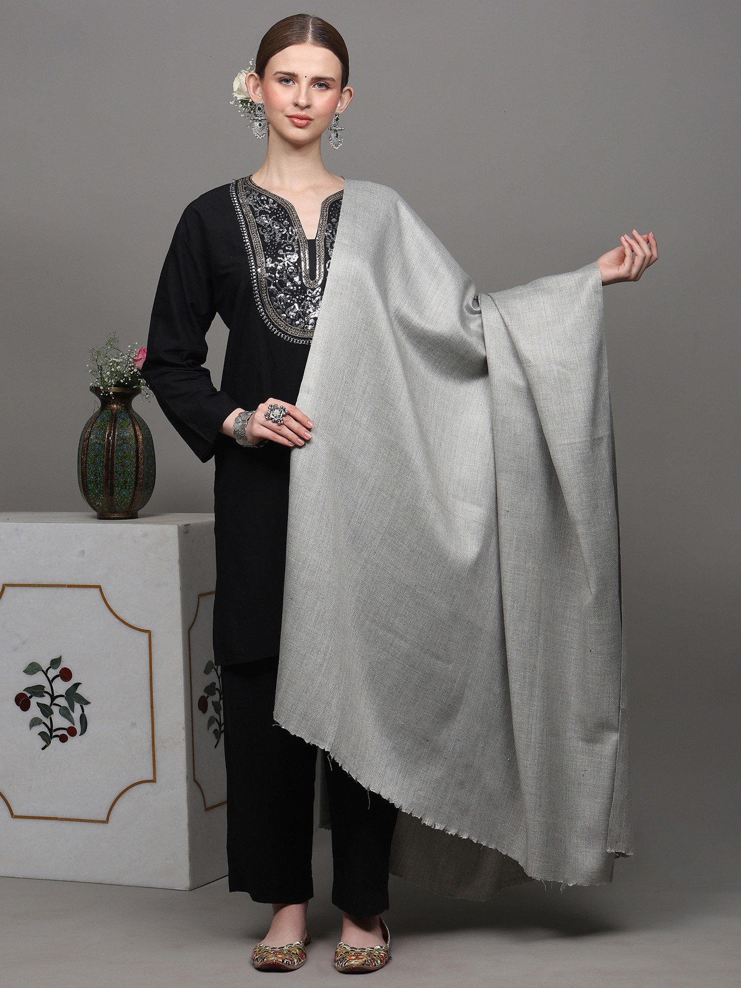 Earlier, Kashmiri textiles had simple designs which paced up with today’s fashion resulting in the most beautiful and intricate designs you will come across that showcase the unmatchable beauty of the heavenly land of Kashmir. The crafting of embroidery is done so uniquely well where the rich colors are put together looking like an absolute grace to the eyes. While there is a variety of ways in which a Kashmiri shawl is woven, one of which is Diamond weave also known as Chashm e Bulbul. Being the derivative of twill weave, Diamond weave is a combination of right and left twill weave and is a reversible design. Being one of the most technical forms of weaving, the skilled craftsmen of Kashmir require patience and years of hard work to attain perfection in this type of weaving. The Cashmere (also known as Kashmiri) shawl presented before you has been made of pure wool and has been made available for you from Kashmir for its subtleness and gracefulness. It has been made through diamond weaving which makes it the most precious and valued piece of accessory which you will find exclusively with Exotic India. Heavily embroidered Kashmiri shawls are also a great fit whereas if looking for a plain and subtle Kashmiri shawl to compliment your outfit, then this one is something you should certainly get your hands on. Give yourself the home-like feeling with the warmth and coziness of this graceful shawl.