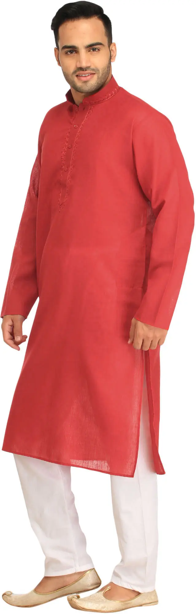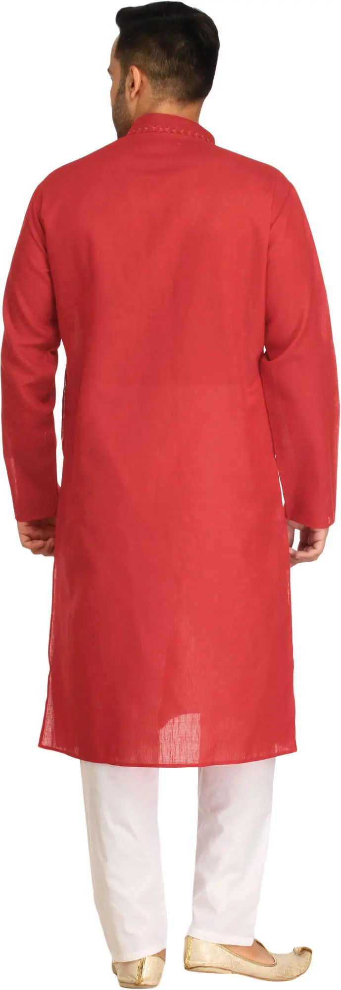 The kurta features a classic design with a comfortable round neck and a placket adorned with delicate thread embroidery. This intricate detailing around the neckline adds a touch of sophistication without being overpowering, elevating the garment from simple to subtly luxurious. The rich, warm hue of the kurta provides a versatile base that pairs effortlessly with the classic white pajama bottoms. The relaxed fit of both pieces ensures freedom of movement, allowing you to go about your day with ease. ––––––––––––––––––