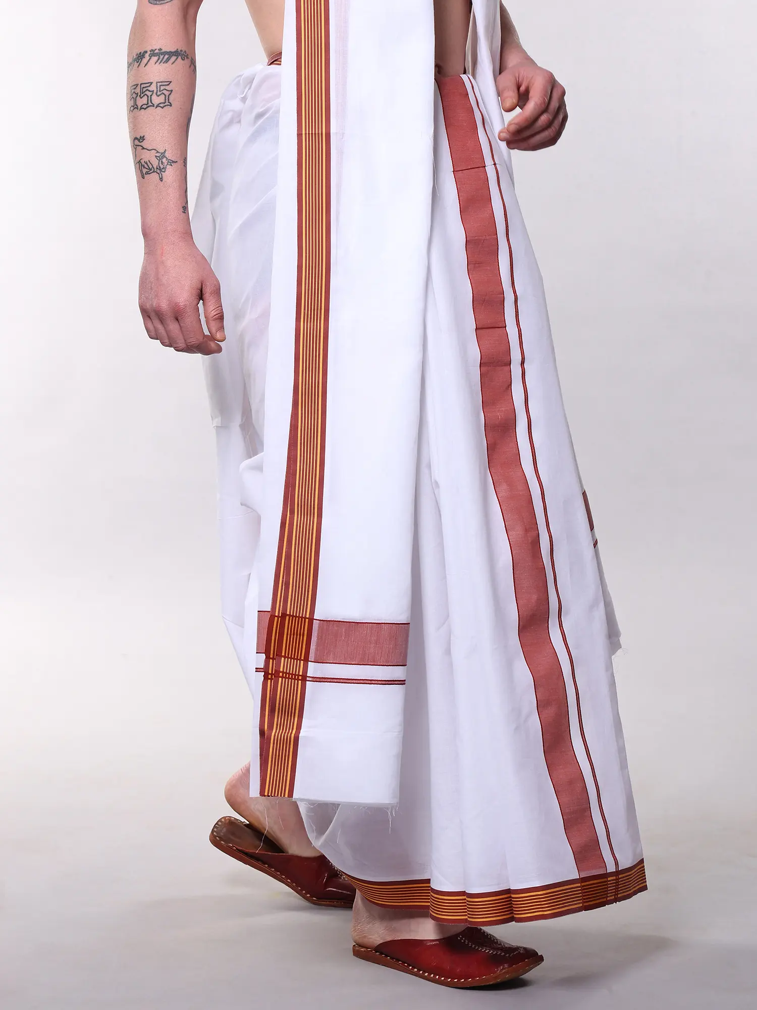 Bright-White Cotton Dhoti with Striped Border