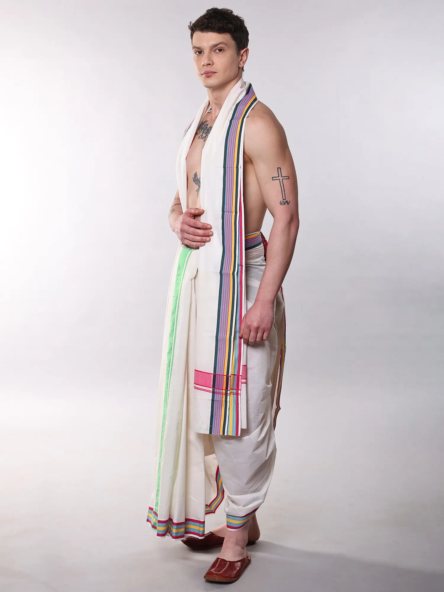 What truly sets this set apart is the striking multi-colored striped border. The dhoti features a bold and eye-catching border with vibrant stripes, adding a contemporary flair to its traditional silhouette. Complementing the dhoti, the angavastram is adorned with a similar, yet subtly distinct, striped pattern, creating a harmonious and sophisticated look. The interplay of colors on the white cotton base offers a visual delight, making this set a true statement piece. The meticulous craftsmanship of the borders showcases attention to detail, ensuring a refined finish that elevates the overall aesthetic.