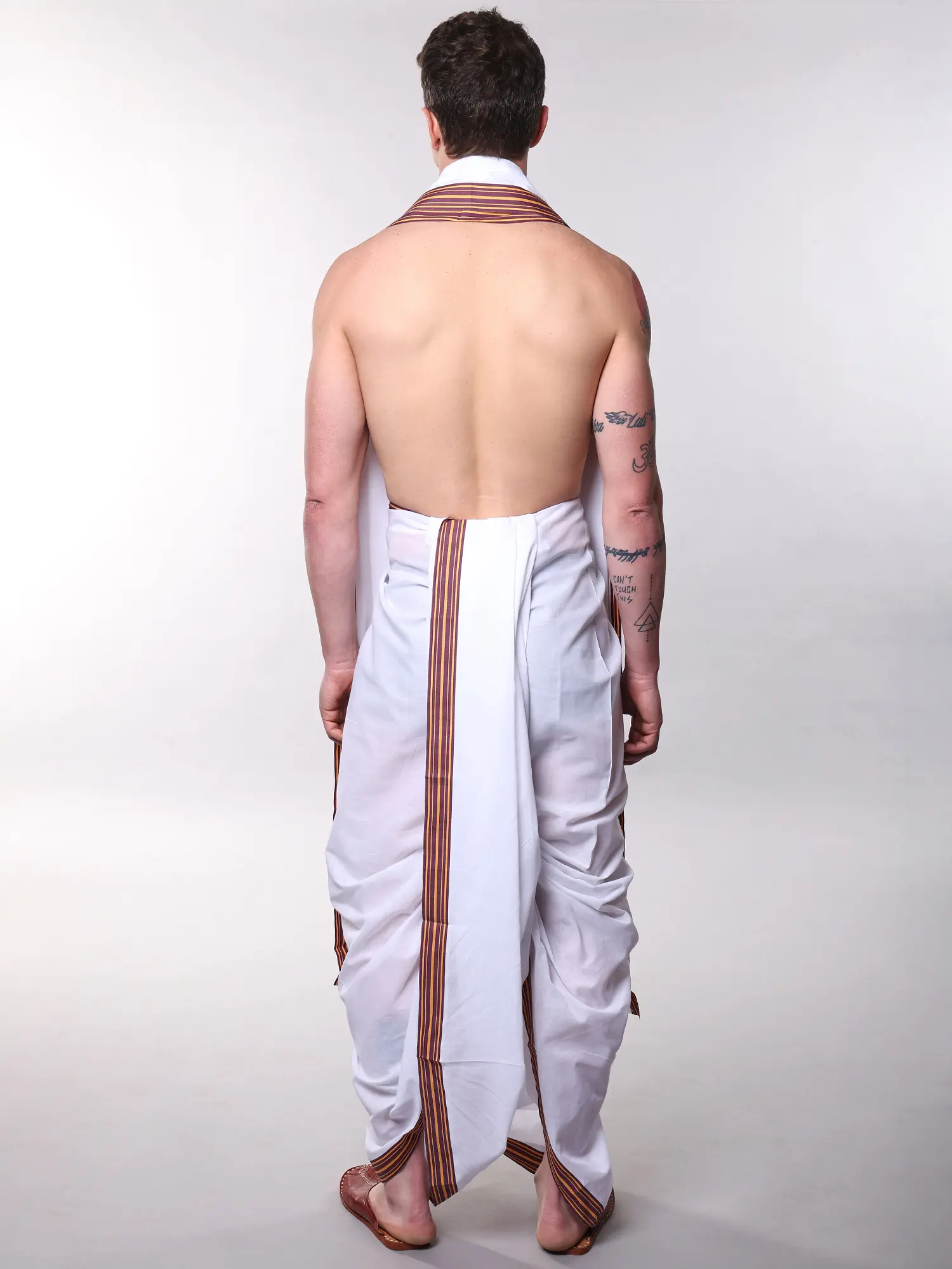 This dhoti and angavastram set is more than just traditional clothing; it's a symbol of cultural heritage and refined taste. The dhoti, when draped correctly, exudes grace and dignity. The accompanying angavastram, worn over the shoulders, adds an extra layer of sophistication and completes the traditional look. Whether you are participating in a puja, attending a wedding, or simply wish to connect with your cultural roots, this set offers a comfortable and stylish way to do so. Its versatility makes it a valuable addition to any wardrobe, offering a blend of tradition and modern appeal.