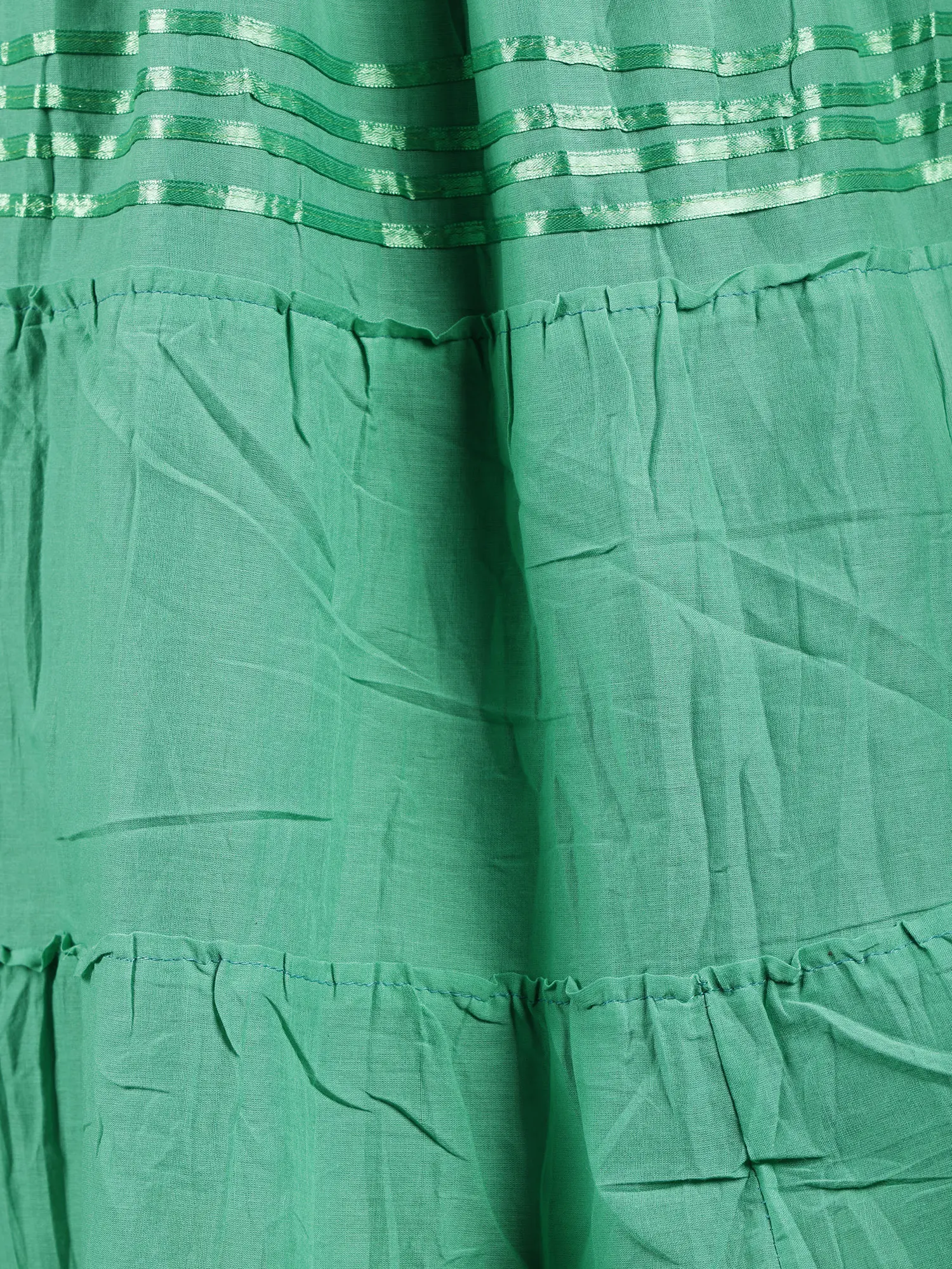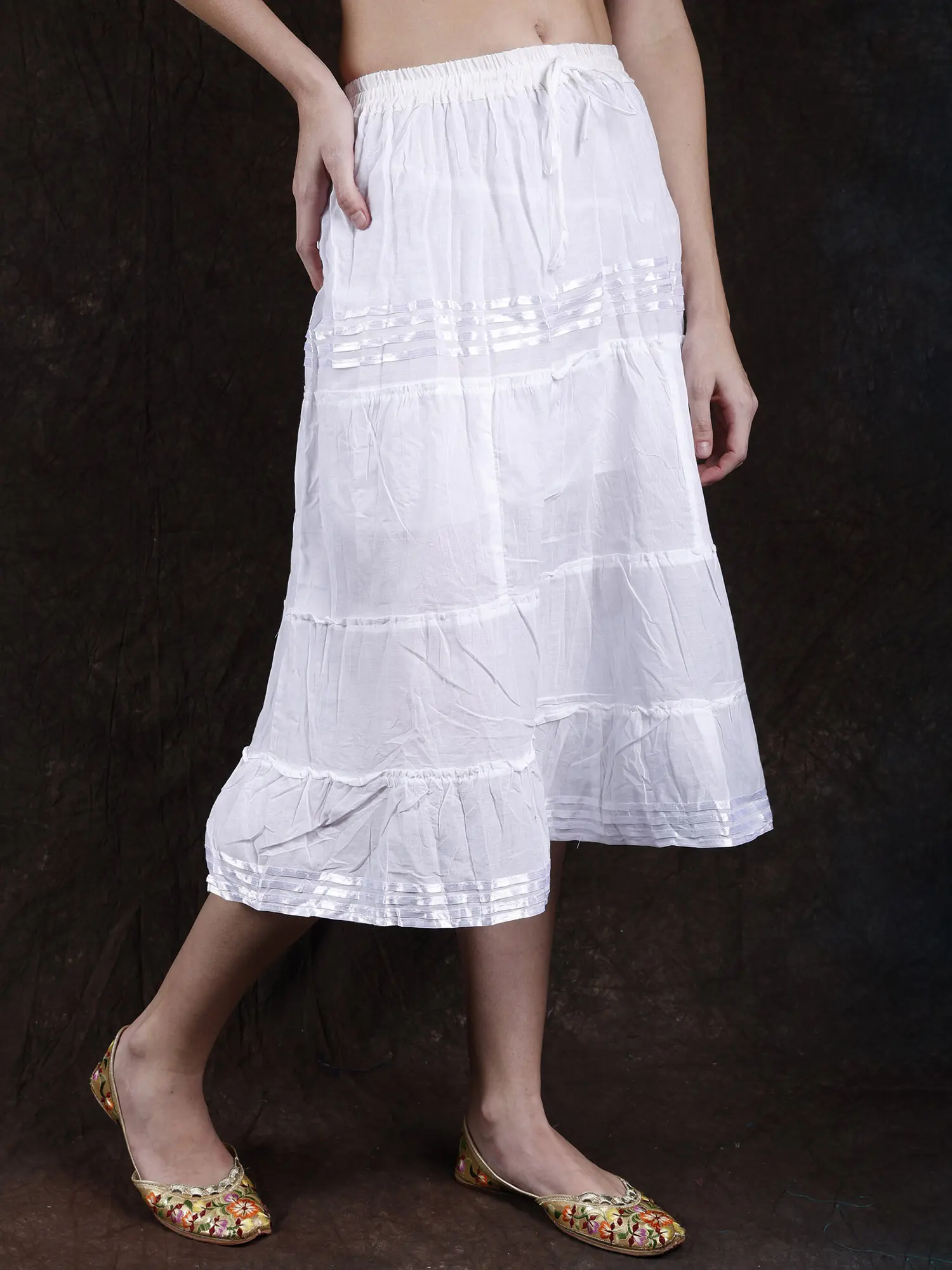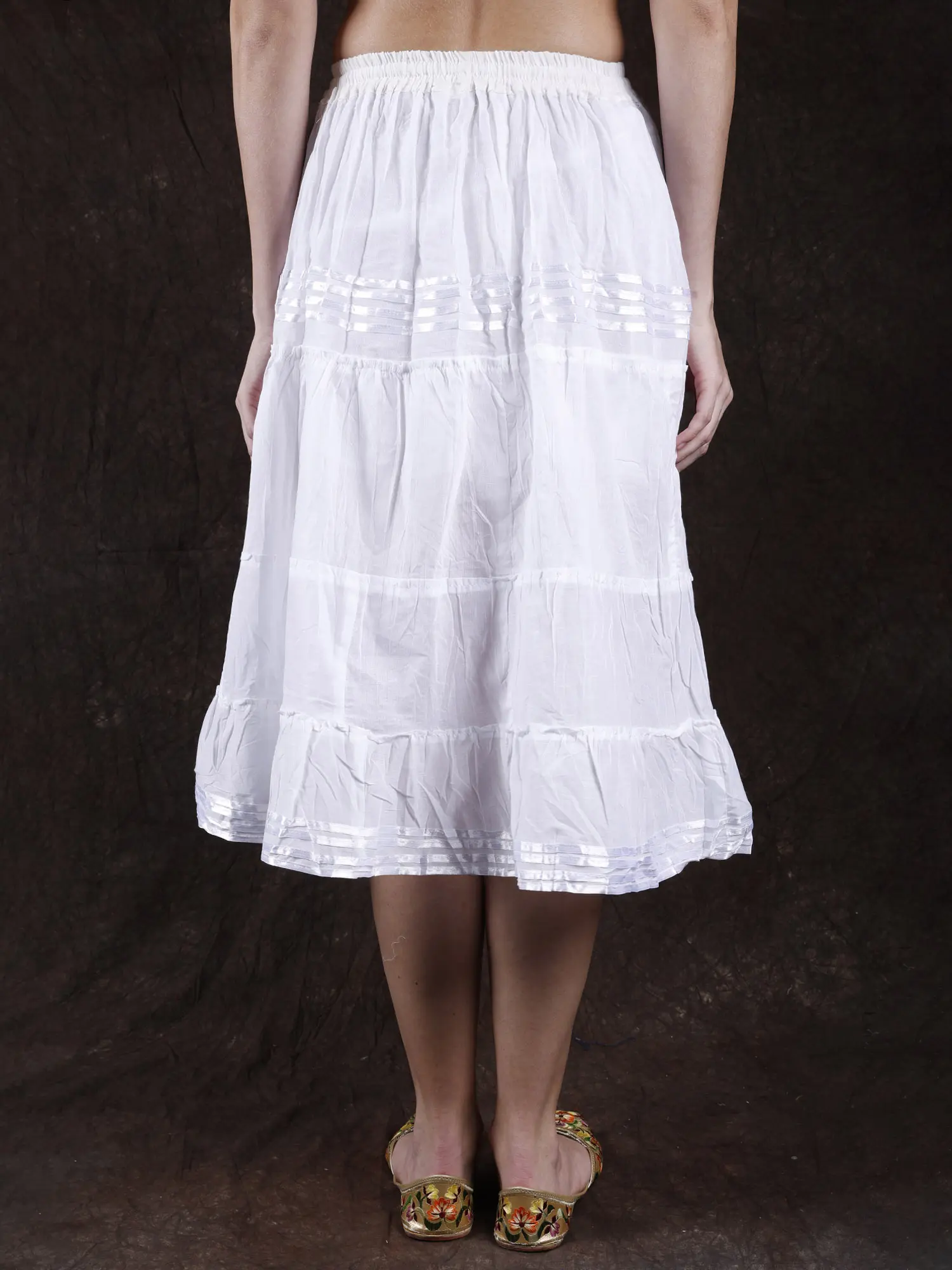 A plain cotton skirt is all you need to create classic looks that no one can forget. This elastic midi skirt, crafted with comfy cotton is decorated with a minimal lace element on the length, that matches the color of the fabric while adding a layer of beauty to the look.