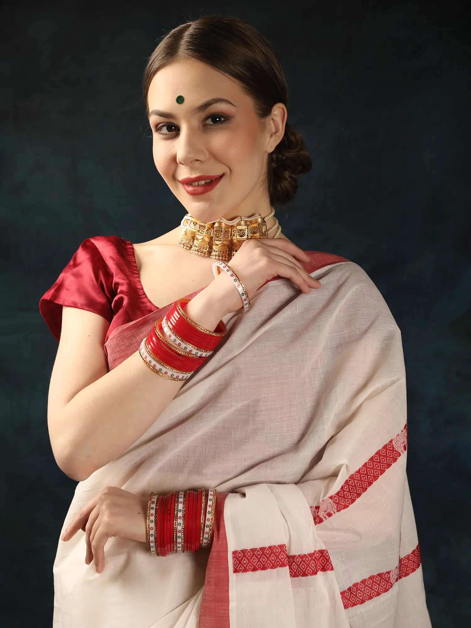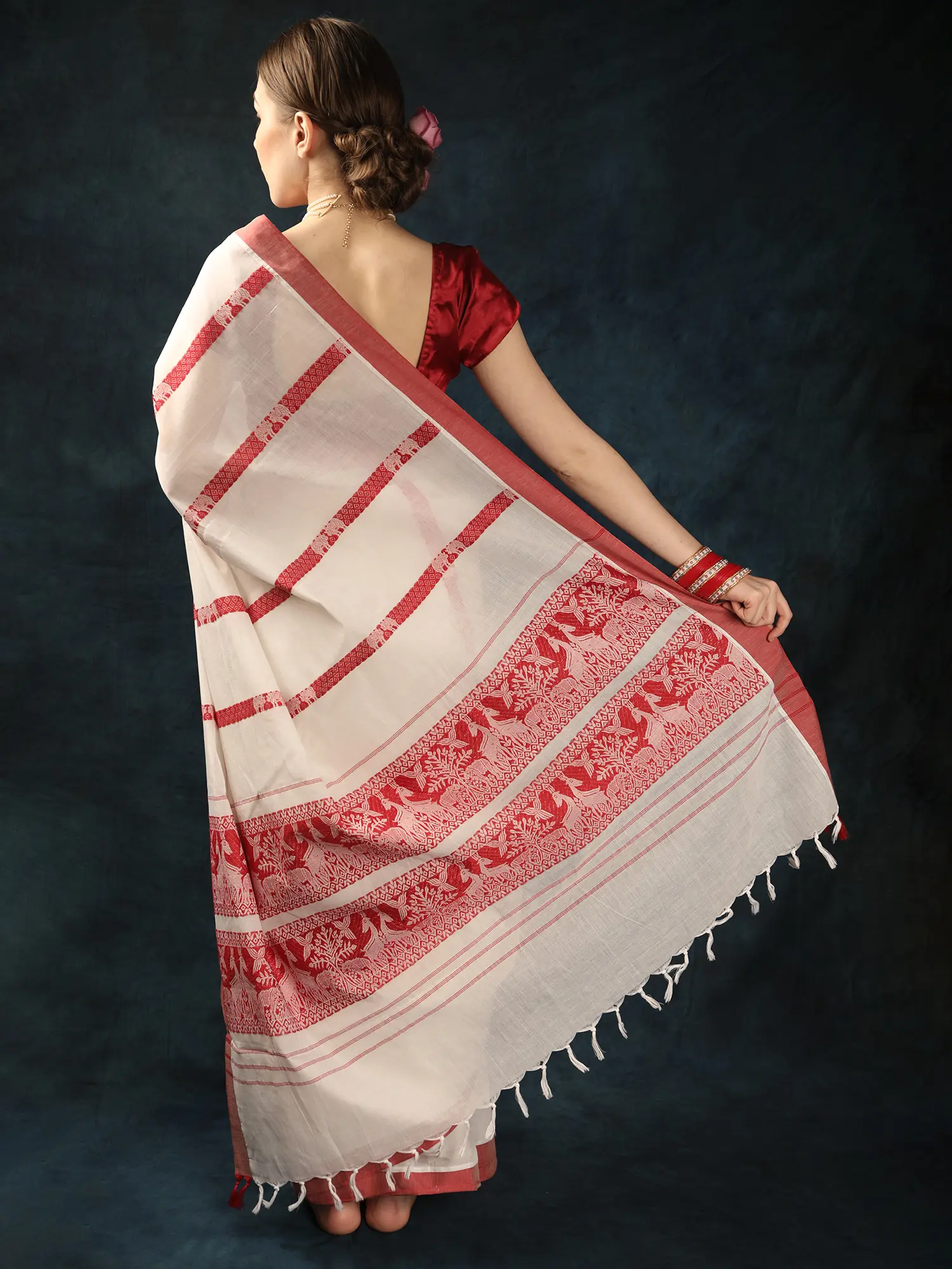 With this stunning Assamese handloom saree, you may immerse yourself in the fantasy realm of the region. It is a finely woven piece made of pure cotton that captures the essence of Assam's rich legacy. The mesmerising Jungle Scene on its Anchal, which captures the natural splendour of Assam’s rich surroundings, is what distinguishes it.